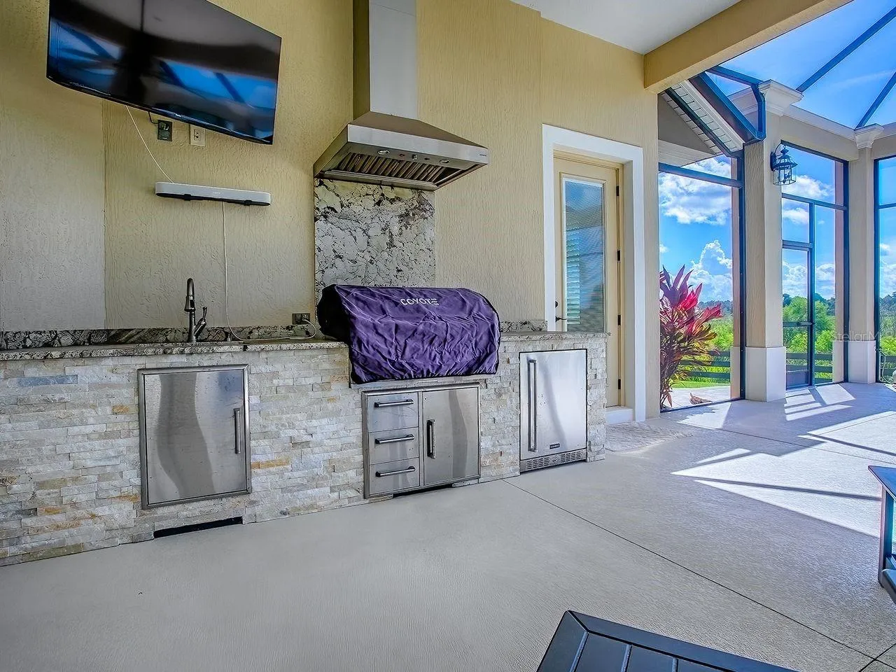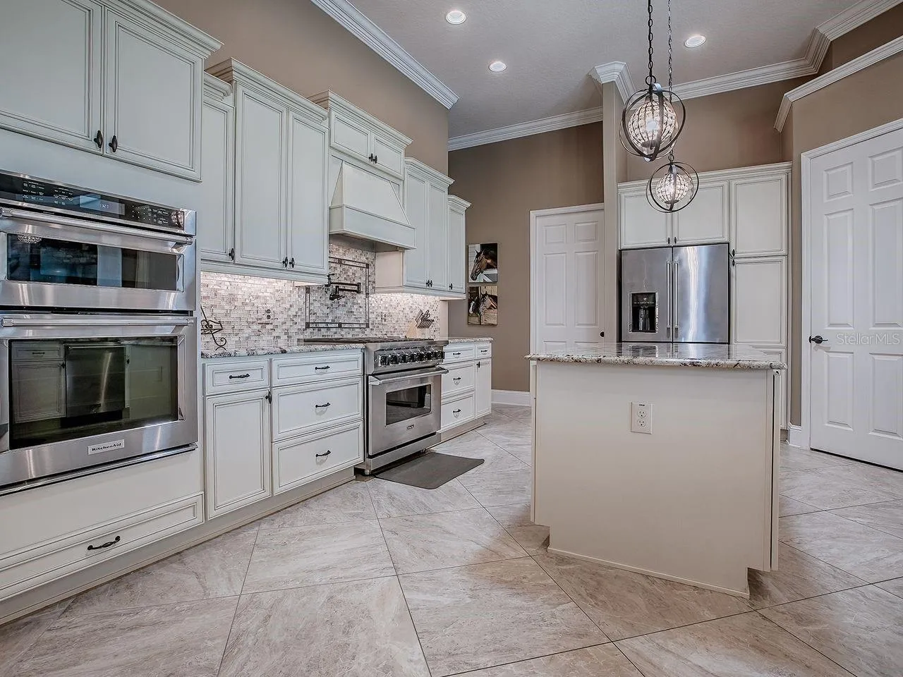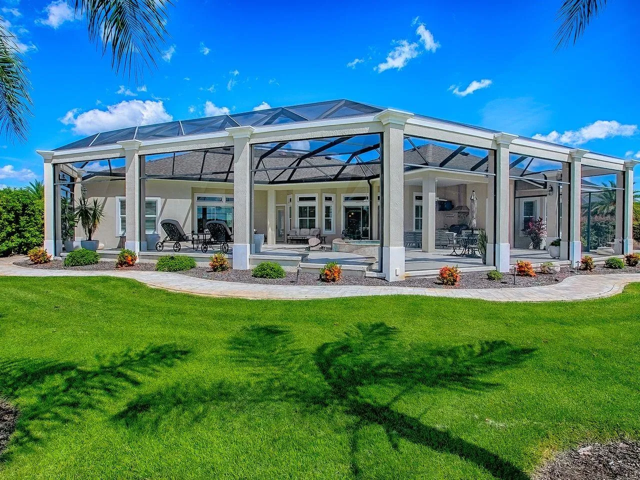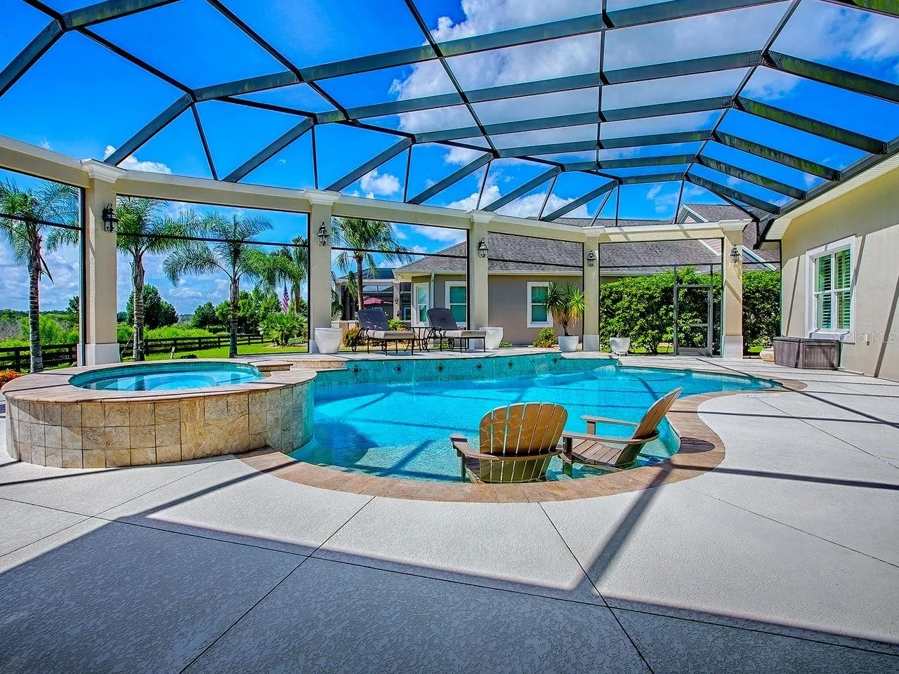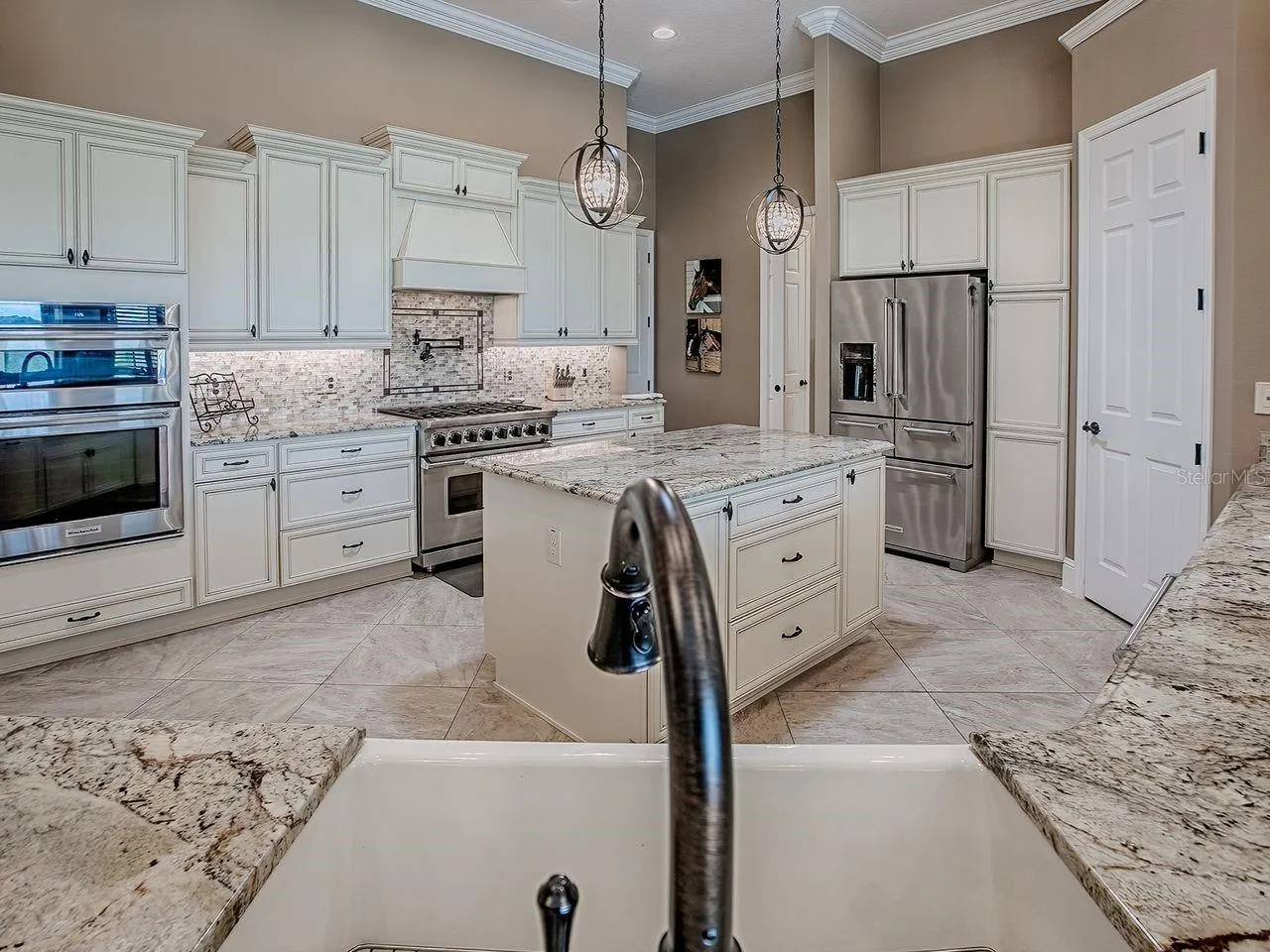 Discover luxurious Florida living in this stunning Grandview-4 model nestled in the coveted Preserve at Pine Hills in The Villages. This exquisite FOUR-bedroom, THREE-bathroom premier home offers a spacious open layout with elegant GRANITE countertops, CROWN MOLDING, PLANTATION SHUTTERS, and tile flooring throughout — NO CARPET for easy maintenance and timeless style. The master suite is a private retreat with two large walk-in closets, a luxurious bathroom featuring a Roman shower and double vanities, a gorgeous view of the preserve, and direct walk-out access to the lanai — perfect for enjoying peaceful mornings and sunsets. Bedroom 3 also features direct access to the lanai, providing guests or family members with easy outdoor living. The gourmet kitchen is beautifully appointed with a large island, GAS RANGE, POT FILLER over the range, Apron Sink, under-cabinet lighting, and a convenient closet pantry for extra storage. The fourth bedroom is currently used as a comfortable home office, adding flexibility for work or guests. The three bathrooms, including one conveniently accessible from the pool area, make entertaining and everyday living effortless. Relax and gather in the grand family room featuring a cozy electric FIREPLACE, or handle daily tasks in the large laundry room complete with granite countertops and custom cabinetry. Outside, enjoy elegant landscaping, a large POOL AND SPA, expansive birdcage enclosure, and a fully equipped OUTDOOR KITCHEN, all complemented by stone walkways that surround the property, and a beautiful stone patio perfectly positioned to overlook breathtaking views of the preserve and tranquil water. Practical touches like the full extended THREE-CAR GARAGE with an epoxy-coated floor, Pegasus Water Filtration System, built-in cabinets, and ample room for three cars and two golf carts, plus remote-controlled screens on both garage doors and the front porch, add extra comfort and convenience. Best of all, the BOND has been PAID, providing peace of mind and added value. Perfectly situated equidistant between Sumter Landing Square and Brownwood Paddock Square, just minutes from shopping at Colony Plaza and the neighborhood Walmart, and close to Belle Glade Country Club, Atlas Dog Park, and only three and a half miles to US-441, providing easy access to restaurants, shopping, and medical facilities — this exceptional home combines style, privacy, and an unbeatable location to enjoy the very best of Florida’s indoor-outdoor lifestyle. Call soon to appreciate this fabulous property in person!
