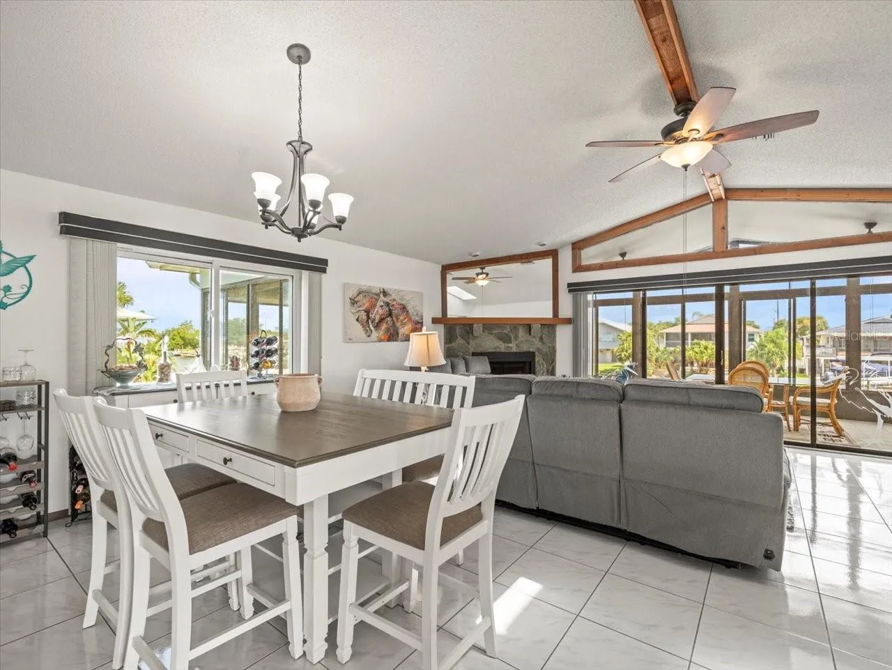 Step into an open, sunlit floor plan where friends and family can gather around the cozy wood-burning fireplace, or step onto the private balcony enclosed with screened-in windows — perfect for year-round entertaining while enjoying refreshing breezes and breathtaking sunsets over the canal.