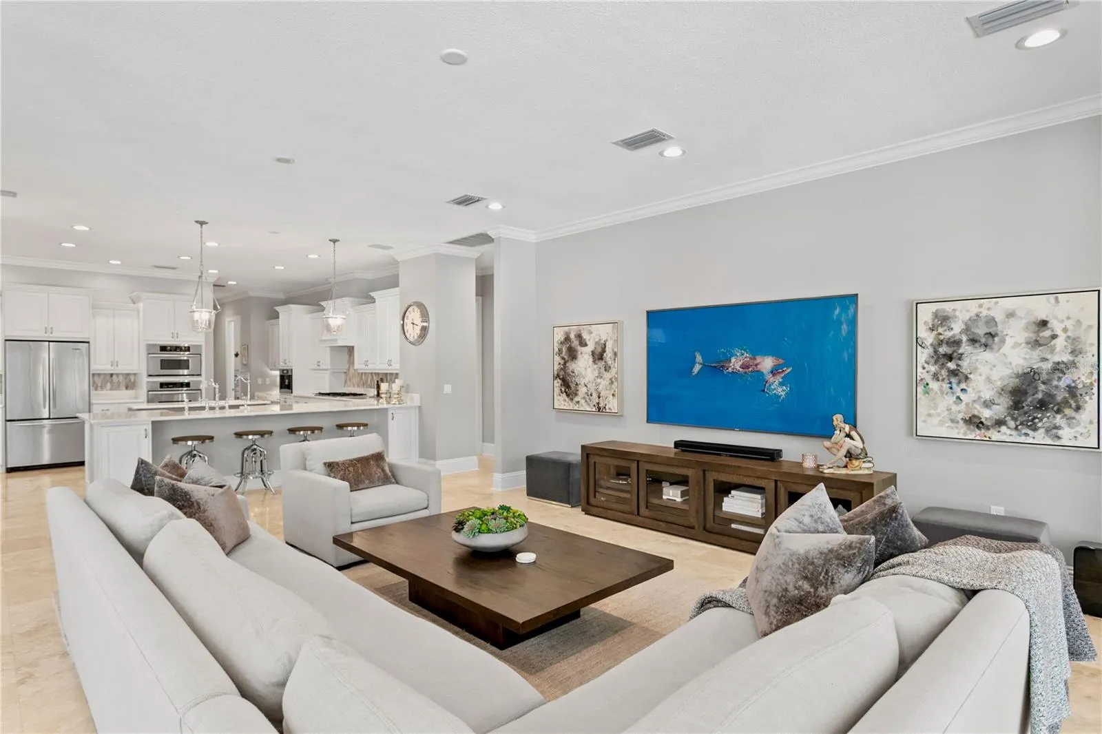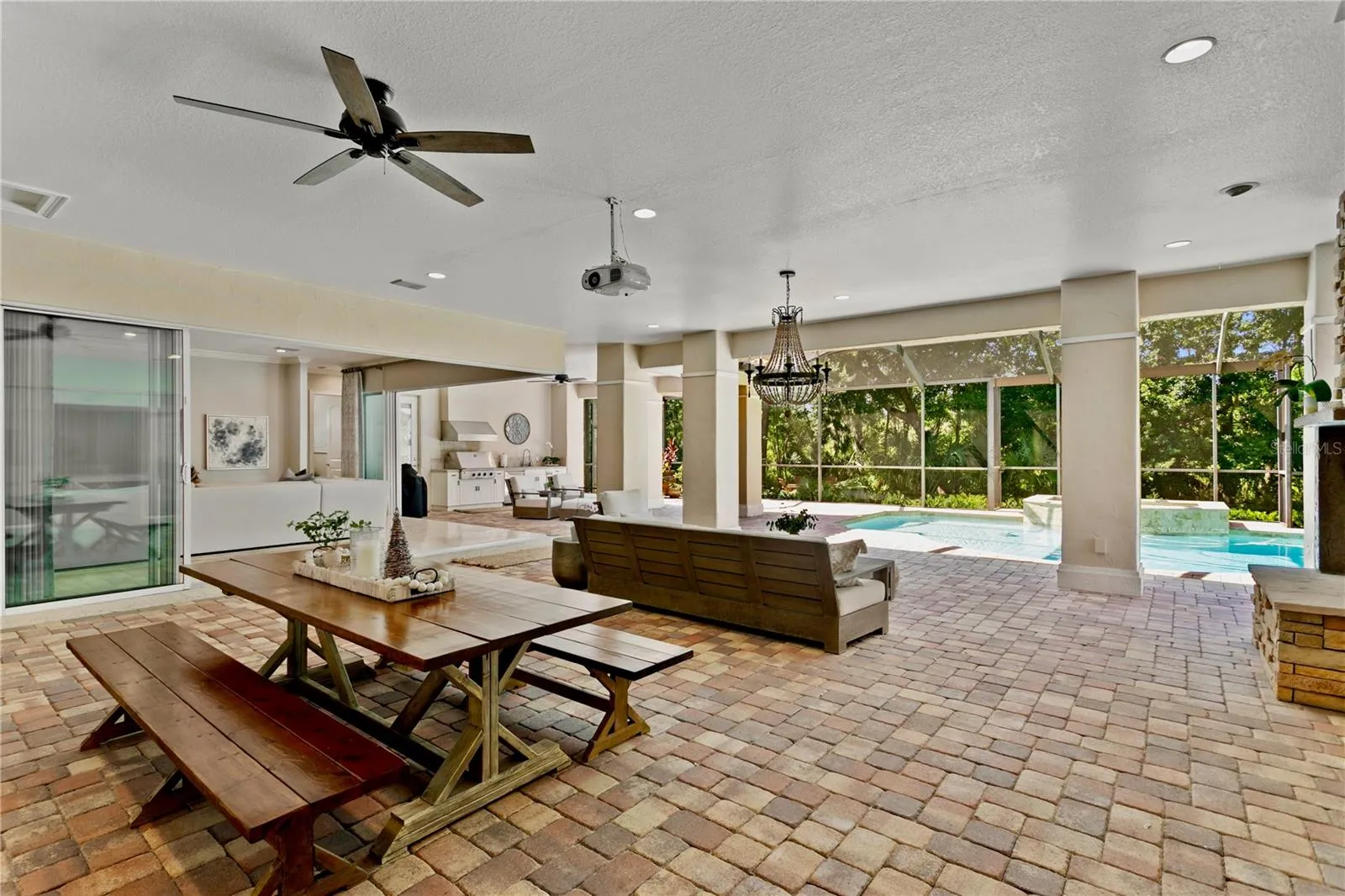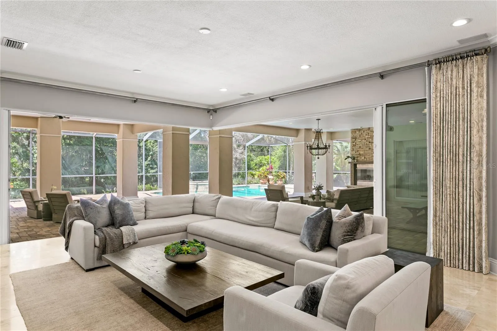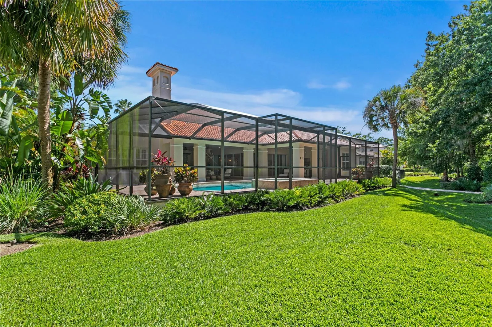 Welcome to this stunning one-story home in the gated community of Bella Vita. Custom designed with premium finishes and meticulous attention to detail, this 3,962 Sq Ft residence offers luxury living at its finest. Ideally located on a quiet cul-de-sac, the home features a beautiful conservation lot—providing privacy and a serene natural backdrop. From the moment you arrive, you’ll be impressed by the beautifully landscaped grounds, the brick paver driveway, and the classic clay tile roof that enhances the home’s elegant curb appeal. Inside, the spacious layout includes 4 bedrooms, 3.5 bathrooms, and thoughtfully designed living areas that flow seamlessly into an extraordinary outdoor living space. The open floor plan is basked in sunlight and features travertine floors, designer lighting, custom draperies, crown molding, plantation shutters all which enhance this gorgeous home. The gourmet kitchen features stainless steel appliances, a 5-burner gas range, a Miele built-in coffee machine, marble countertops, built-in desk, and a large kitchen island with seating for four – ideal for casual gatherings. The kitchen opens to the family room and the retractable sliding glass doors from the family room extends your living space. The luxurious primary suite is a private retreat, featuring a luxurious spa-style bathroom with his and her vanities with quartz countertops, designer mirrors and lighting, and a custom California closet. Three additional bedrooms are thoughtfully designed, each offering comfort, style, and plenty of room for family and guests. The outdoor living areas are truly extraordinary and feature a screened patio with a swimming pool, fireplace, outdoor kitchen, built in movie screen and an oversized patio. The backyard is complete with a private path that leads to an outdoor fire place that is the perfect spot to gather and entertain. This gated community is centrally located in Tampa & offers a wonderful lifestyle that is convenient to Carrollwood Day School, Avila & all major highways.