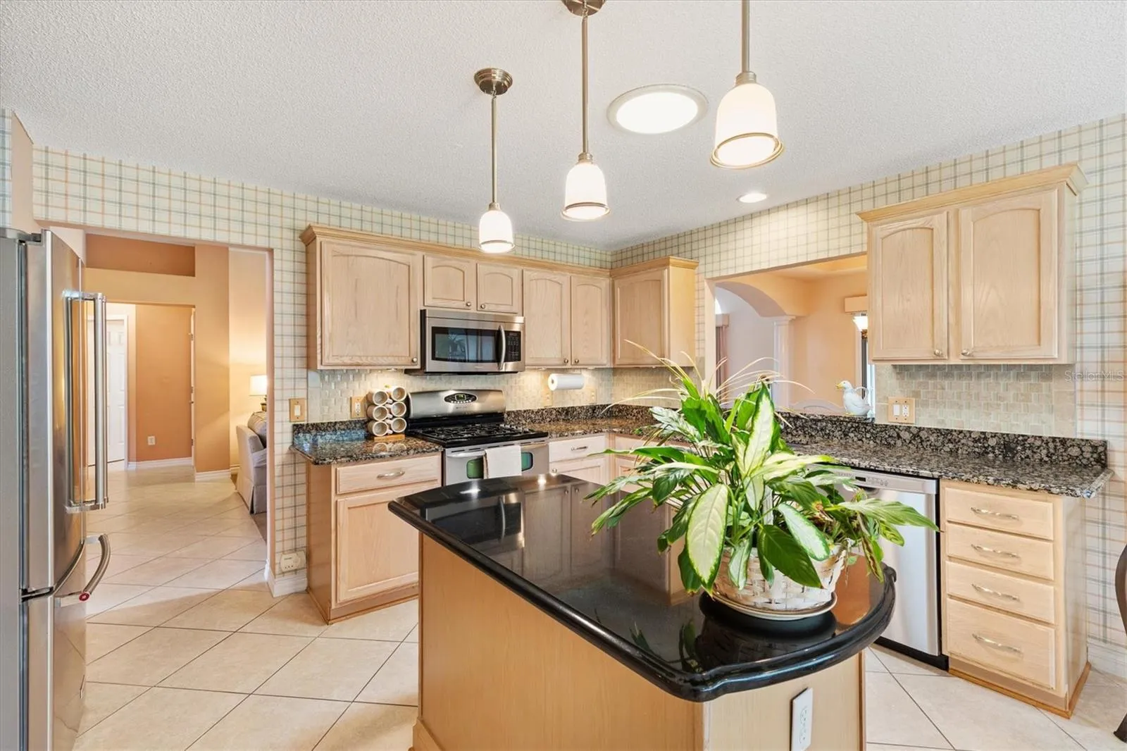 The kitchen features stainless steel appliances, gas range, pull-out shelves, a large pantry, solar tube, and a sunny breakfast nook for casual meals. Refrigerator is just 1 year old and dishwasher purchased 2016. Flooring includes tile in wet areas for easy maintenance.