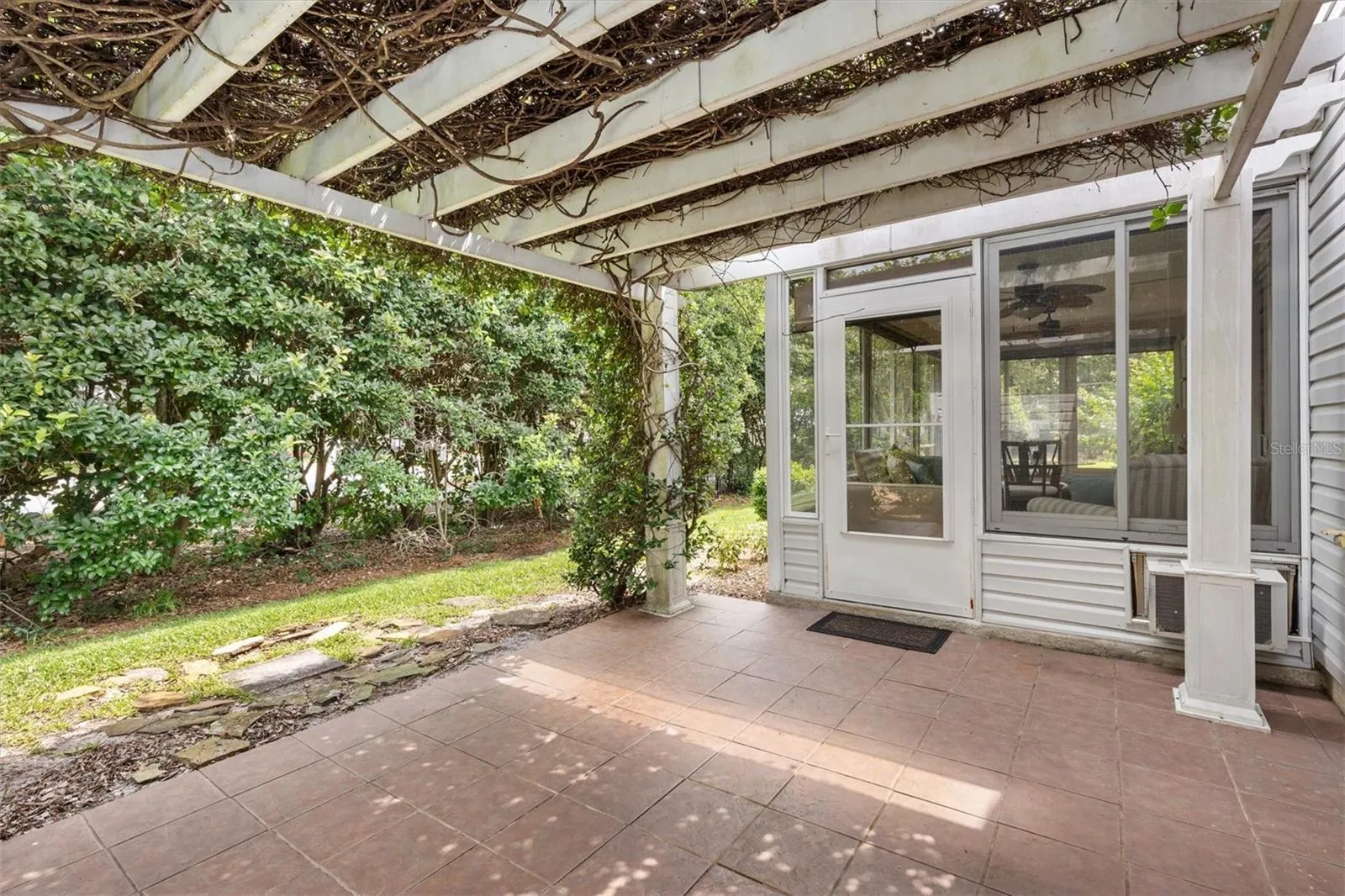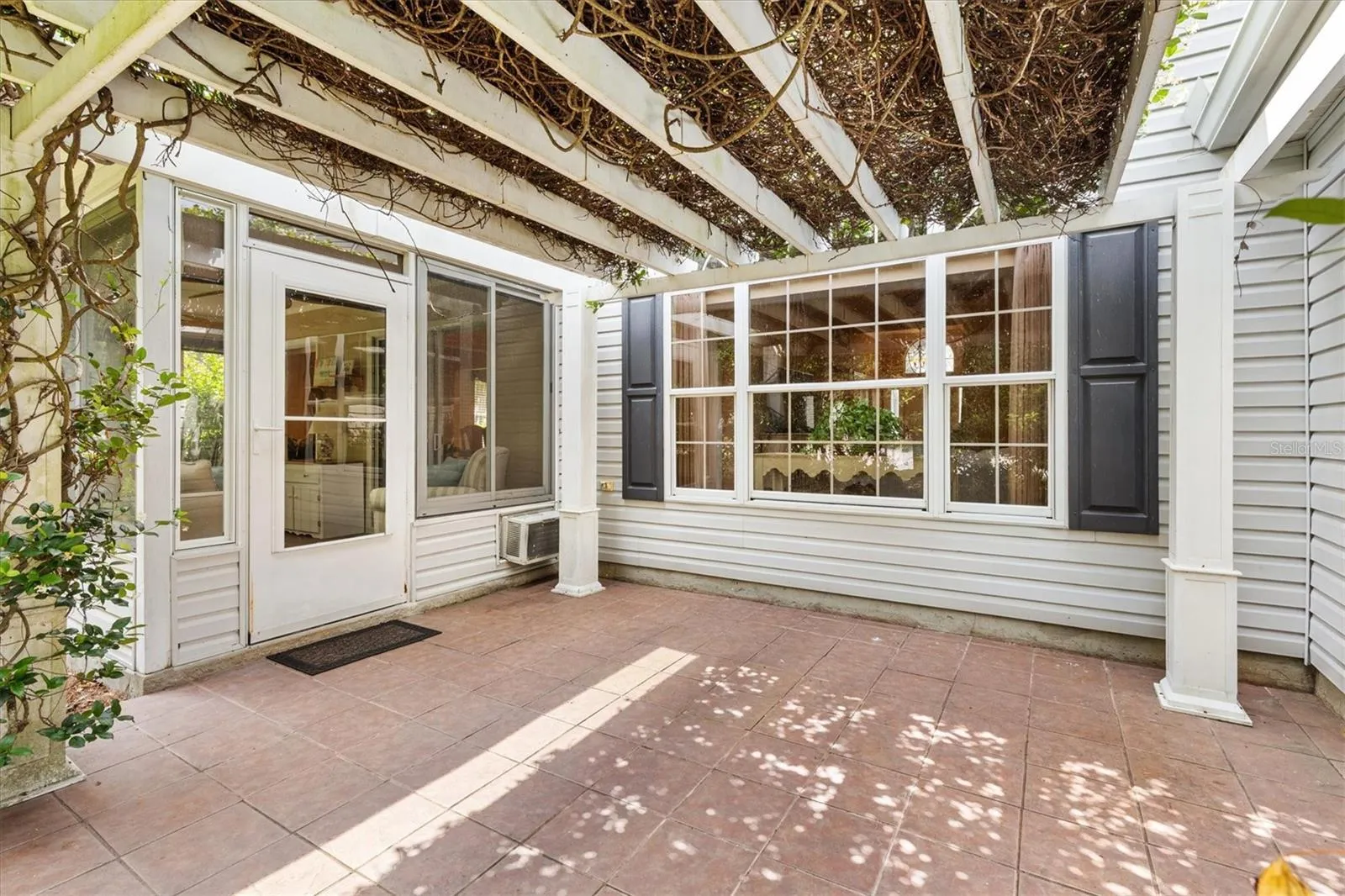 Relax year-round in the enclosed lanai or step outside to the outdoor patio with pergola. The backyard has a privacy hedge and Jasmine Gate, creating a serene backyard oasis.