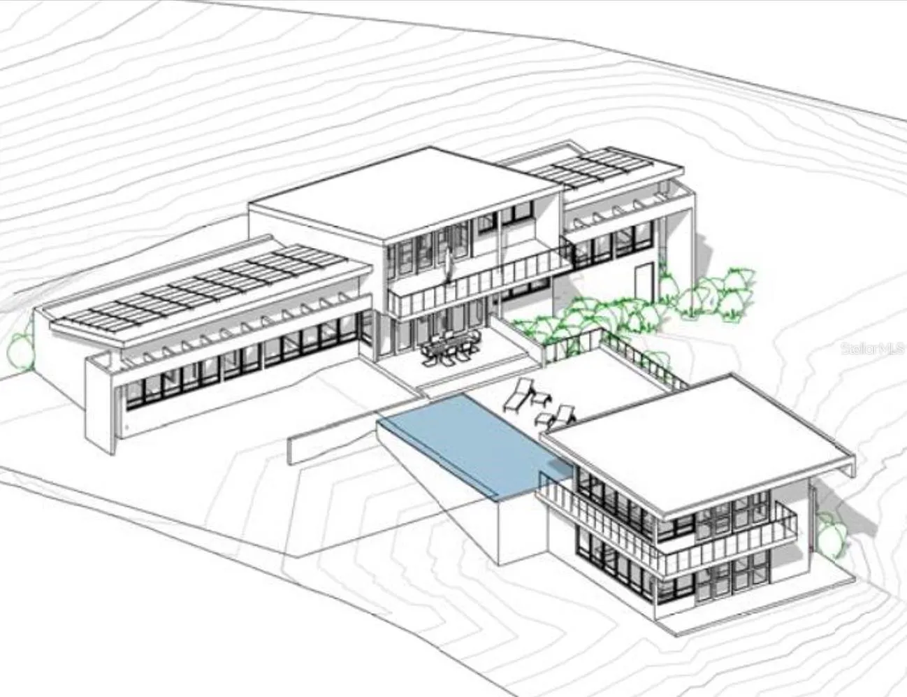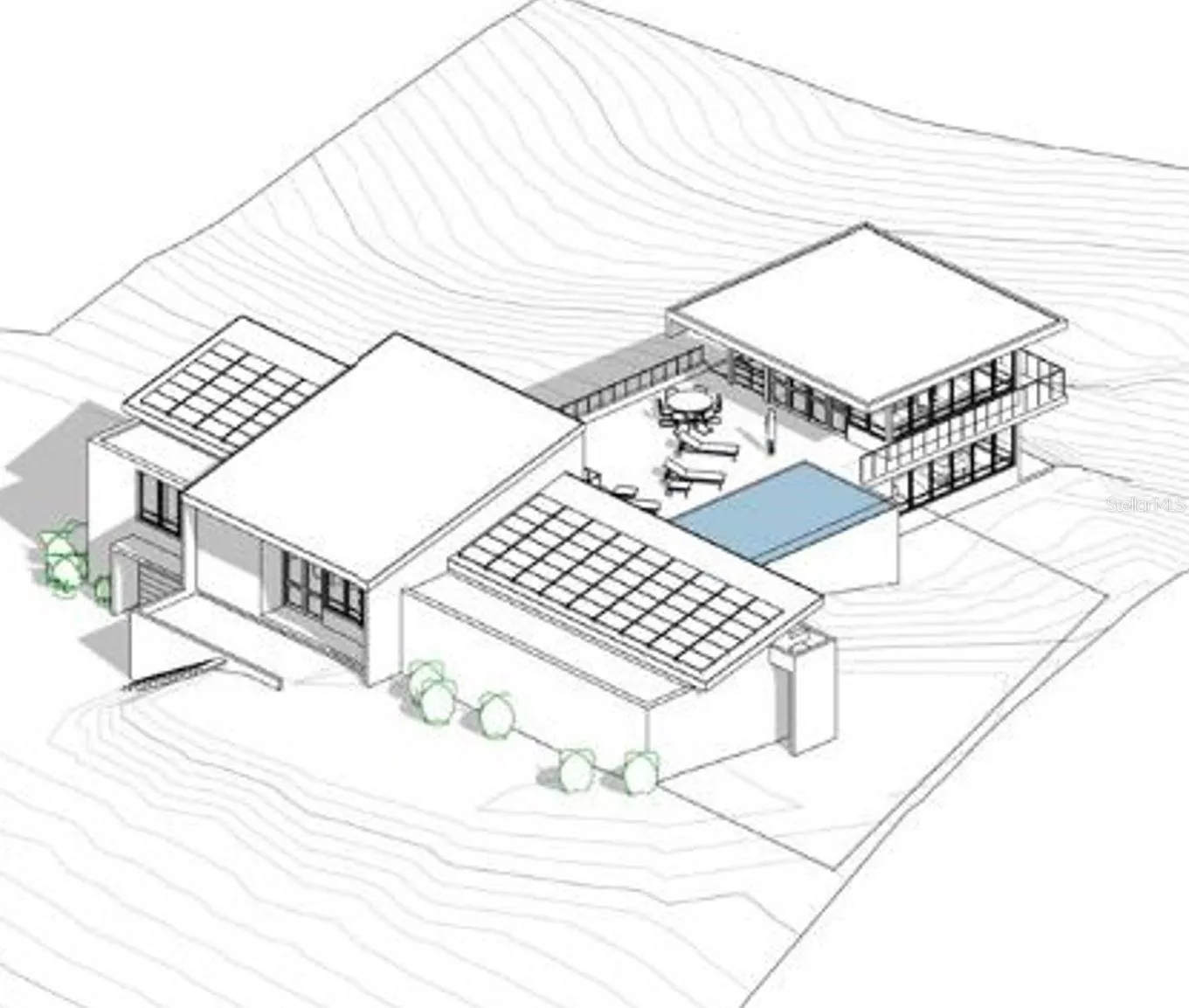 The house on the property is comprised of two buildings, a front building and a back building with a pool/pool deck between the buildings. Both buildings are 100% poured concrete construction including the roofs. There is no concrete block, wood, nor other construction materials utilized in the construction of the house. The front building has an open design kitchen/dining/living great room, an upstairs mezzanine with outdoor porch, a garage, a Primary Suite with en-suite bathroom, 2 guest bedrooms (bedrooms 2 and 3), and an additional bathroom shared by the two guest bedrooms. The back building is a three story building. The top two floors, the second and third floors, of the back building each have a bedroom with en suite bathroom. The first floor of the back building is fully plumbed and wired so could easily be made the 6th bedroom/5th bathroom of the house if desired. Under the pool deck is a storage room and the 16,500 gallon rain water cistern. The storage area has been wired with electrical upgrades such that it could be converted into and utlized as a workshop.