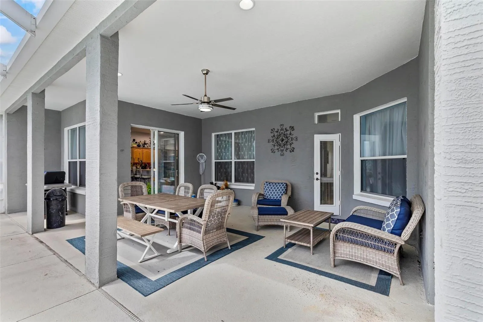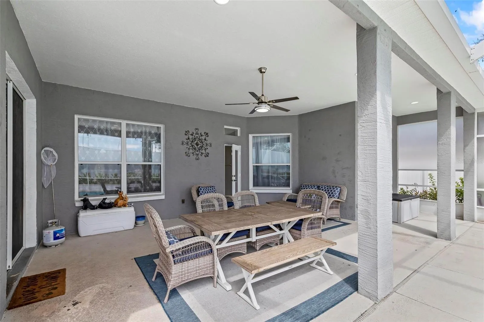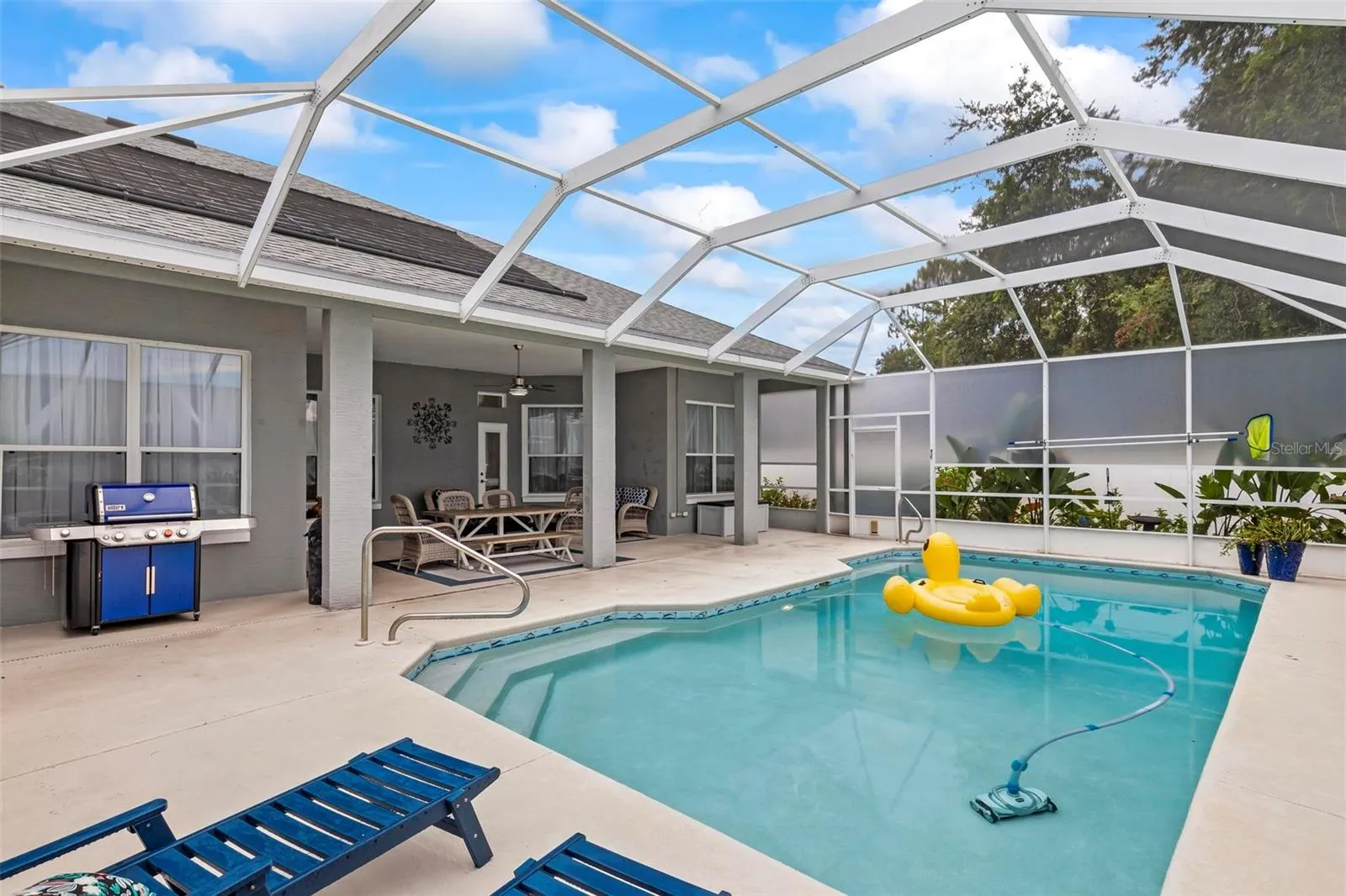 Enjoy an open split floor plan with two living areas, a formal dining room, and a spacious kitchen with island seating and plenty of cabinetry. A full bath opens to the screened, solar-heated saltwater pool, creating the perfect setup for entertaining or relaxing year-round.
