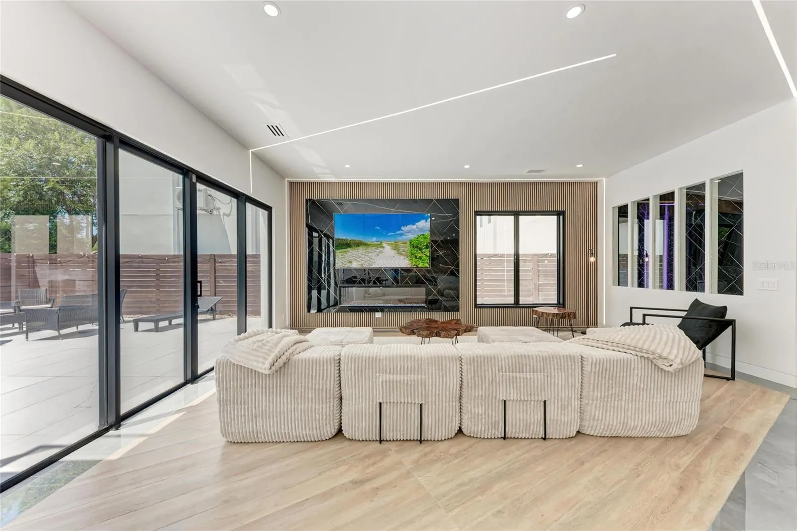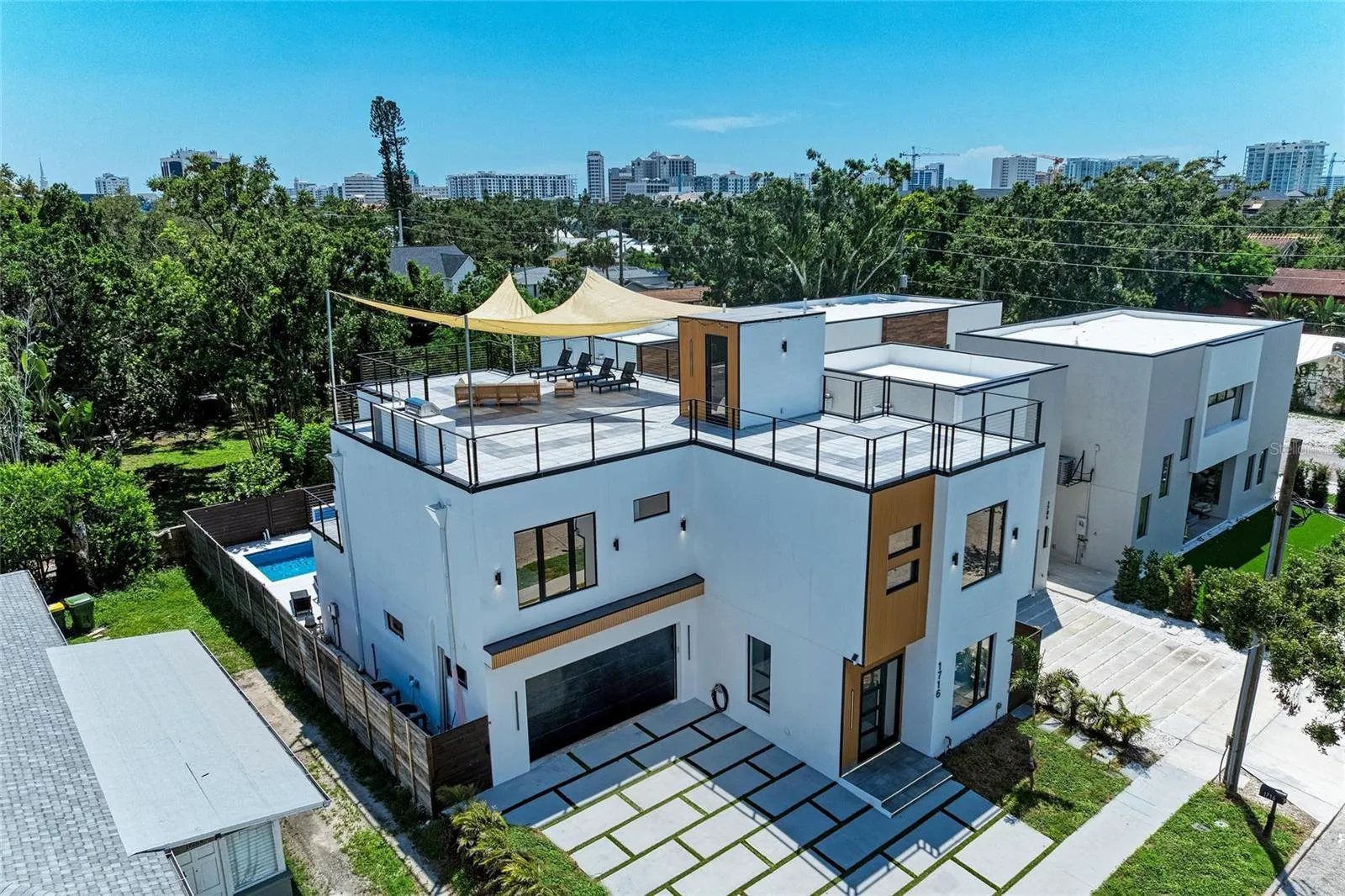 Outdoor living is elevated with a large covered patio space perfect for lounging or dining al fresco. The beautifully paved area overlooks a peaceful backyard and a refreshing pool with a waterfall feature, offering your own private oasis. Multiple access points throughout the home lead to terrace-style balconies, ideal for soaking in the Florida sunshine and views. As a bonus, the rooftop den provides an exclusive space to relax or entertain, complete with impressive cityscape views, the perfect spot for sunset cocktails or quiet mornings.
