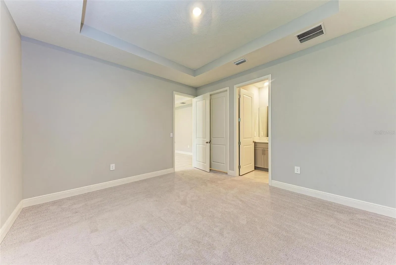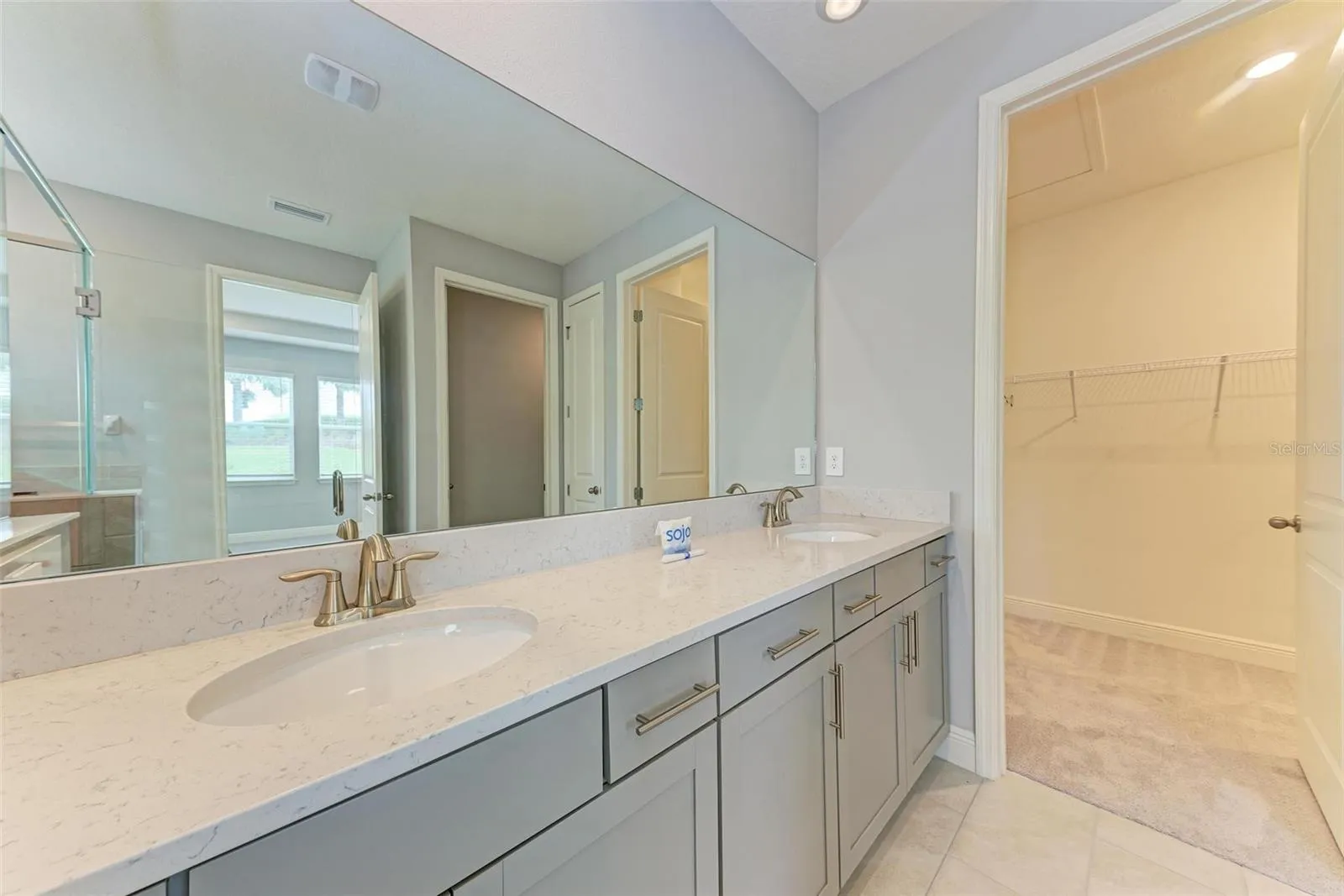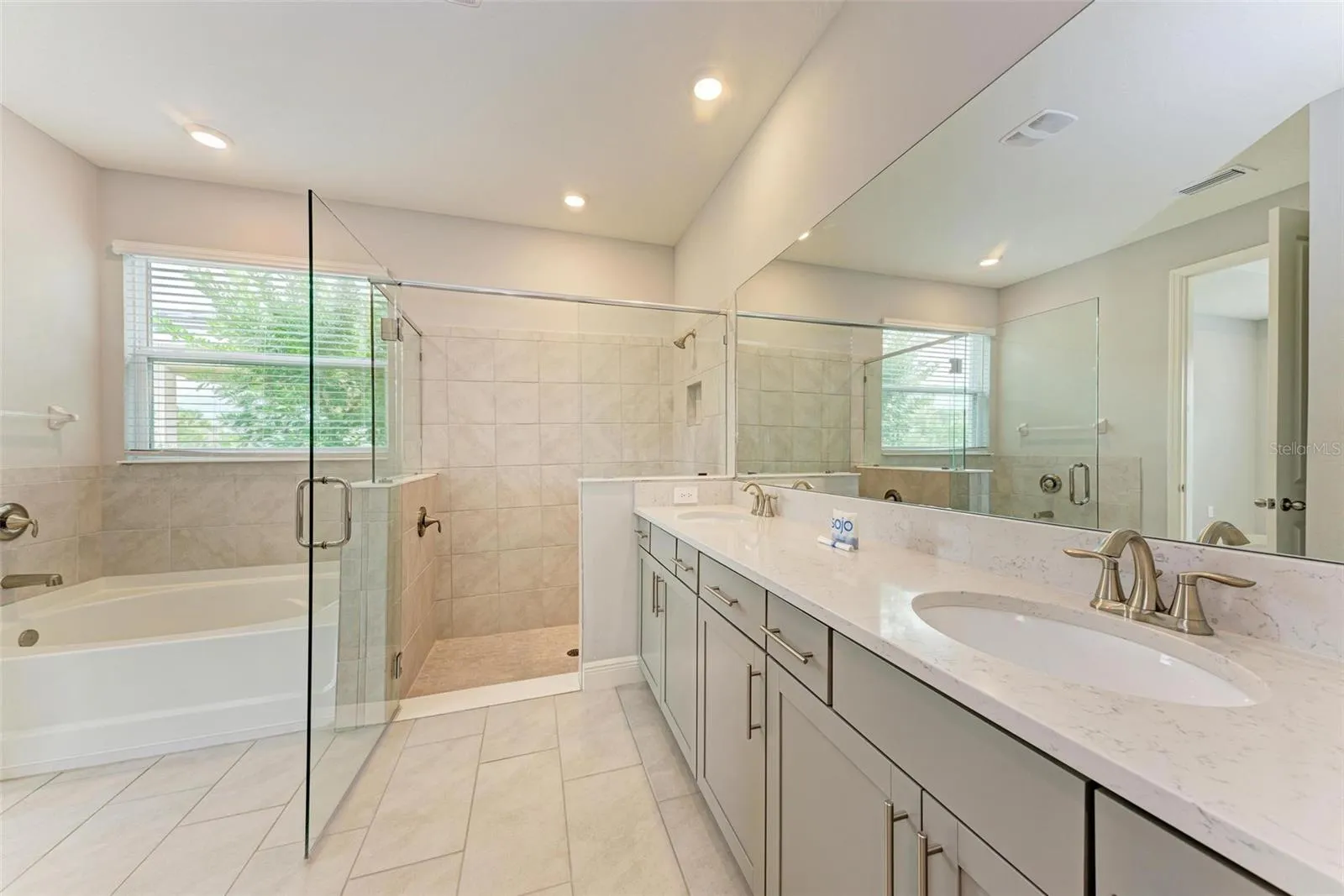 The private primary suite offers a spa-like bath with a walk-in shower, garden tub, dual sinks, and a generous walk-in closet. High ceilings (9’4”), elegant tile flooring, and abundant natural light enhance the home’s inviting feel.