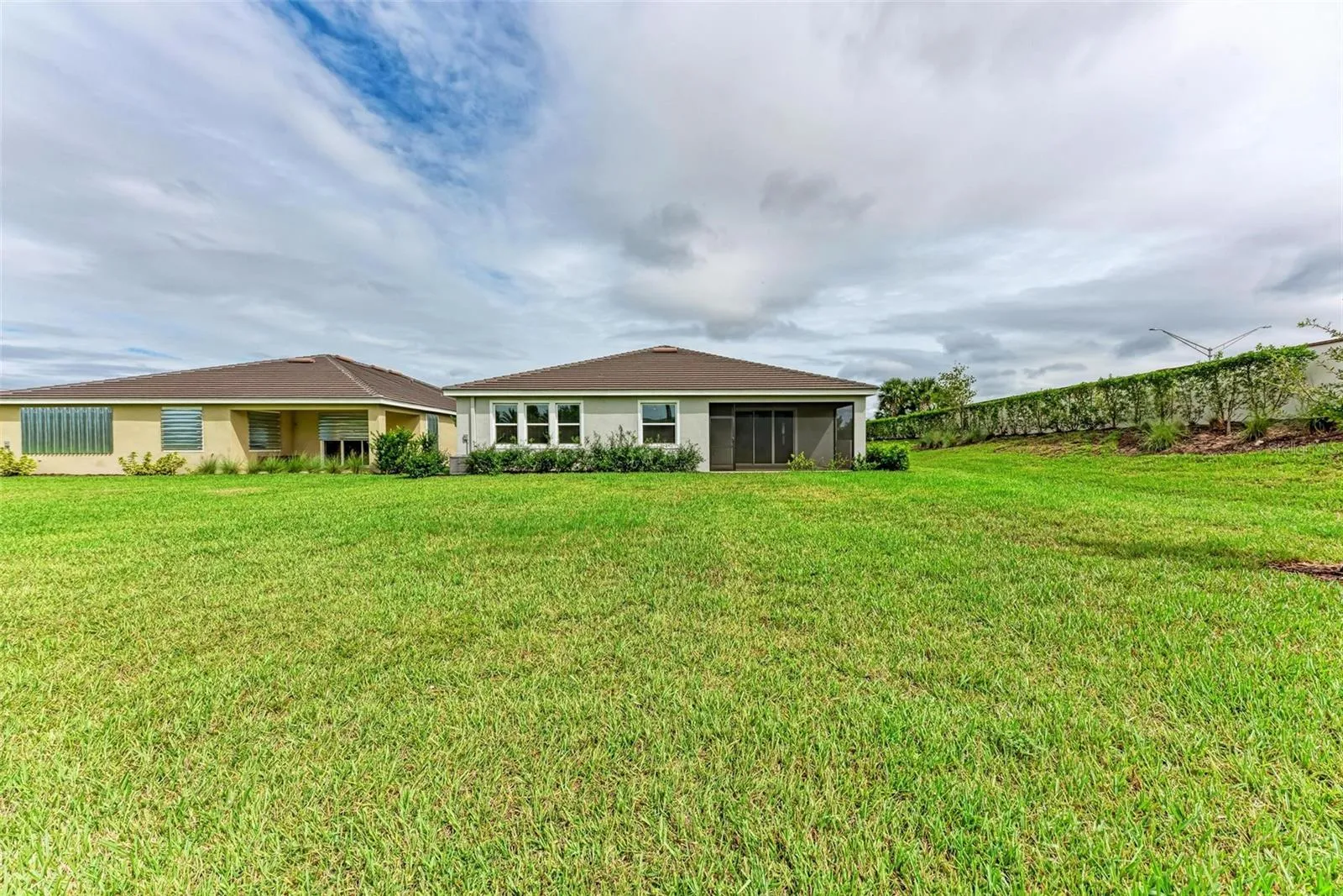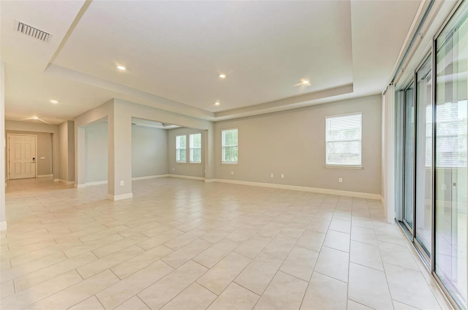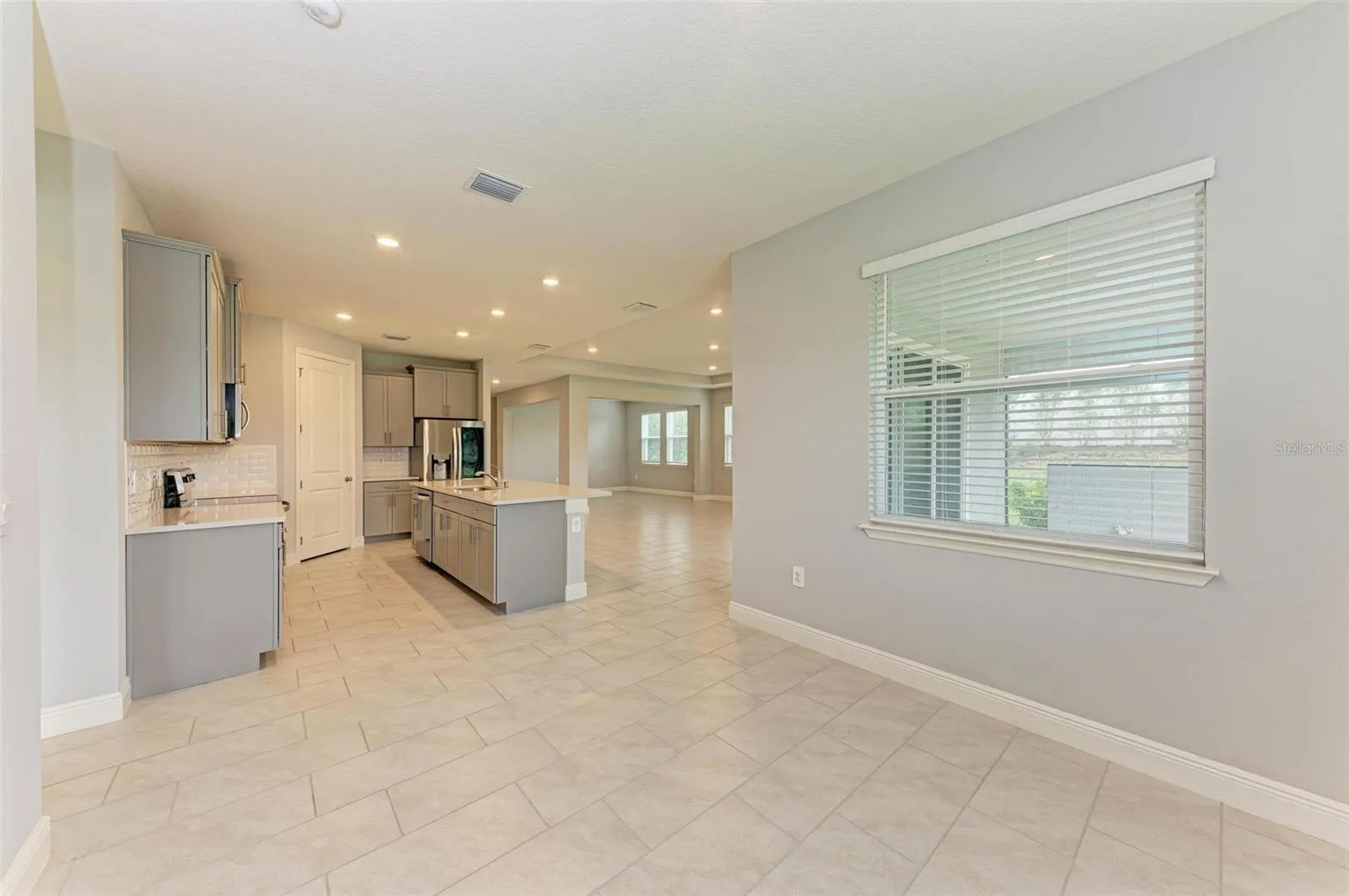 Step inside to find two bedrooms sharing a Jack-and-Jill bath, a third bedroom with a private bath, and a bonus room ideal for a second living space, office, or in-law suite. The open-concept great room flows seamlessly into a gourmet kitchen boasting quartz countertops, stainless steel appliances, sleek grey cabinetry, and an eat-in dining area with backyard and screened lanai views.