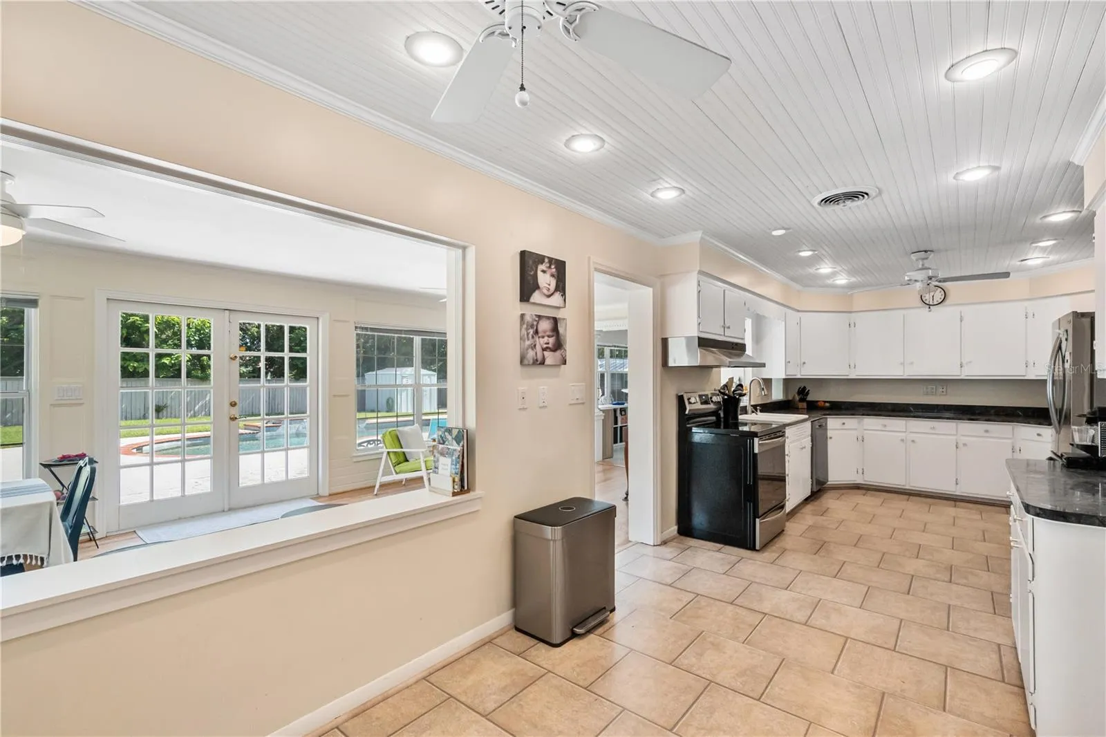 The private bedroom wing includes 3 bedrooms and 2 updated baths, including a spacious primary suite with upgraded en-suite bathroom. Walls of windows along the back of the home offer abundant natural light and overlook the oversized backyard with a sparkling saltwater pool—ideal for entertaining or relaxation.
