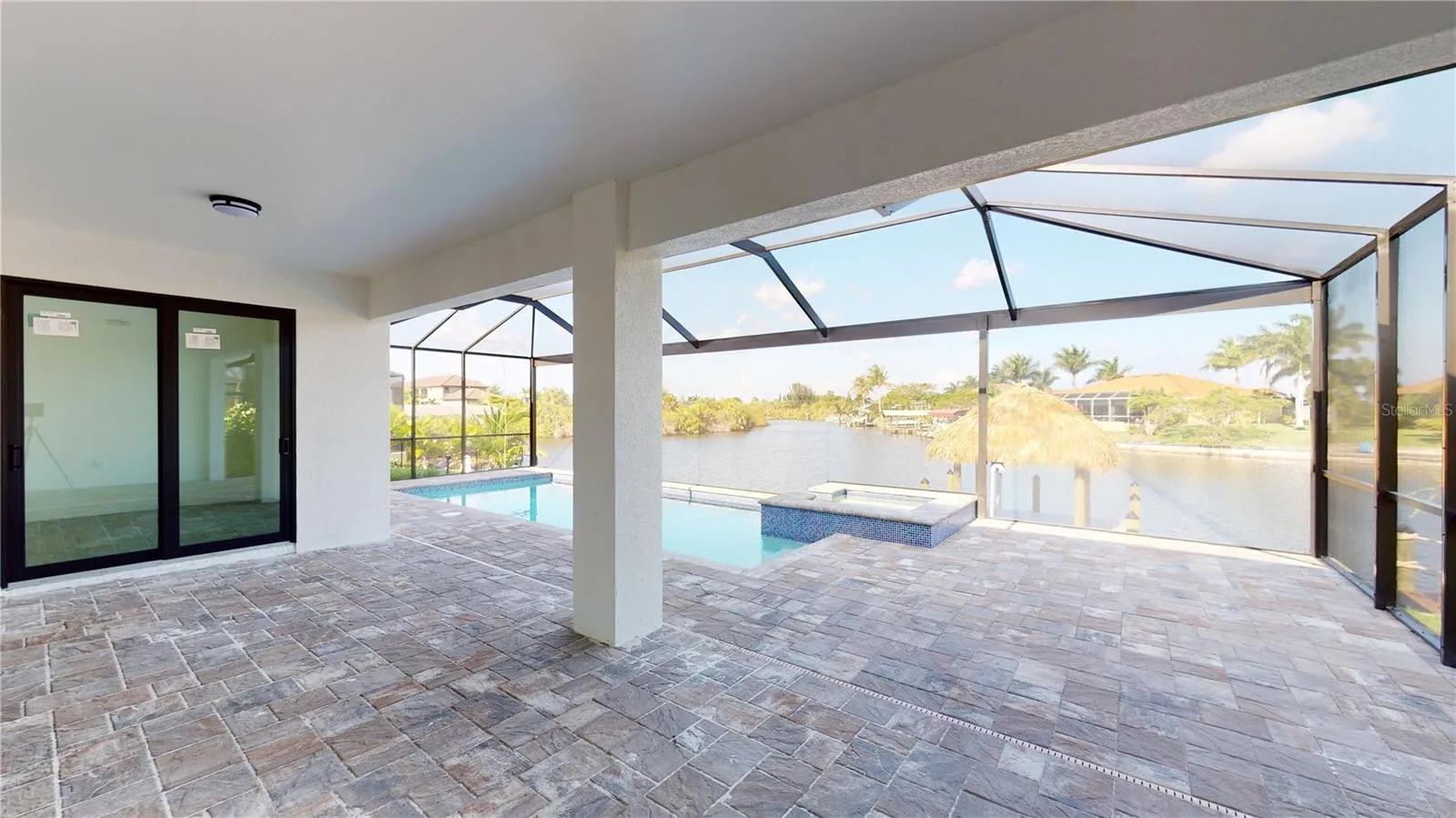 With western rear exposure, the home captures breathtaking sunsets and provides easy access to vista views of the pool, spa, and saltwater waterfront—an ideal setting for outdoor meals, swimming, and leisure activities. The expansive living room, featuring a striking 14-foot cove ceiling, offers seamless views of the lanai and canal.