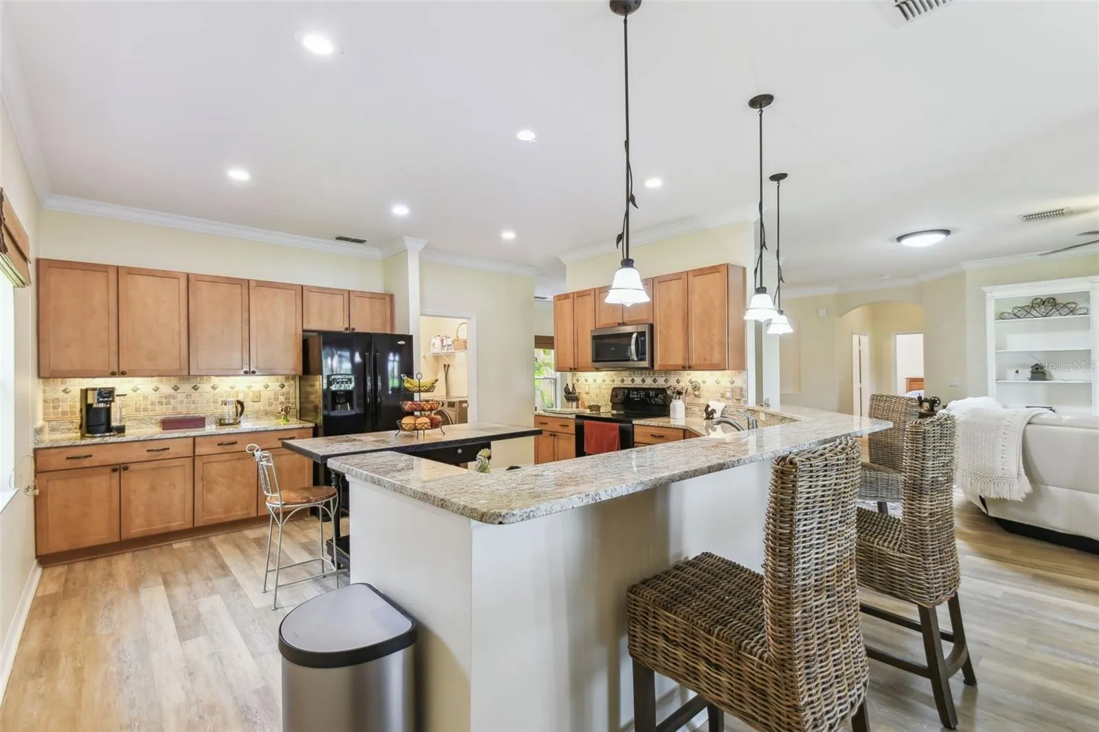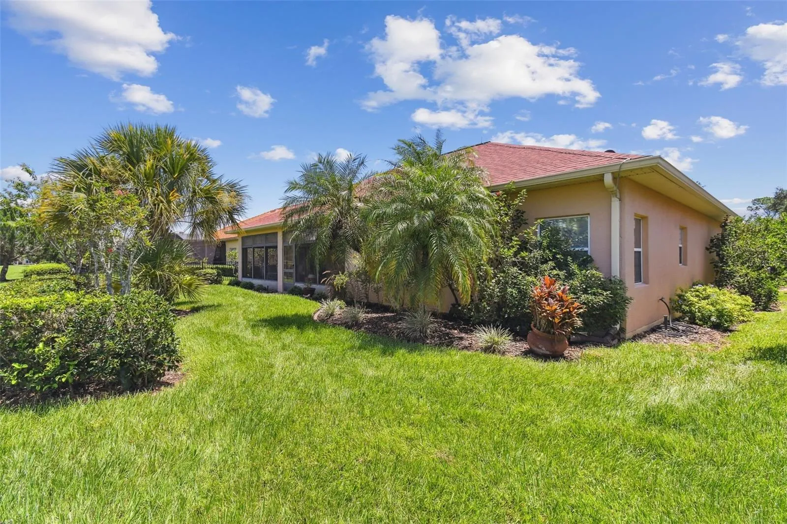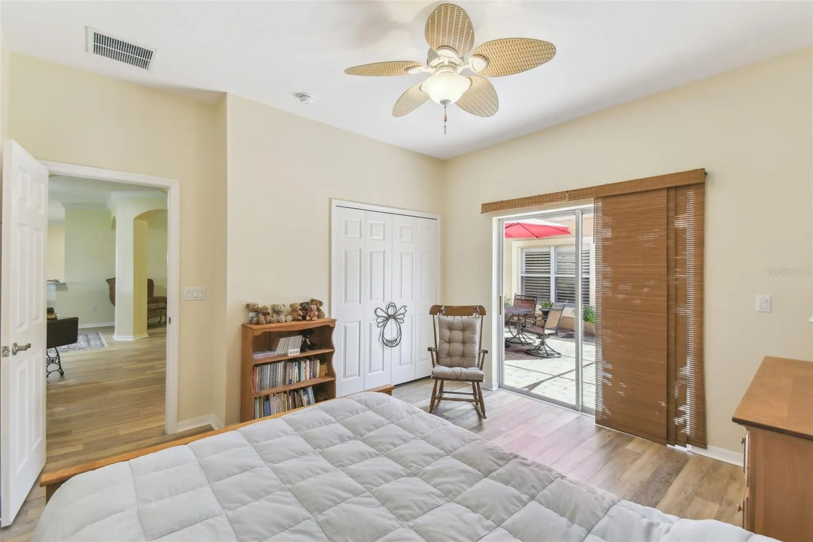 Located in a highly sought-after Solivita 55+ golf course community, this beautifully upgraded Bolero model offers 3 bedrooms, 3 bathrooms, a 2-car garage plus a dedicated golf cart garage, all with picturesque pond and golf course views. A separate-entry casita in-law suite provides ideal guest accommodations or private office space. Enjoy serene outdoor living in the expansive 30’ x 9’ screened courtyard featuring a tranquil fountain, perfect for entertaining or relaxing. The interior boasts an open layout with a dedicated dining room, living room, and a Florida room that captures the stunning views. The chef’s kitchen is a standout, equipped with granite countertops, an eat-at bar, center island, and plenty of cabinetry for storage. The spacious primary suite includes a sitting area with access to the lanai, dual walk-in closets, and a spa-like en-suite bath with soaking tub and walk-in shower. Bedroom 2 offers direct access to the front courtyard and is conveniently located next to the guest bathroom. The separate casita includes its own full bath, ideal for multi-generational living or hosting guests. A spacious 3-season lanai provides unobstructed panoramic views of the golf course and pond – perfect for morning coffee or evening relaxation. Notable upgrades include:, Luxury Vinyl Plank flooring throughout, Stone veneer front elevation, Solar light tube for natural lighting, Lush custom landscaping. New roof (2016), HVAC system (2020), Water heater (2023), New granite countertops And much more! This home perfectly blends indoor-outdoor living with functionality, privacy, and stunning surroundings. A must-see for those seeking elegance and comfort in a golf course setting. All this in one of the top 55+ communities in America. Solovita offers residents access to state of the art amenities and work out facilities, dance and aerobics studios, a business center, 14 heated swimming pools, 2 heated spas, tennis courts, pickleball courts, shuffleboard, bocce ball, billiards room, art gallery, 3 restaurants and 2 championship 18-hole golf courses, driving range and putting course. Every day offers something new to explore and enjoy! This home also features easy access to nearby shops, dining, and health care, offering the perfect balance of privacy and lifestyle. Don’t miss out on the opportunity to have a first class lifestyle.