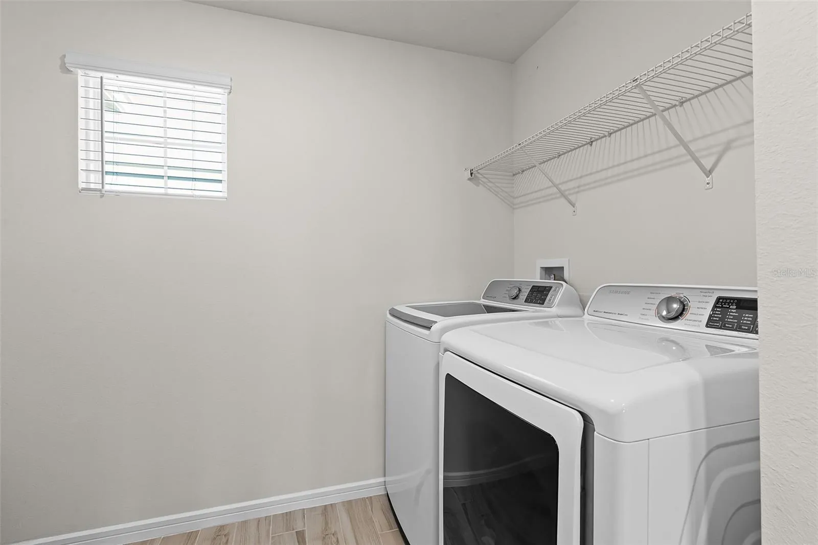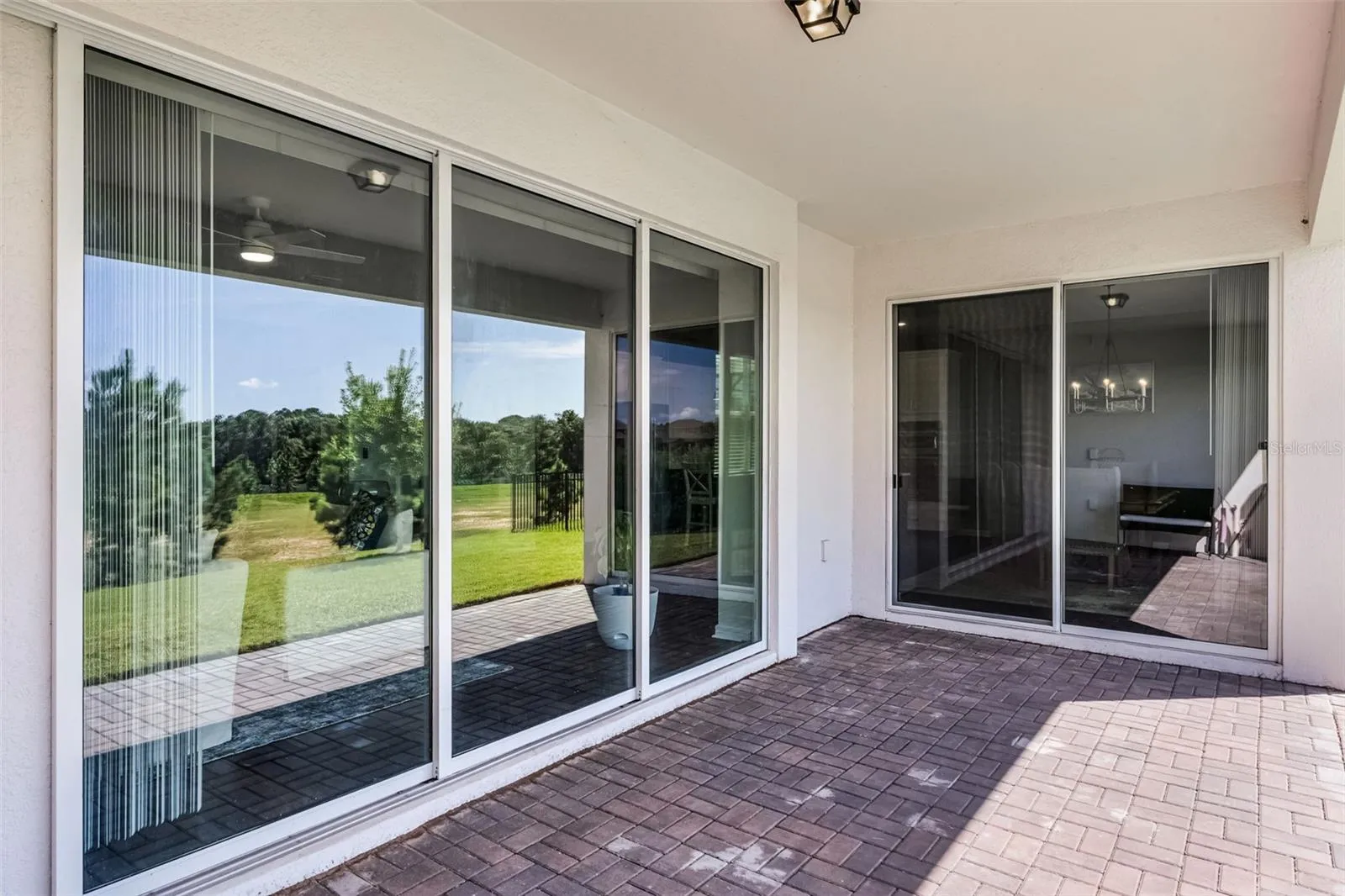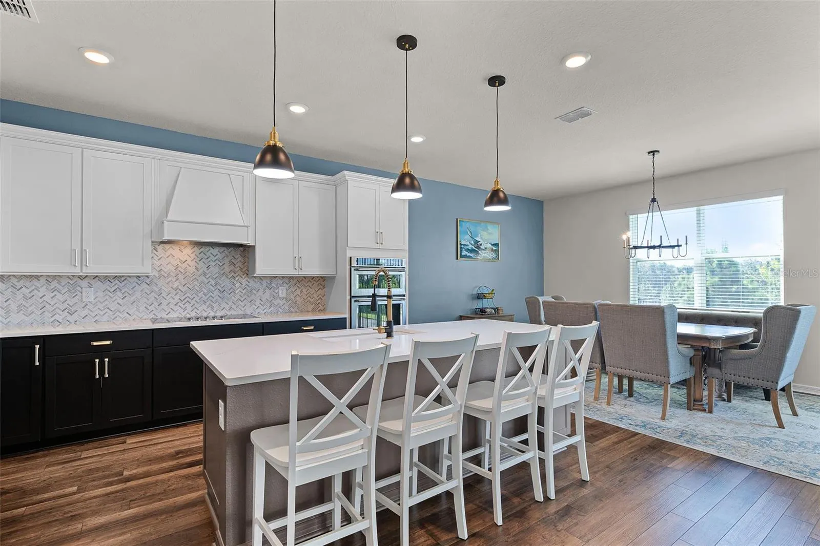 Inside, wood-tone LVP flooring flows throughout the first-floor main living areas, complemented by custom trim work, designer wallpaper, and contrasting doors and trim. The gourmet kitchen is a showstopper with contrasting upper and lower cabinets, upgraded hardware, a large island with pendant lighting, a gorgeous backsplash, and premium finishes. The expansive great room opens with triple sliders plus additional double sliders to the covered lanai—perfect for indoor-outdoor living—with no rear neighbor for added privacy.