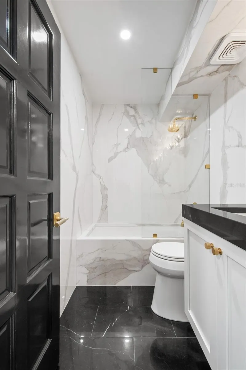 The second bedroom, equally refined, features Oxford gray grasscloth wallcoverings and a custom-framed window. Brass hardware adorns the closet doors. Adjacent, the secondary bath continues the theme of luxury with handcrafted black marble flooring, a soaking tub with marble surround, a floating vanity, and a handcrafted custom gold faucet by Phylich that provides a bespoke finish.