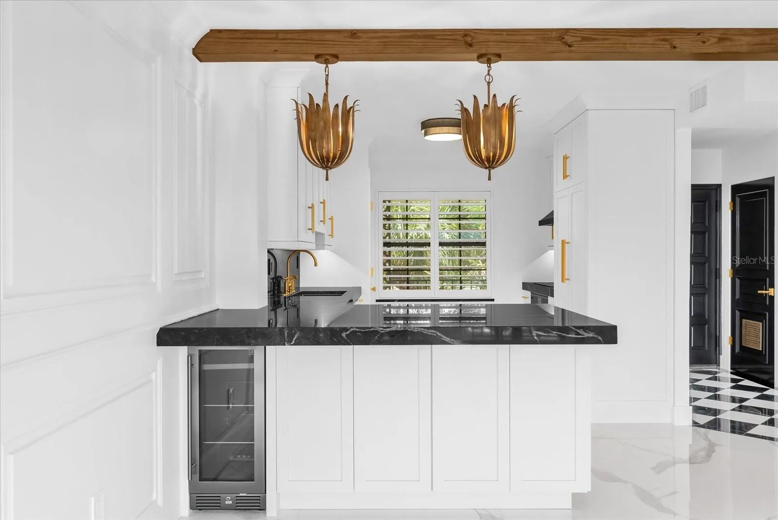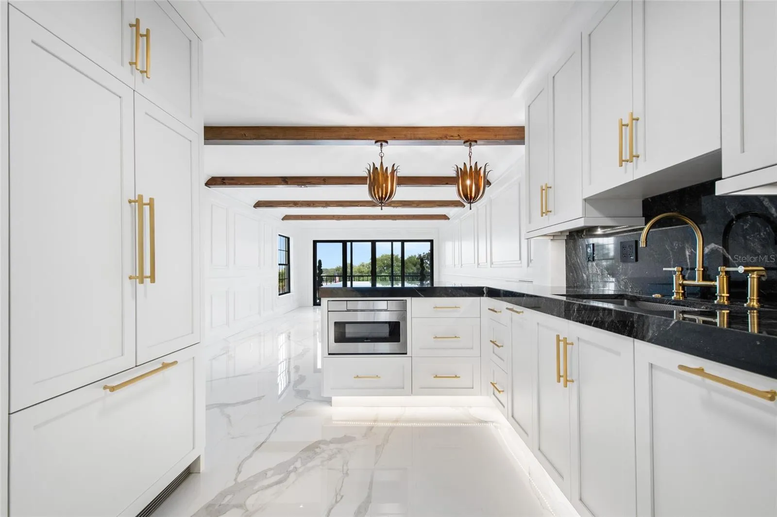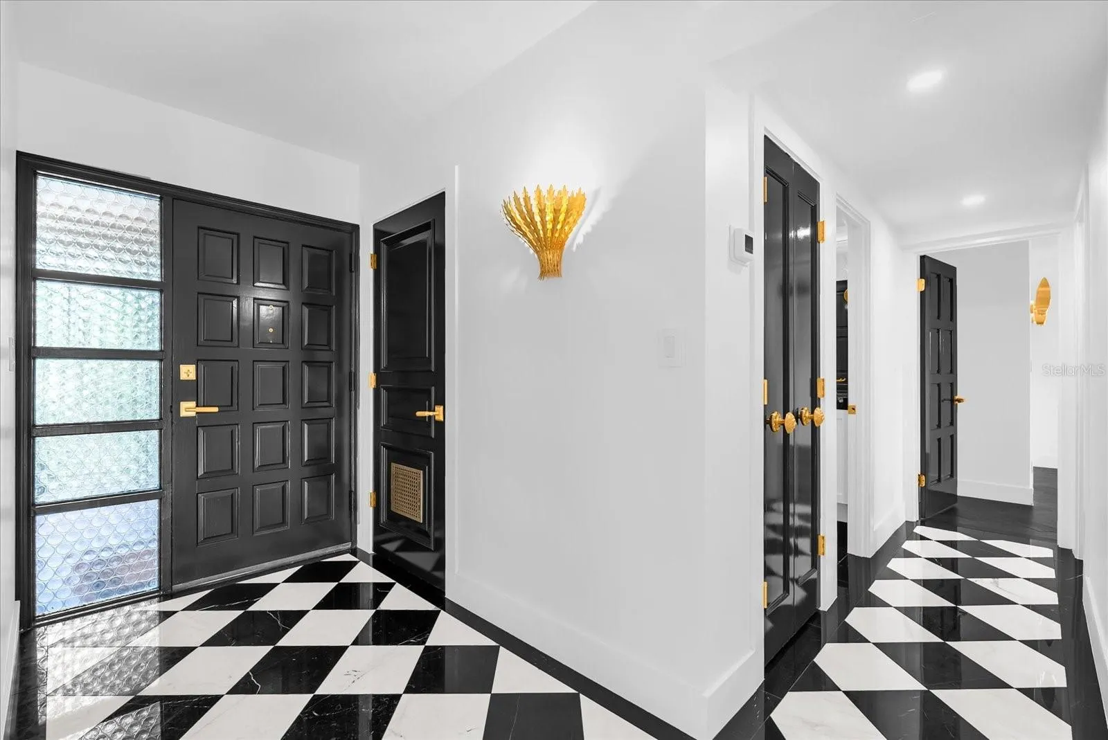 A striking entry sets the tone with a black-and-white harlequin marble floor foyer and hall spilling into the main living area, where large-format Calacatta Gold floors extend through the kitchen and living spaces. Rich, solid wood custom-made floor-to-ceiling paneling wraps the living and dining room walls, complemented by cove crown molding and hand-crafted ceiling beams. Curated lighting fixtures finished in gilded gold leaf elevate the interiors with architectural distinction throughout this penthouse-style space, casting a warm, refined glow.