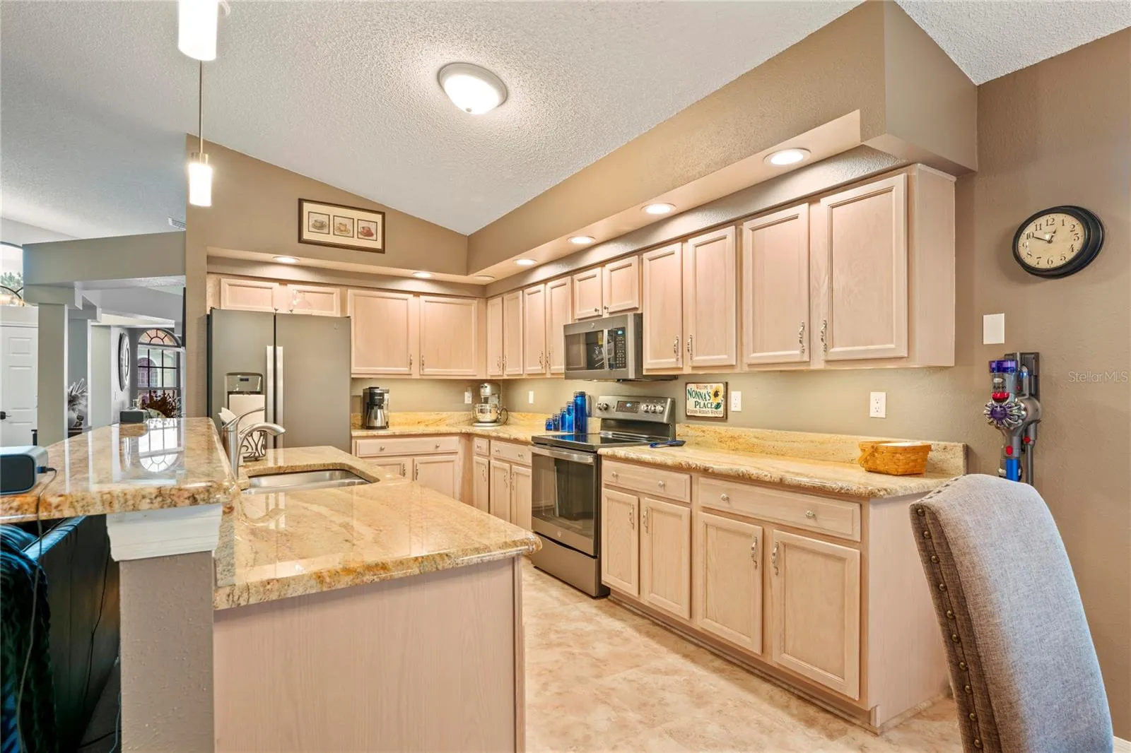 Price improvement! ** Discover the blend of comfort, luxury, and an active lifestyle in this stunning 3-bedroom, 2-bathroom house nestled in a vibrant 55+ gated community. Exquisite architectural design, vaulted ceilings, elegant formal living and dining rooms, generous family room, adjacent to the kitchen, with granite countertops and newer appliances, breakfast bar and eat-in kitchen nook. Primary suite has a walk-in closet and en-suite bathroom (dual sinks, garden tub, and separate shower). Enclosed back lanai with A/C adds valuable square footage. Park-like setting in back yard! Community pool, on-site restaurant and bar, clubhouse and so much more! HOA includes exterior maintenance, roof, paint, basic cable and internet service. Surround sound, hurricane shutters for all windows, new ceiling fans, new carpet in living, dining and family rooms. Roof and A/C age is 2017. Schedule a private showing today, and step into a life filled with luxury, comfort, and endless possibilities!