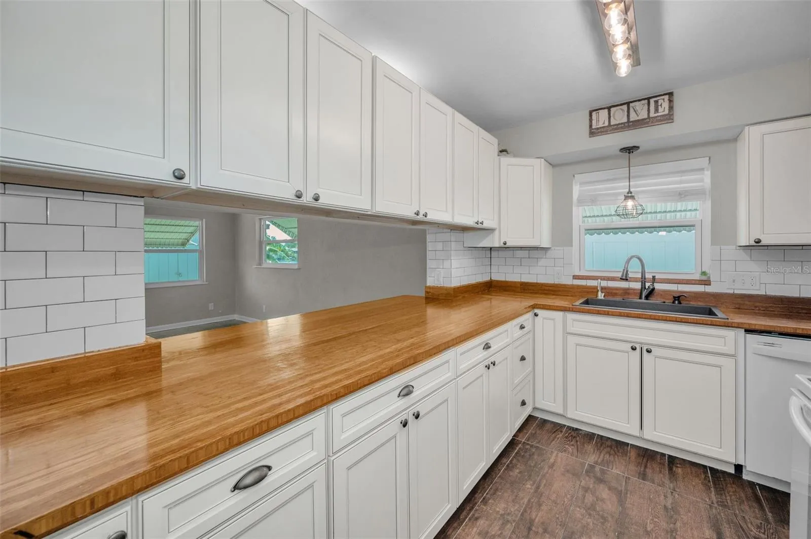 The REMODELED KITCHEN features beautiful cream wood cabinets, bronze hardware, and a convenient PASS THROUGH-BAR— connecting to the Family Room while maintaining a warm, traditional layout (not open concept).