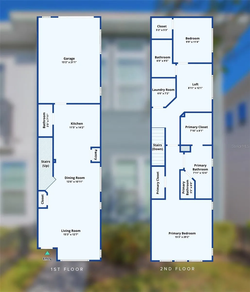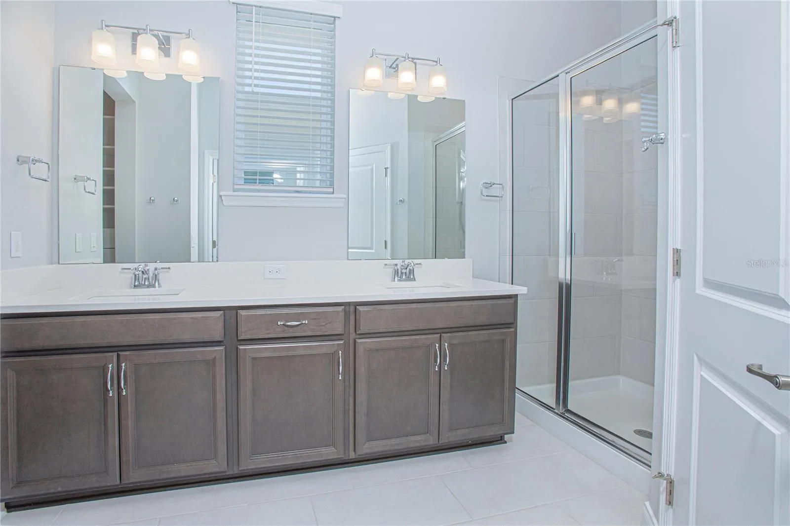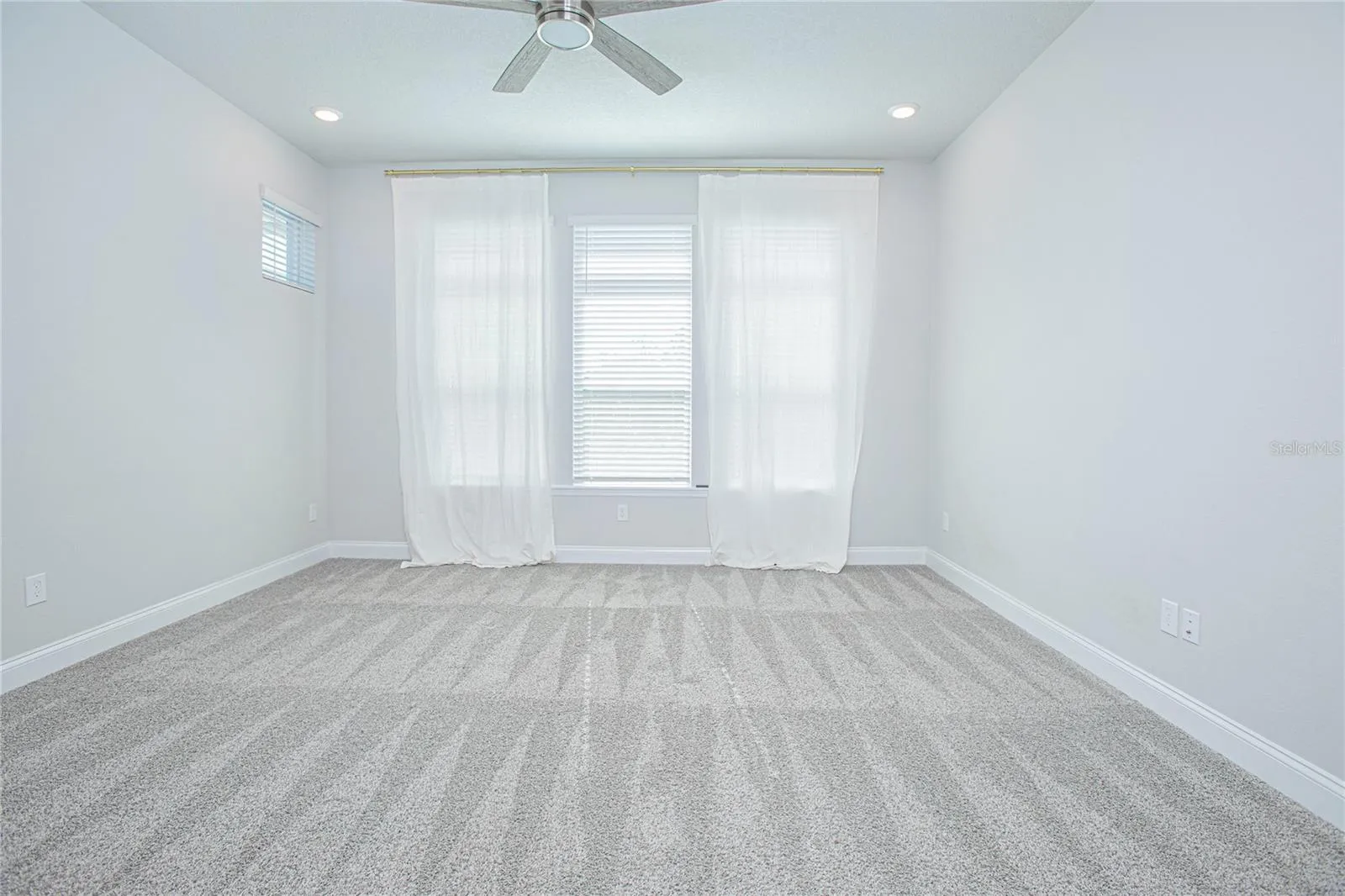 Upstairs, you’ll find a spacious primary suite that serves as your private retreat, featuring a spa-like bath with dual vanities, tiled shower, and a walk-in closet with wall-to-wall shelving. The guest bedroom offers its own expansive closet and nearby full bath. A dedicated laundry room with washer and dryer on the second floor makes daily living even easier.