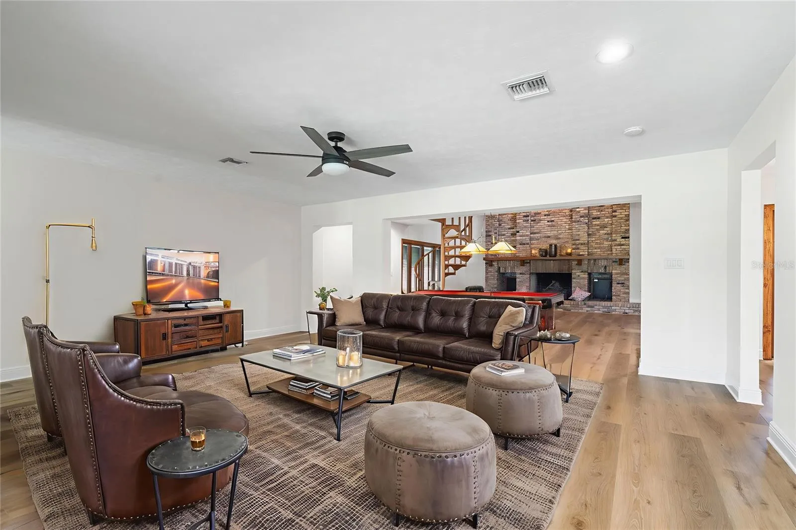 The great room centers around a gorgeous wood-burning fireplace, creating a cozy and inviting space for gathering. Throughout the home, fresh updates and a functional layout support a variety of lifestyles or multiple-generational living.