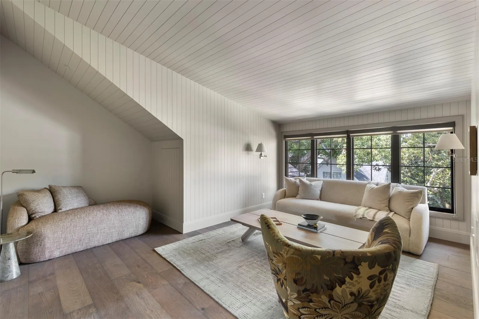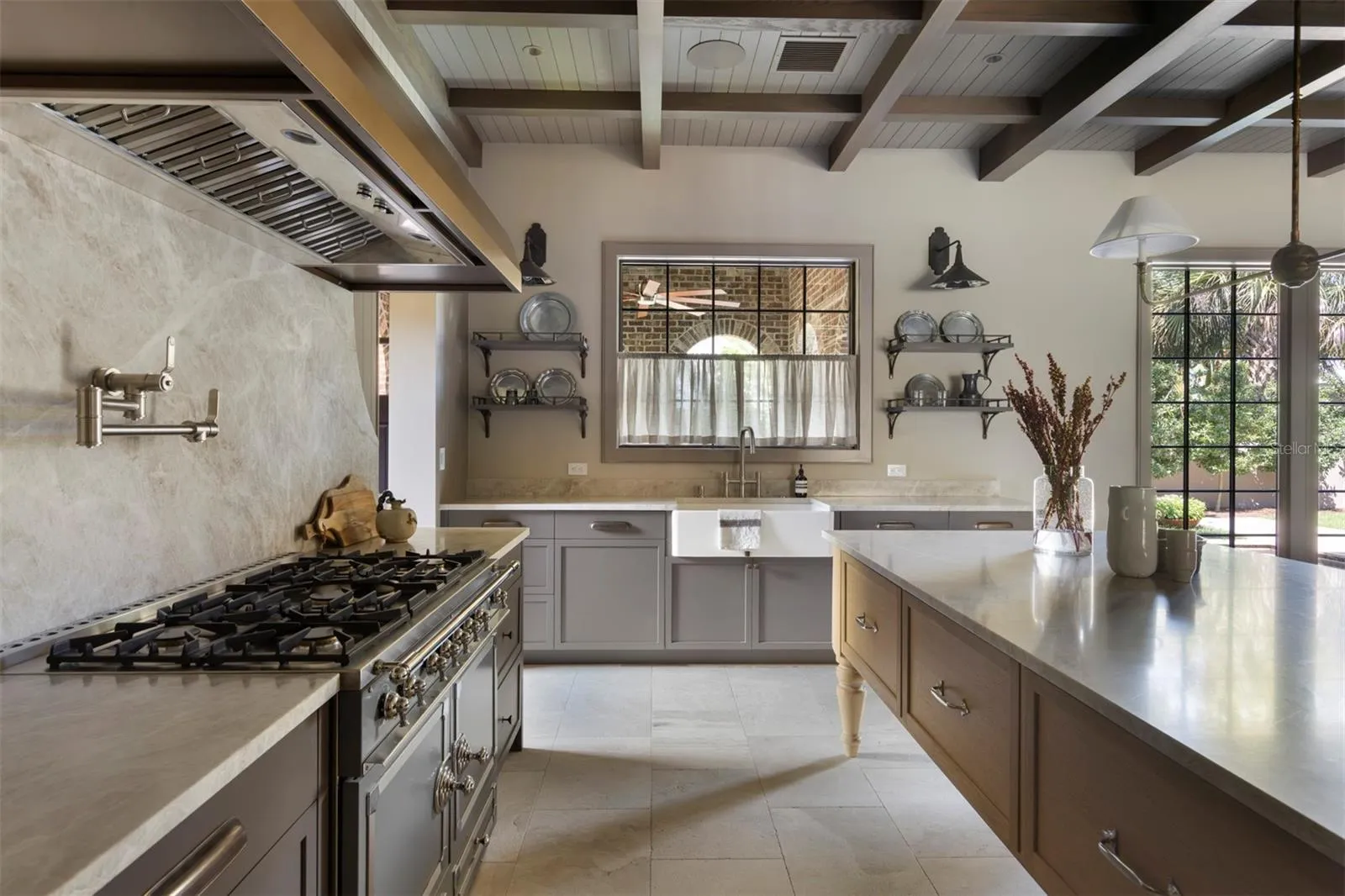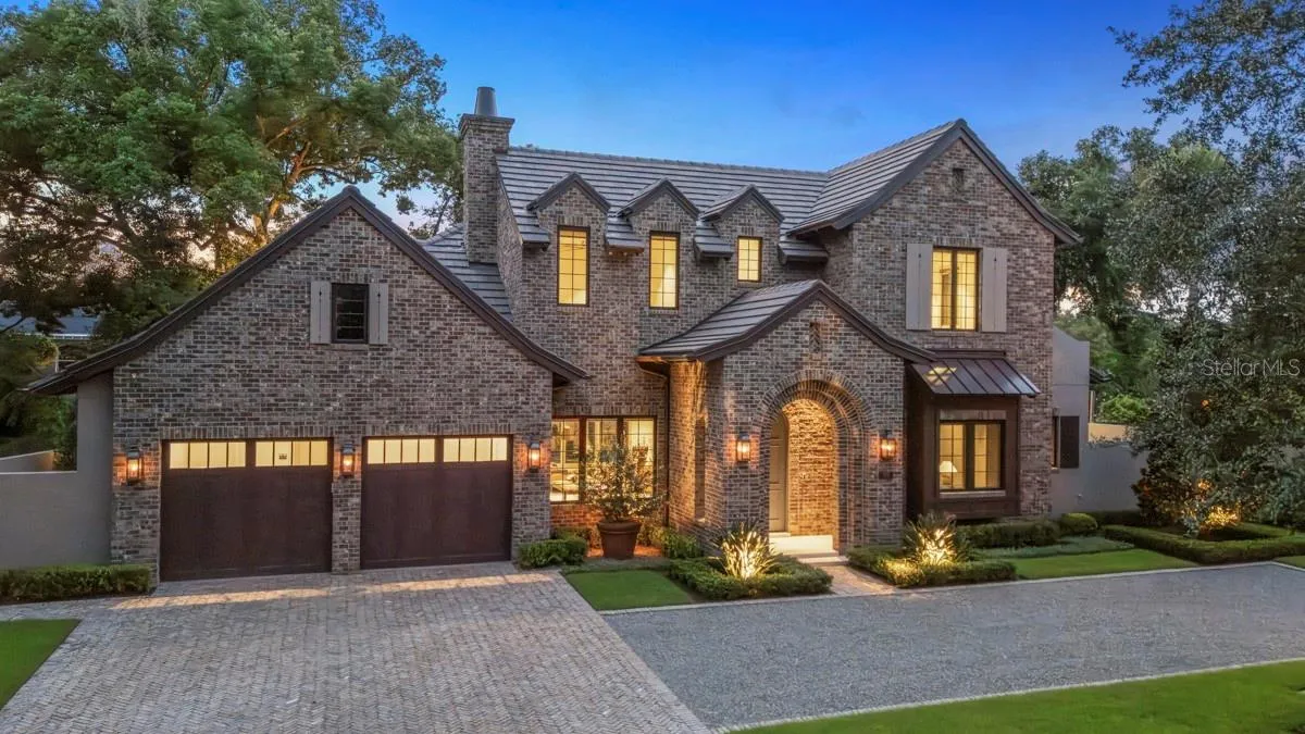 Welcome to 702 Via Bella, an impressive 2025 English cottage estate by Floridian Custom Homes that captures the essence of timeless architecture exemplifying elegance and artisan craftsmanship. In one of Winter Park’s desirable residential corridors, warmth and beauty abound in this four-bedroom, six-bath residence spanning 3,720 square feet or air conditioned and 4,535 square feet total under roof, offering layered living, artisanal materials, and a modern infrastructure. Upon entry through a solid mahogany front door, warmth and beauty abounds with Botticino limestone flooring enhanced by a textured finish, extensive custom millwork, and an abundance of open concept living areas. Coffered ceilings and recessed WAC lighting create a gallery-like ambiance, enhanced by natural light from insulated casement windows. The central living space integrates with the dining area and designer kitchen, which features custom cabinetry by Grit & Grain, leathered Taj Mahal quartzite surfaces, and chef-grade appliances: a La Cornue 43-inch gas range with McGurken hood, Thermador 30-inch refrigerator and freezer columns, and Bosch dishwasher. The kitchen transitions into a walk-in pantry with cabinetry, quartzite, dual refrigeration drawers, and a dedicated ice maker. An oversized mudroom, finished with hardwood built-ins, offers expanded storage and functionality. The first-floor primary suite is privately positioned in its own wing and finished with wide-plank European white oak flooring by Forrest Accents, a walk-in closet with textured built-in systems, and a spa bath with natural stone countertops, Rohl polished nickel fixtures, a marble-tiled floor and shower, and a frameless glass enclosure. All doors are solid core with Emtek hardware. The library, near the front of the home, offers a quiet retreat with matching oak floors and custom casements. A solid wood staircase leads to the second level living areas including a lounge flex space. There are three additional bedroom suites, each with en-suite baths, which offer porcelain flooring, frameless glass shower doors, brushed quartz and dolomite vanities, decorative lighting, and built-in closet systems. Additional features include CAT-5/6 wiring, Sonos-integrated speakers, lighting automation via the Lutron RA-3 smart system, and pre-wired home security with digital camera ports at key access points. Thoughtfully placed access points from the primary suite and kitchen wing lead to a fully enclosed backyard retreat, where mature landscape design by Signature Landscape frames a private outdoor living sanctuary. A Roman-inspired cabana with grand ceilings and exposed beams anchors the outdoor entertaining space, flanked by a fully tiled ($50,000 upgrade) saltwater pool featuring therapy jets, LED-lit bubblers, a dual-skimmer system, automated controls via a Jandy heat pump, and a Paramount self-cleaning system. Clay brick pavers and landscape lighting define the walkways as well as front entry driveway. This home was constructed with stem wall foundation, concrete block first-floor exterior walls, and 2-by-6 second-floor framing for structural performance along with spray foam and sound mat insulation between floors ensure comfort and acoustic separation. Finished in a palette of clay brick and hand-troweled stucco, the home is crowned with architectural tile shingles and custom metal accents. Eight-inch half-round gutters, aluminum downspouts and engineered drainage ensure long-term performance.