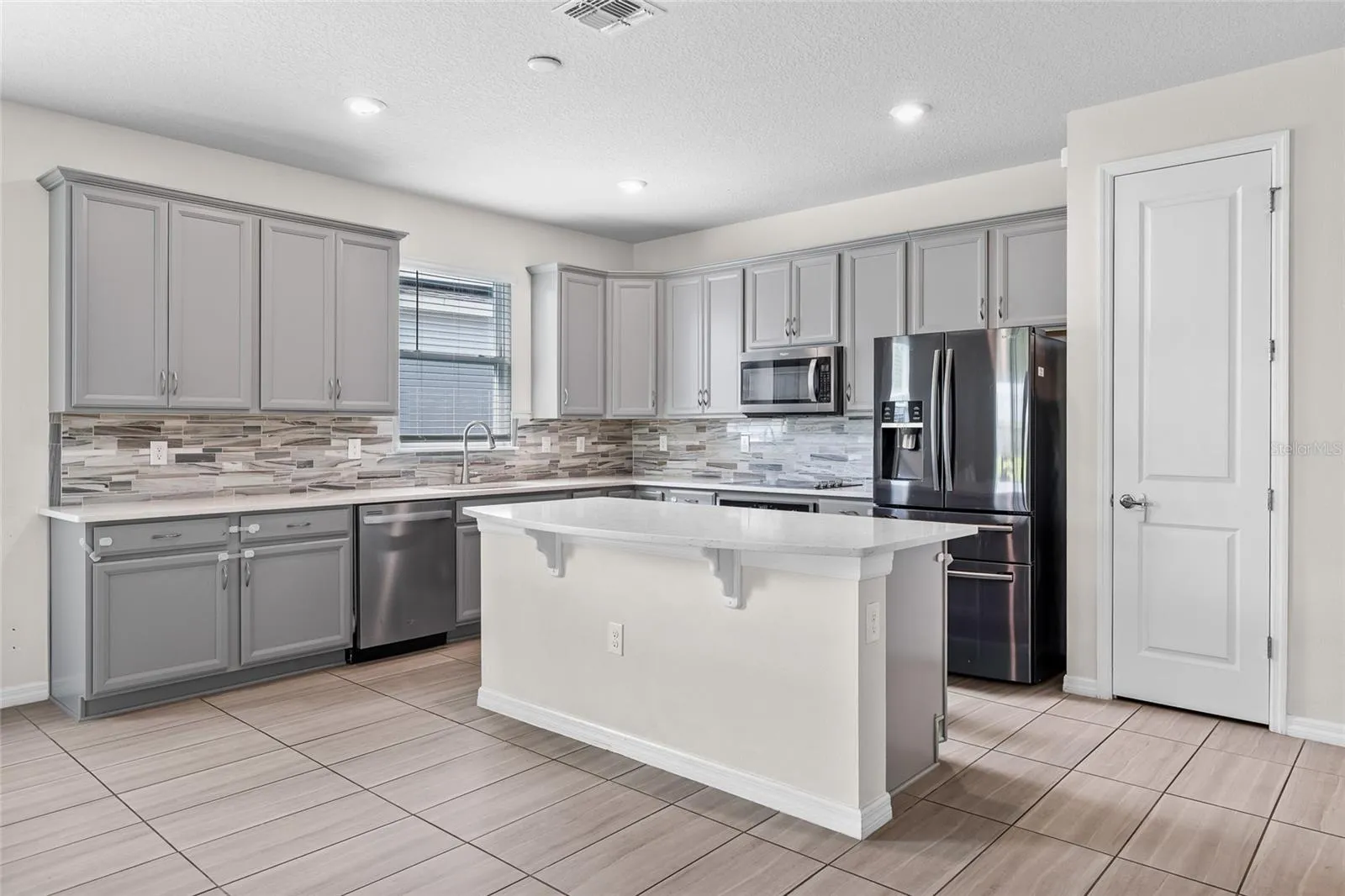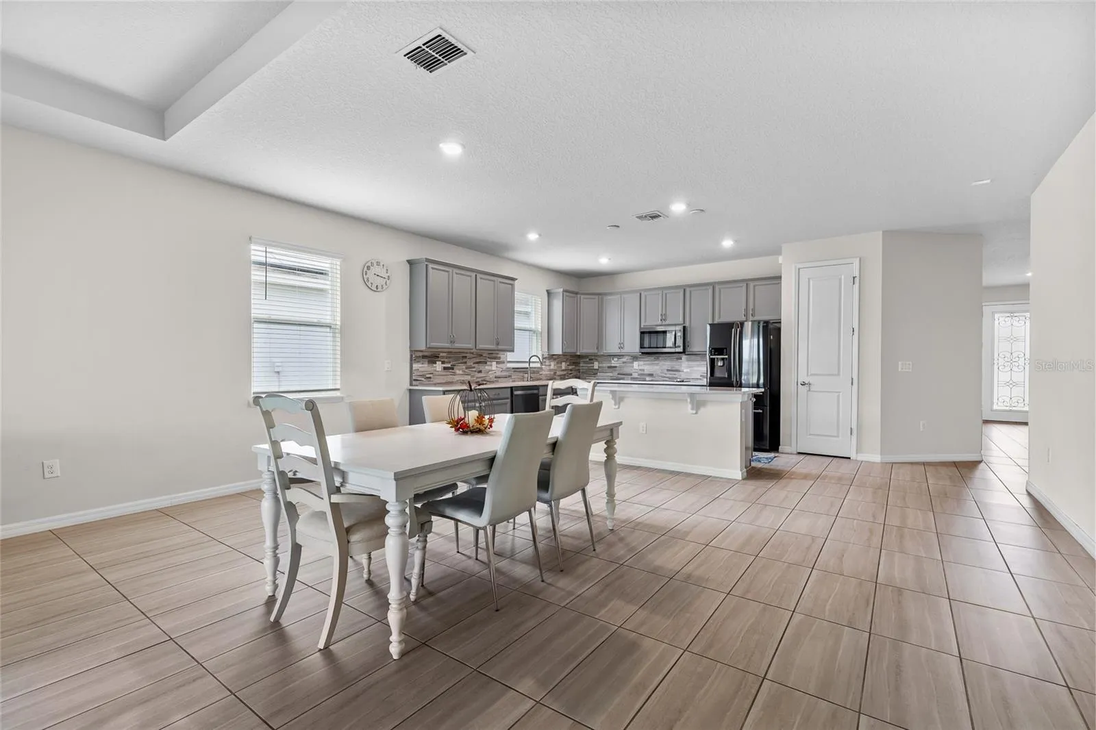 At the heart of the home, the kitchen stands out with sleek quartz countertops, stainless steel appliances, a stylish tile backsplash, and a spacious walk-in pantry. The oversized island is both functional and inviting, making it easy to serve meals, host game nights, or simply enjoy casual conversations while cooking. The adjoining dining and living areas are filled with natural light, providing an open, welcoming space for gatherings big or small.