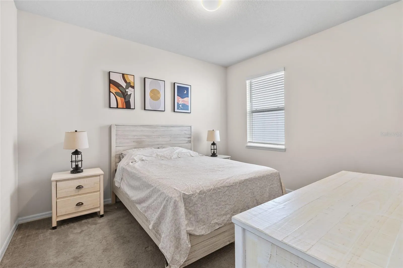 The primary suite offers a private retreat with soft carpet underfoot, a generous walk-in closet, and a spa-inspired bathroom featuring dual quartz vanities and a walk-in shower. Two additional bedrooms and a full bathroom with modern finishes provide comfort and flexibility for family or guests. A thoughtfully designed laundry room with built-in shelving adds extra convenience and storage.