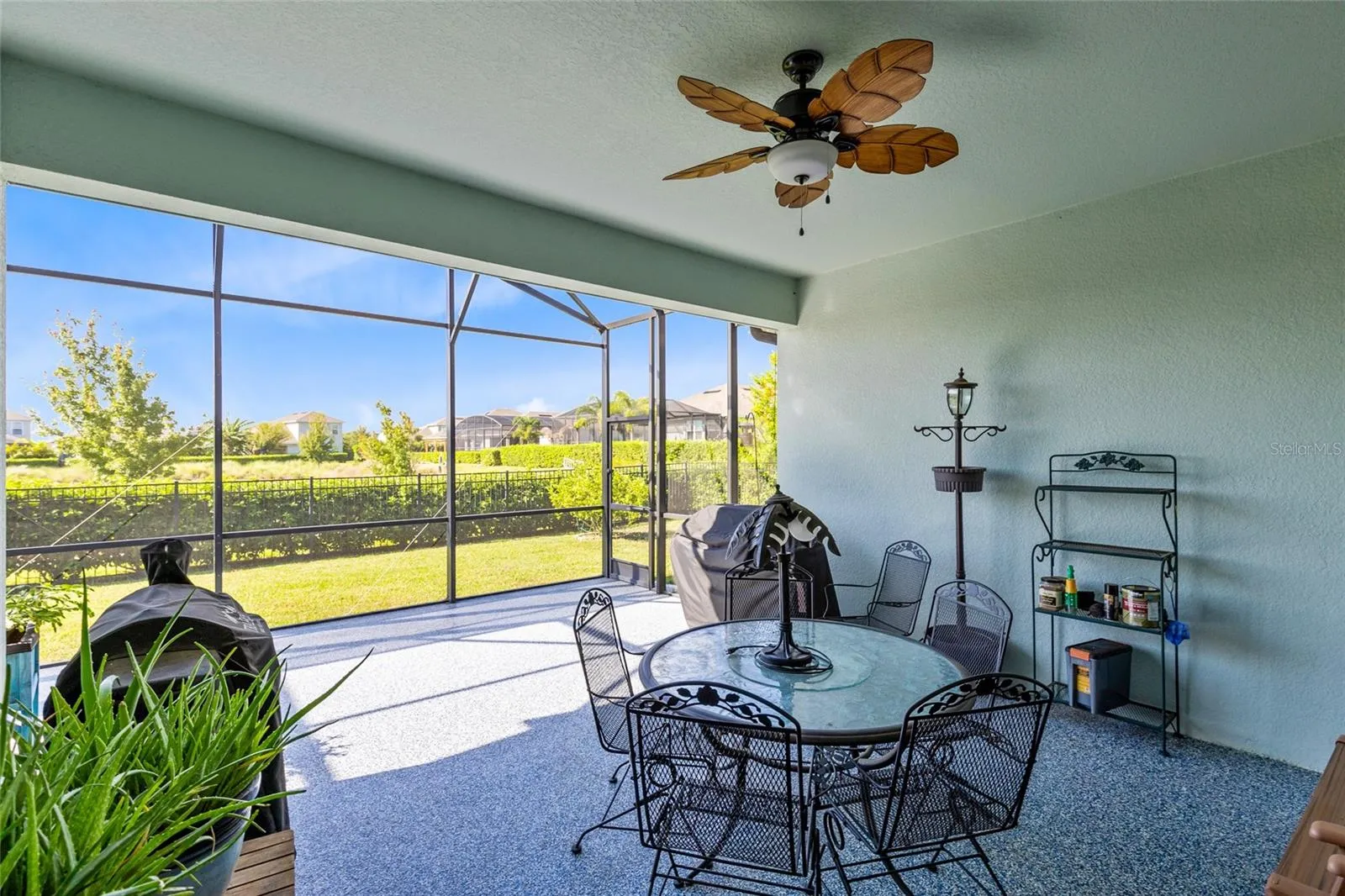Outdoor living is a highlight with a screened lanai featuring professionally applied epoxy flooring, a ceiling fan, and a chlorine hot tub included in the sale. Beyond the lanai, the fenced backyard offers plenty of space to enjoy Florida living, complete with irrigation and open views. From the lanai, you can even watch Disney’s nightly fireworks. The garage is also finished with epoxy flooring and the driveway provides a third parking space for extra convenience.