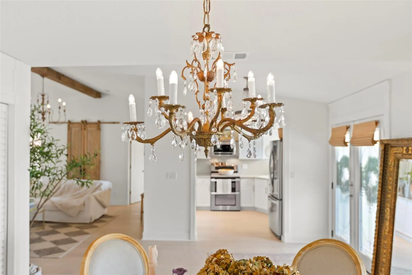 Welcome to your coastal retreat in beautiful Tierra Verde. This stunning 4-bedroom, 3.5-bathroom home seamlessly merges modern upgrades with inviting warmth. Upon entry through the elegant leaded glass French doors, you will be greeted by vaulted ceilings and a spacious open great room with new wide plank white oak hardwood flooring. A custom fireplace with a reclaimed wood mantle and an antique chandelier from a historic St. Petersburg hotel infuse the space with distinctive charm and high vaulted ceilings complemented by a reclaimed wood ceiling beam. The thoughtfully designed kitchen features quartz countertops, white cabinetry, stainless steel appliances, a custom wood hood surround, and updated lighting that combines style with functionality. The master suite offers a tranquil escape, complete with a marble-floored master bath, a new vanity, and a spacious walk-in closet. The lower level is equipped with durable LVP flooring and a practical kitchenette featuring butcher block countertops and floating shelves. Step into your own private oasis, featuring an impressive two-story screen enclosure that surrounds a stunning pool, perfect for both relaxation and entertainment. This serene outdoor area is enveloped by lush, mature tropical landscaping, offering an exceptional level of privacy and tranquility. Whether you’re enjoying a quiet morning swim or hosting a lively gathering, this exquisite backyard is a true retreat, blending luxury with nature’s beauty.