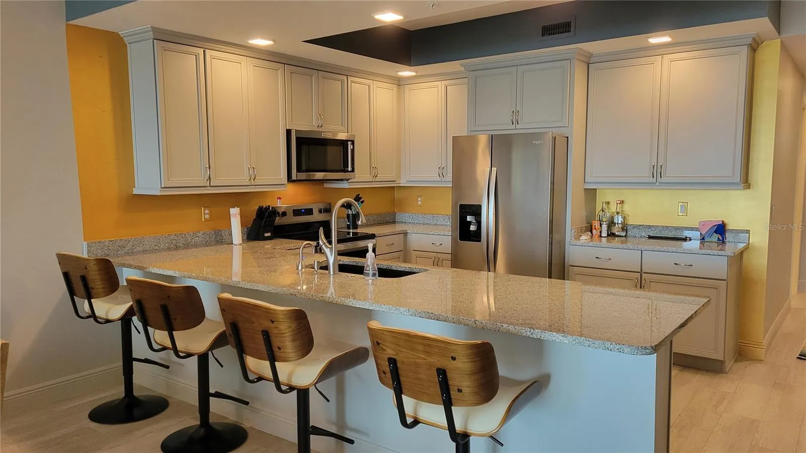 Annual Turnkey Furnished Penthouse on the Bay! If you want mesmerizing views of intracoastal waterway, Little Sarasota Bay, Casey Key, and the Gulf of Mexico in a beautiful, comfortable and roomy penthouse, then this could be your next home. This natural light filled delight is 2 bedrooms, each with en suite bathroom, separate office with large closet and glass French doors, and powder room in an open floor plan. The kitchen is large with solid wooden soft close, shaker style cabinetry topped with slab granite counters with a breakfast bar on peninsula with seating for 4. This room has a tray ceiling and is complimented with stainless steel appliances. The dining area will seat six comfortably and has your amazing water views. The condo also features a large laundry room with sink, granite counters for folding, hanging rack and upper and lower extra storage, as well as assigned parking garage for one with adjacent huge storage closet. This is a secure community with gated access to the community, and controlled lobby access, and for your weather concerns there are catagory 5 hurricane grade windows recently installed. The building itself is built like a tank-poured concrete floors and walls between units reinforced with rebar. The amenity package in this community is impressive, with a large clubhouse with full catering kitchen, lounge, library, fitness center, resort style pool and spa with tables and umbrella’s and a covered shaded area, BBQ grills and outdoor dining area in a Tiki Hut, and a board walk leading to an island with fountains spraying! Tennis or pickleball-YES! There is also a trail at the rear of the community leading near the water on a board walk. You will also find yourself convenient to shopping, dining, Siesta Key Beach, and downtown Sarasota with theater, opera, museums and more fun! Call today for your incredible home!
