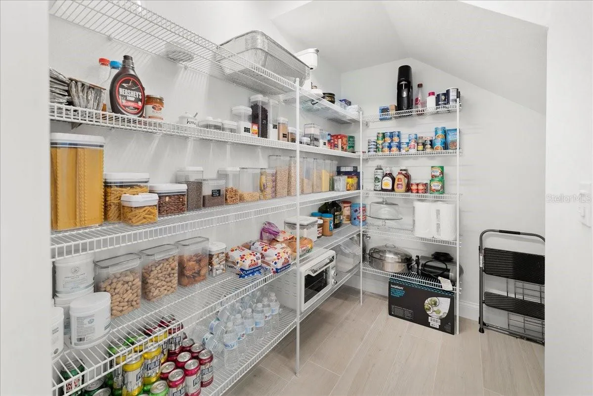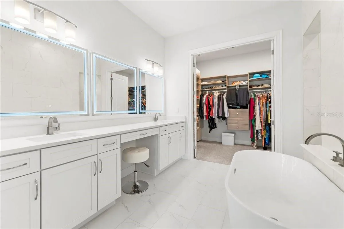 Stately curb appeal greets you as you enter the home via large double doors. The dramatic two-story entry foyer flows into the light and airy open concept first floor. A lower-level bedroom currently used as an office space provides direct access to a full bathroom, giving flexibility as work or bedroom space. A formal dining room flanks the entry foyer with plenty of seating for 10+ in an intimate setting, overlooking the lush street landscaping through large windows. The main living area provides ample seating space for your large group. This space can easily divided into dual seating areas to enhance entertaining, and complete with a large collapsible slider to the screened lanai. A highlight of this space is the floor to ceiling stone linear fireplace, providing lovely ambience for relaxation. The adjacent kitchen features 42-inch cabinetry, quartz countertops, glass tile backsplash, walk-in pantry and separate breakfast nook, overlooking the sparkling pool and spa. A first-floor primary suite features a large bay window overlooking the pool, tray ceiling, soaking tub, large walk-through shower, double sink vanity with lighted LED mirrors and seated vanity space, and walk-in closet with custom closet system. Rounding out this well-designed lower level is a laundry room with extra storage.