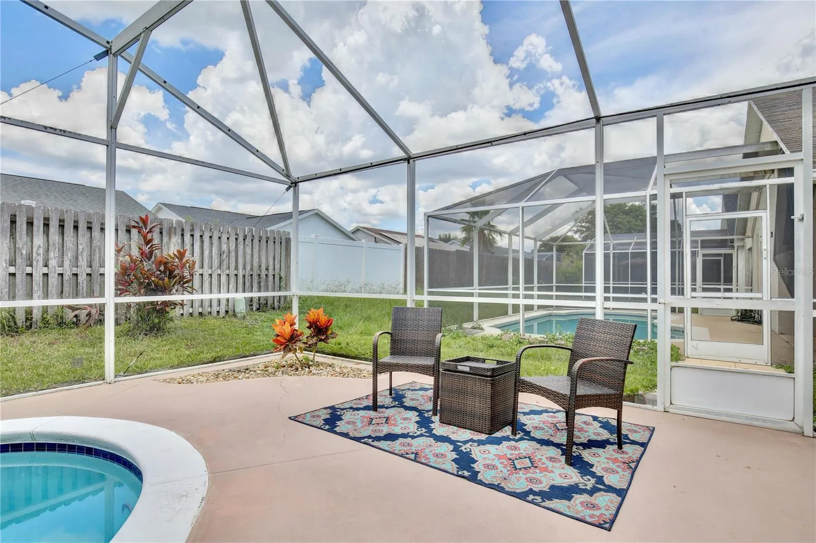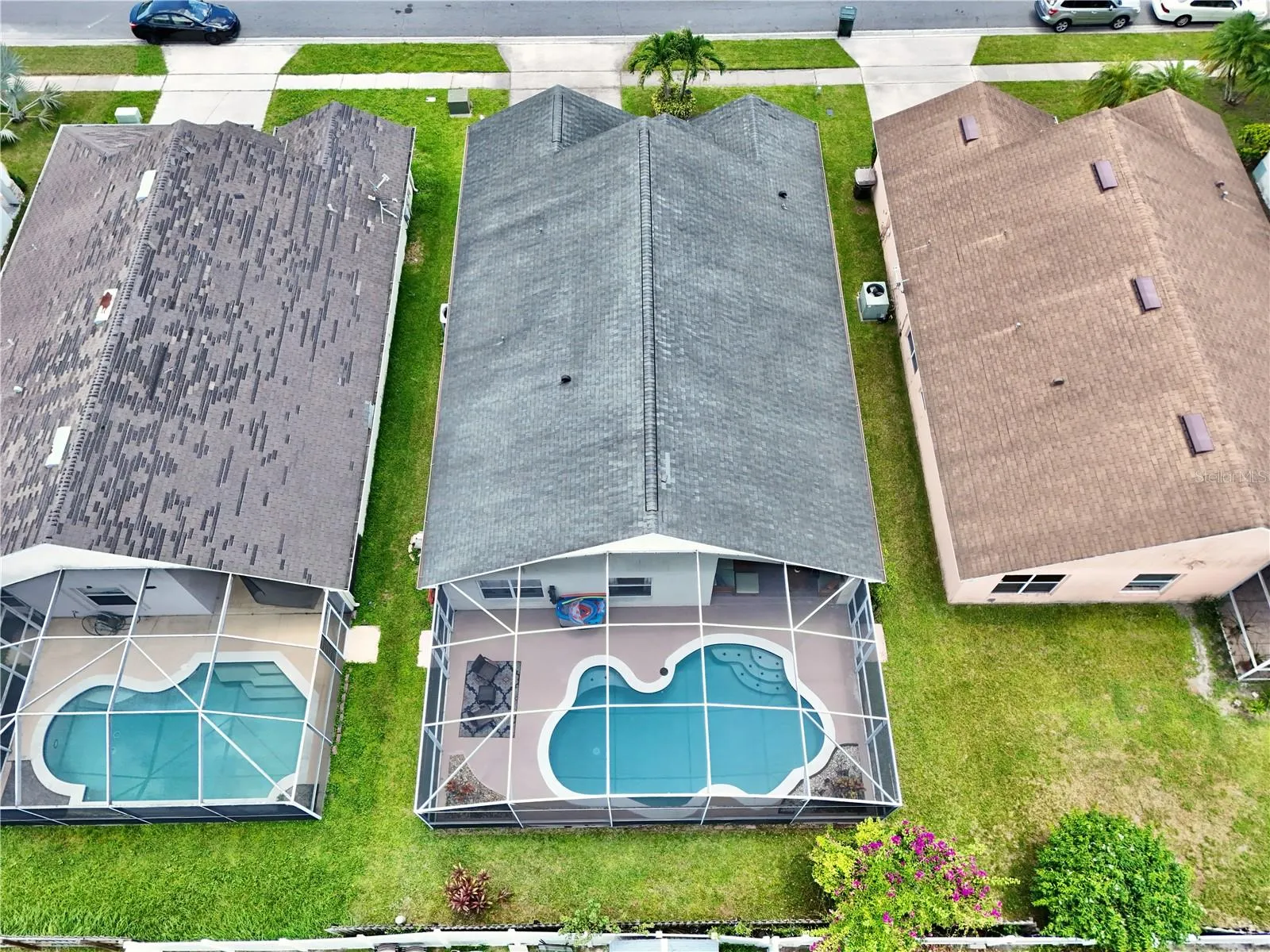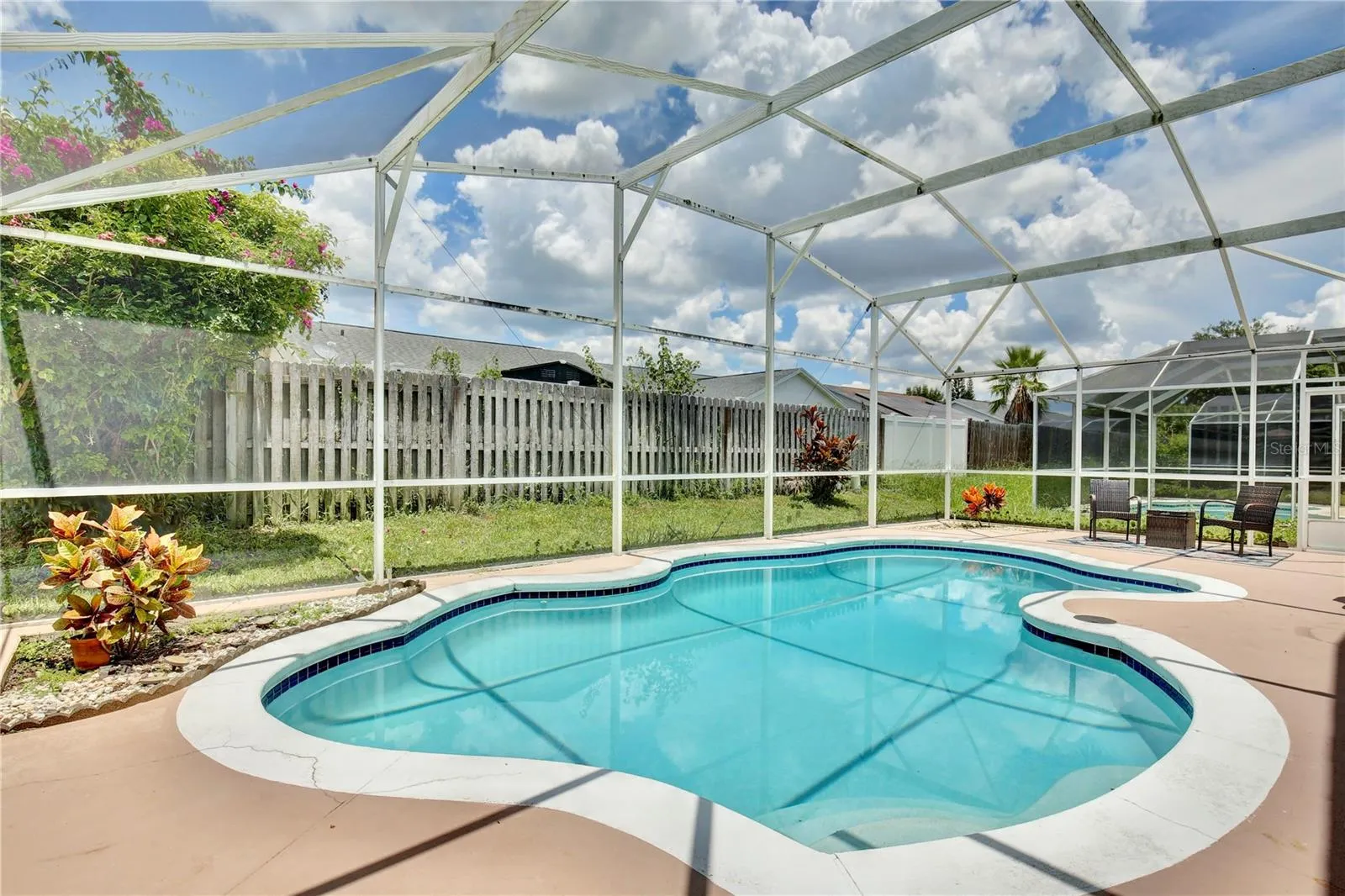 Discover the epitome of Florida living in this beautiful three-bedroom, two-bathroom residence, where every day feels like a vacation! Boasting curb appeal with landscaping and tropical palm trees, this house welcomes you through a cheery blue door into an elegant interior accentuated with arched walkways, stately columns, crown molding, cherry wood-style floors, and vaulted ceilings that amplify the natural light. The ROOF was replaced in 2017, offering peace of mind and added value. Host guests effortlessly in the stunning dining area where a radiant chandelier sets the tone, seamlessly transitioning into the living room framed by graceful archways. The generously sized kitchen is a chef’s delight with its sleek granite counters, stainless steel appliances, glass door cabinets, pantry storage, and breakfast nook for casual dining. The living room features an accent display wall and provides an inviting atmosphere with picturesque views of the serene pool through sliding glass doors. Find solace in the light and airy primary suite adorned with elegant wainscoting and trim, tranquil pool vistas, and a walk-in closet with custom built-ins. The primary bath offers dual sinks, granite counters, a bathtub, and a glass door shower. A versatile bonus room with double door entry offers serene pool views, perfect for a home office or creative space. Two inviting guest bedrooms with vaulted ceilings are located on each side of the guest bath, featuring a granite counter vanity and tub/shower combo. Outside, relax under the shade of the covered patio with wood plank ceilings and take a leisurely swim in the stunning lagoon-style pool. Community amenities include a playground, picnic area, pickleball court, and a pool with water vistas. With its proximity to Disney World, Publix, Walmart, Kissimmee Gateway Airport, and Highway 192, this home is a true retreat. Experience the best of Florida leisure—feed gators at Gatorland, enjoy retail therapy at The LOOP, revel in Old Town’s car show parade, and embrace the magic of Disney World. Home is also zoned short term rental and can be used for holiday rentals. Don’t miss the opportunity to make this dream home your reality. Schedule a showing today and claim this gem as your own!