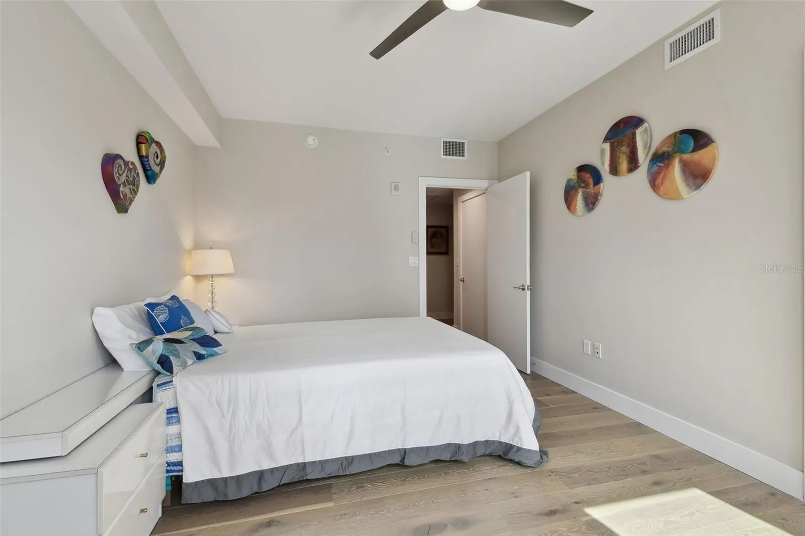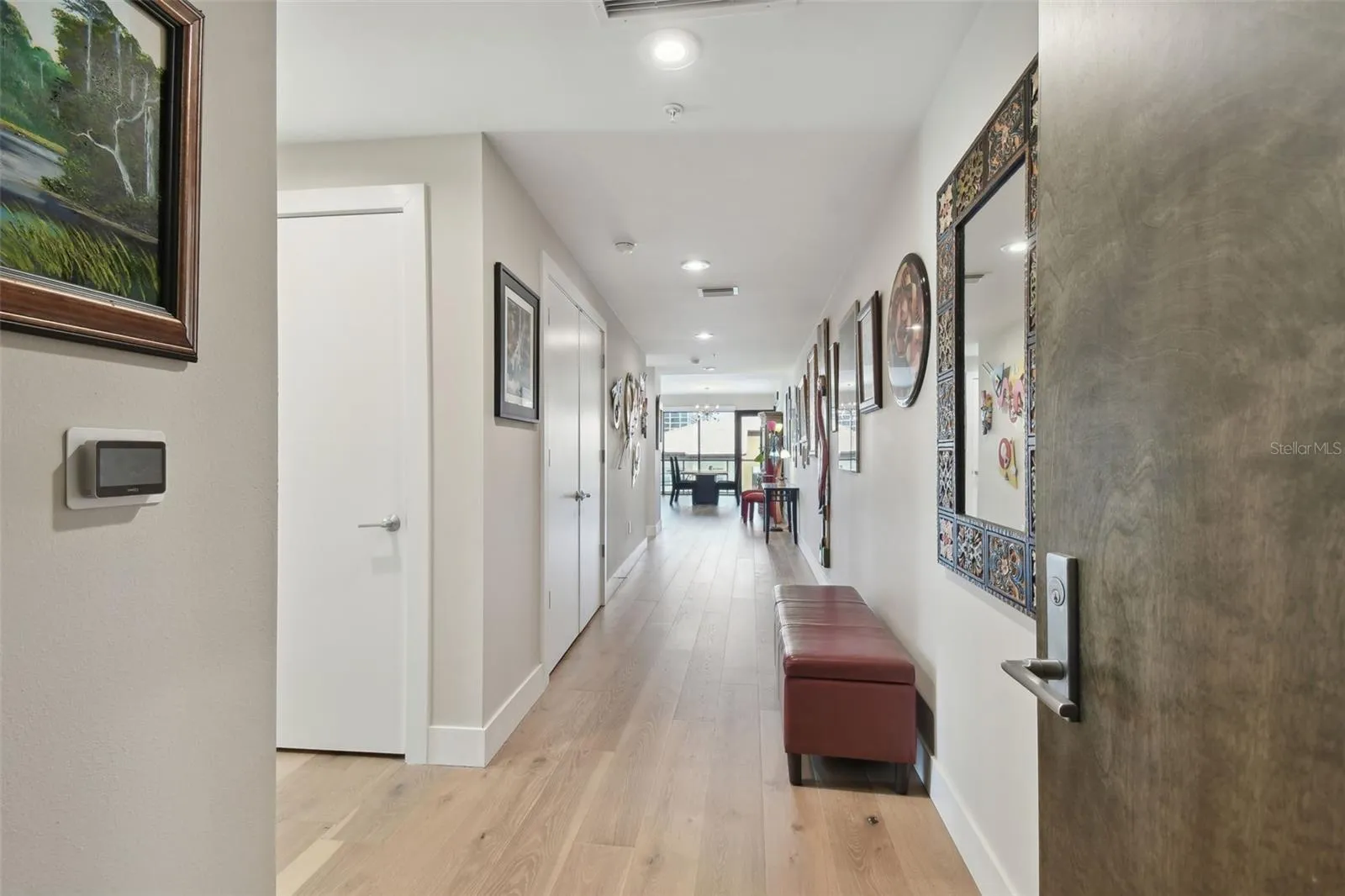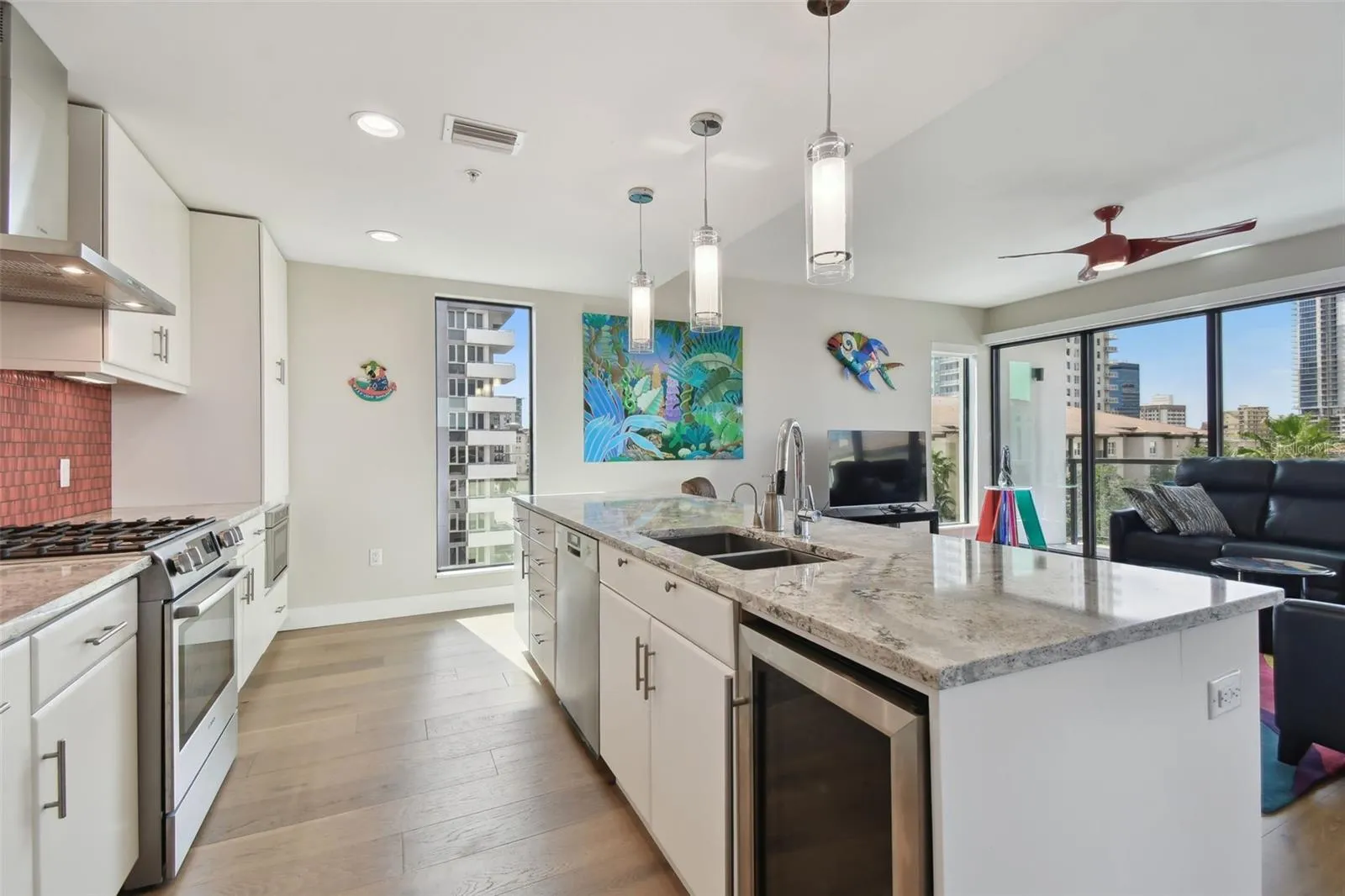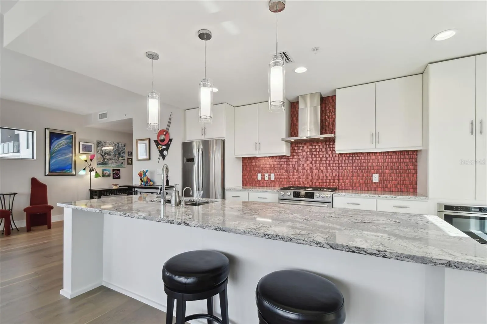 You’ll enjoy panoramic vistas of the city and Tampa Bay from the spacious balcony with room for plenty of seating and no adjacent neighbors. Step inside and you’re welcomed by a spacious Gallery Hall—perfect for showcasing art and setting a dramatic tone for what’s ahead. This 1,555-square-foot, 2-bedroom, 2-bath home stands apart with windows on three sides, flooding the open floor plan with natural light and ever-changing views. The living and dining areas are framed by floor-to-ceiling glass and outfitted with motorized blinds for effortless ambiance control. The sleek, contemporary kitchen features upgraded countertops and cabinetry with custom pullouts, a natural gas range, wine cooler, and smart storage throughout. Design details shine here—upgraded dimmers, modern lighting, and stylish ceiling fans add a layer of refinement. The primary suite is a serene retreat with a generous California Closets walk-in and a spa-inspired bath complete with a deep soaking tub, oversized shower, and dual-sink vanity. The second bedroom includes a custom-built queen Murphy bed with integrated desk, making it ideal as a guest room, office, or both. Blackout and shade blinds are installed in both bedrooms for maximum comfort. A dedicated laundry area with custom cabinetry adds convenience, and the included first-floor parking space is a major plus. The Salvador—an exclusive, LEED-certified building of just 74 residences—offers outstanding amenities: pool and spa, state-of-the-art fitness center, social room, grilling area, dog park with wash station, sculpture garden, and outdoor fire pit. Concierge service and on-site management elevate the lifestyle. Set in a peaceful pocket just blocks from downtown, the Dali Museum, Mahaffey Theater, Albert Whitted Airfield, and the Saturday Morning Market, this residence blends privacy, luxury, and location like few others. Schedule your private tour today.