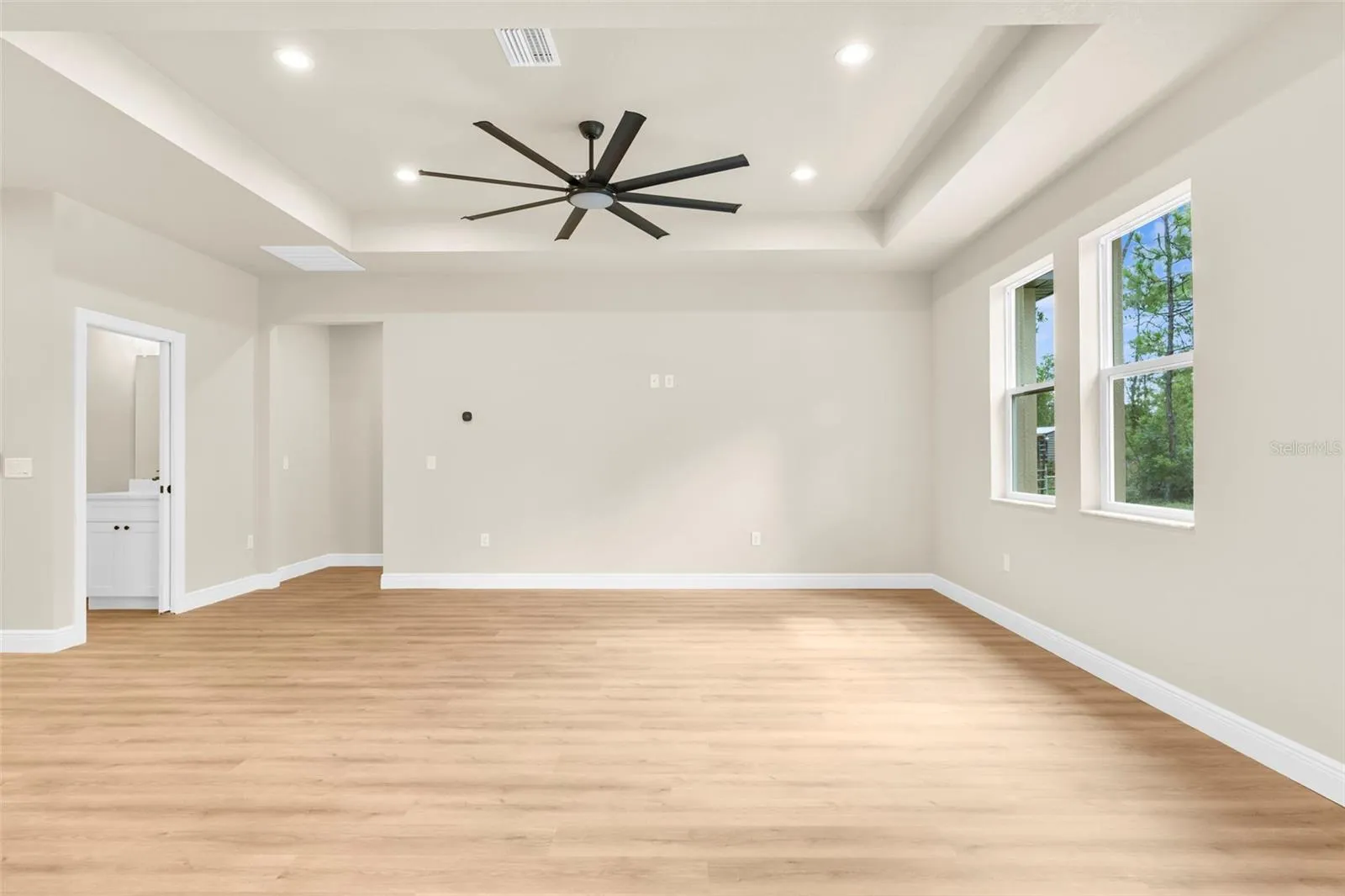 The front porch with stone accents greets you and your guests!! Entertain your family and friends in this grand living space which is the centerpiece of the home with a large open great room, island-style kitchen and dining room all with 10′ ceilings!! The high ceilings and open space offers you a large open spacious feeling where your family can gather for years to come! Every inch of this custom home is upgraded and attention was paid to every inch and every detail including designer faucets and lighting, upgraded baseboards, upgraded windows/sliders, and continuous Luxury Vinyl Plank flooring throughout the entire home (no carpet)! The upgraded kitchen offers stunning countertops with the modern large, single-level island with breakfast bar big enough for the whole family! Real wood upgraded 42” soft-close cabinets with a stunning backsplash for that finished luxury look and feel. New stainless steel, upgraded appliances! Generous-sized pantry! The home has a split floor plan offering privacy to the owner’s suite with a large ensuite bathroom! The 4th bedrooms is a great option for those who work from home or need that extra room!