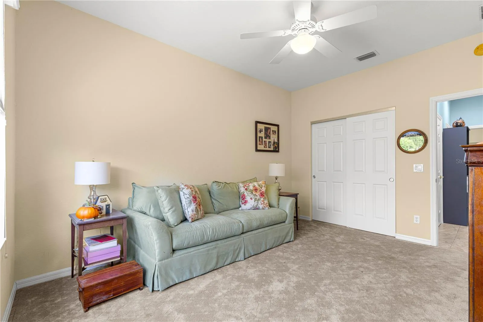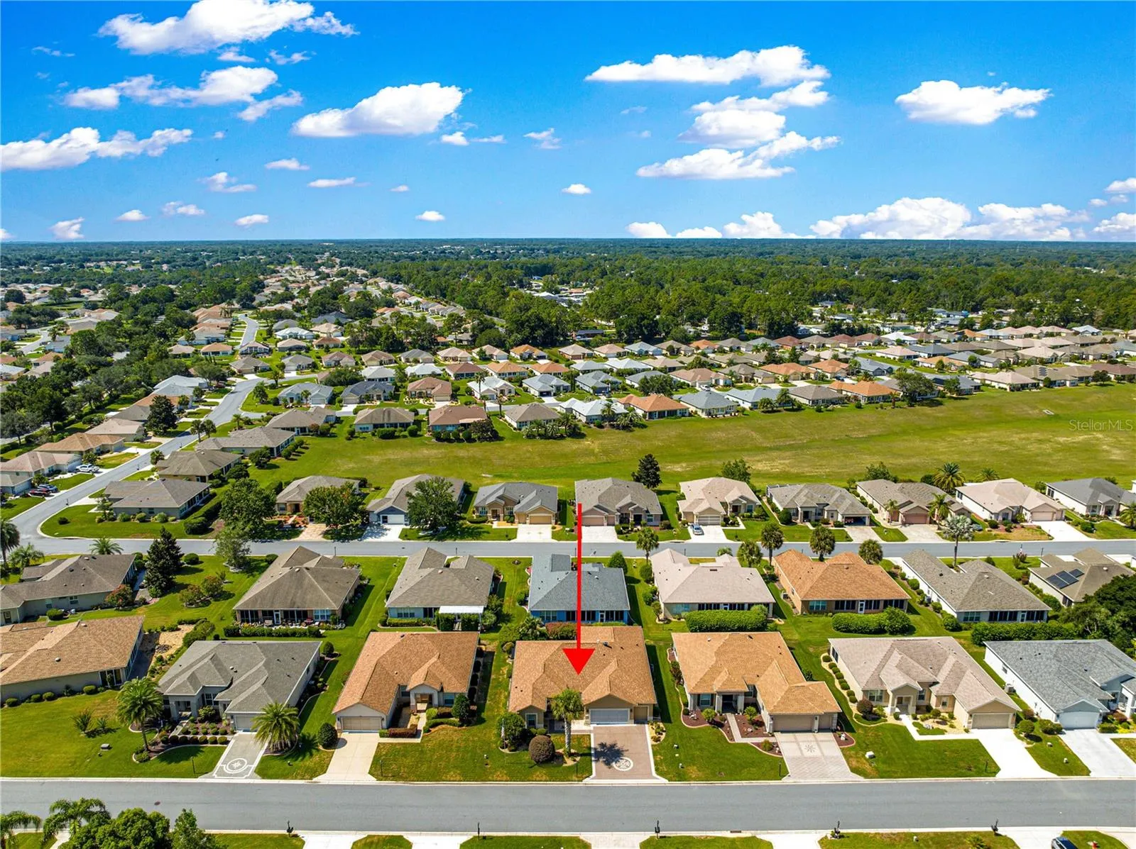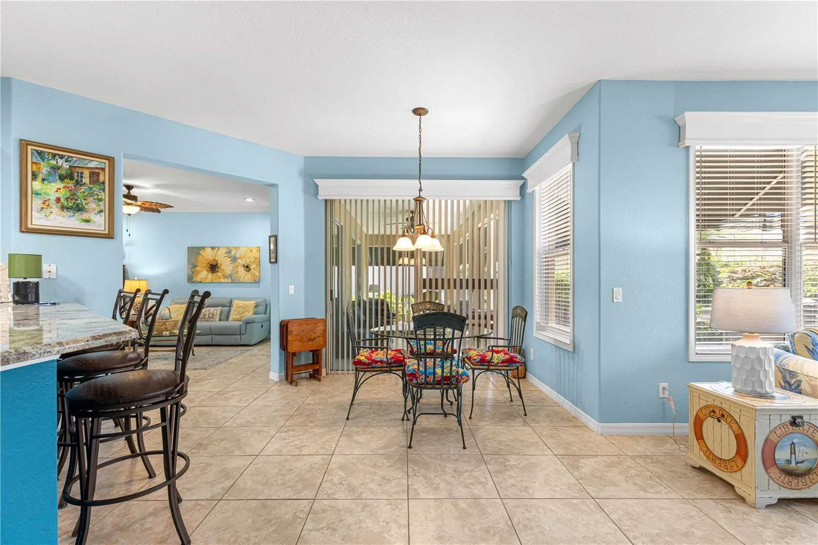 Welcome to this beautifully updated and maintained 3-bedroom 2 bath Kingston floor plan, offering 2,413 sq ft of heated and cooled living space in the highly sought after Del Webb Spruce Creek Golf & Country Club. Built in 2005 with concrete block and stucco construction, this home impresses from the start with outstanding curb appeal-a custom painted driveway, double garage with sliding screen door, and a separate golf cart garage, front brick paver patio, and elegant double leaded glass entry doors. Inside, you’ll find a large open area with a foyer, formal living and dining room, detailed with crown molding and newer 18-inch tile flooring throughout the main living areas, windows are adorned with wood cornices. The split floor plan offers ideal privacy. The spacious primary suite features sliding glass doors with direct access to the Lanai, a huge walk-in closet, and a luxurious en-suite bath with soaker tub, frameless glass double shower, raised sinks, and raised toilet, with dual vanities and ample storage. The modernized kitchen is an entertainers dream, showcasing granite countertops, tile back splash, upgraded solid wood cabinetry, black stainless-steel appliances, and a solar tube for natural light, while the breakfast bar overlooks both the nook and light-filled great room. The guest wing features two comfortable sized bedrooms and a full guest bath. Enjoy Florida’s beautiful weather year-round from the screened Lanai or relax or grill on the open rear brick paver patio. The home is beautifully landscaped with concrete curbing and includes underground dog fencing. Additional recent updates include roof re-shingled in 2022; HVAC 2020 and the home has been re-piped as a preventative measure in walls and ceiling. This home is truly move in read, seller has priced home for a quick sale!