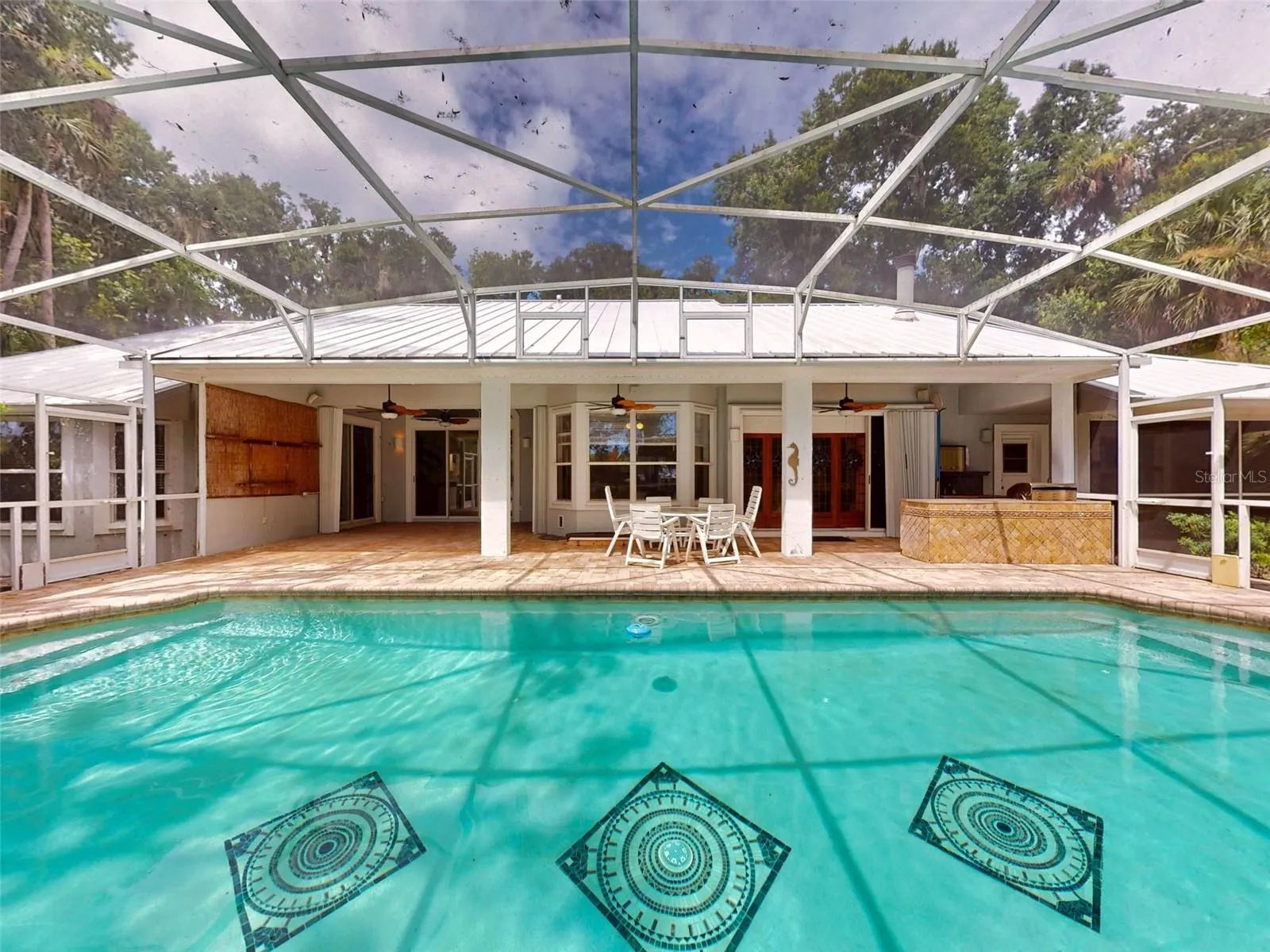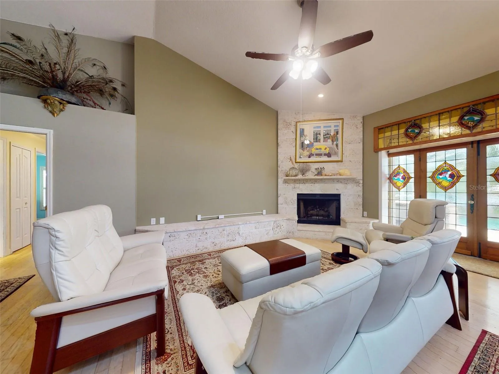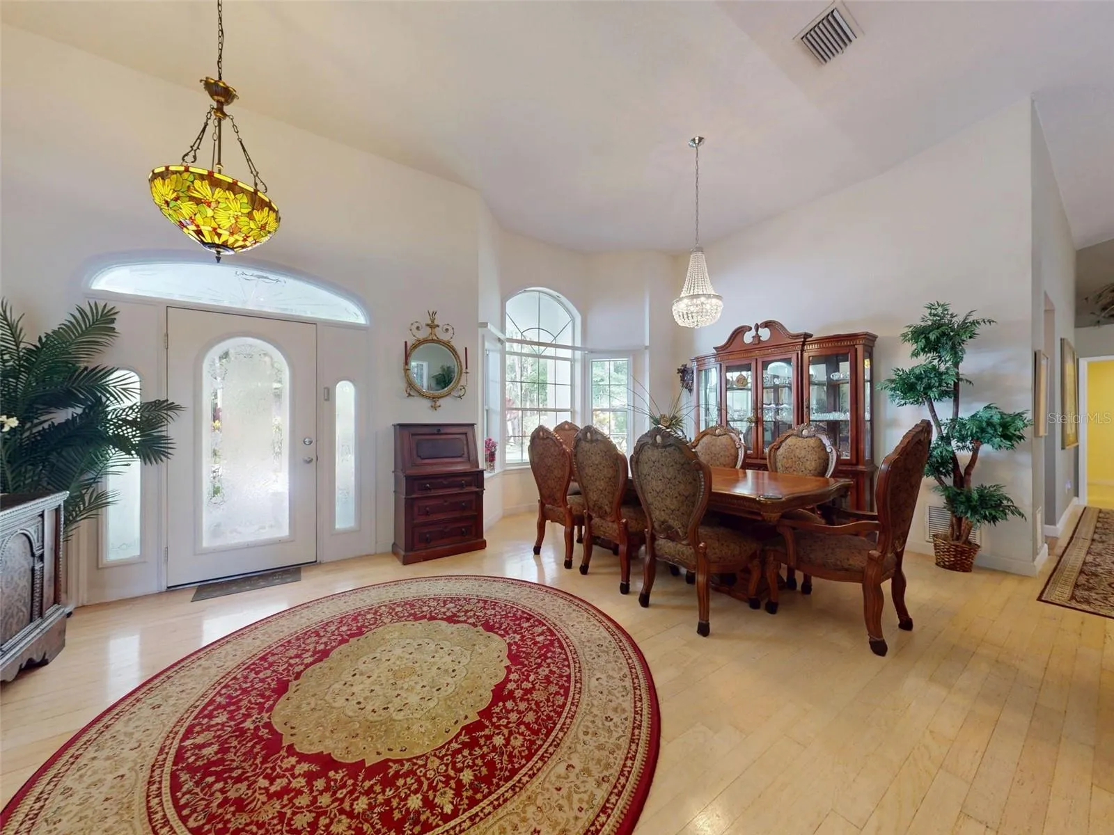Beautiful 4 bedroom, 3 and a half bath, lakefront, pool home located in the highly desired gated community of Lake Waterford Estates in New Smyrna Beach. Lake Waterford is a 75 acre, spring fed lake perfect for boating, skiing, fishing and a number of other water sports. This spacious home sits on a 1.75 acre lot which is lush with a variety of mature trees, fruit trees and beautiful flora. Enter this home through the welcoming foyer where the eye is immediately drawn to the serene view of the tranquil lake in your own backyard. This home was designed for entertaining with a distinguished formal dining room and formal living room. The large primary bedroom, with expansive windows, letting in the beautiful views and two individual walk-in closets, will be a welcomed retreat at the end of the day. The ensuite bath comes equipped with double sinks, separate shower and a jetted garden tub. The 3 spacious guestrooms, each with ample closet space and natural light streaming through the windows, are comfortable and inviting. The hub of this amazing home is the open-concept, family room, dining nook and kitchen. This kitchen is a chef’s dream with granite counter tops, stainless-steel appliances, gas stove and plenty of storage space. The kitchen opens to a dining nook and family room. As you enter the family room you are drawn to the massive natural stone fireplace. Exit the family room through custom, stained-glass french doors to your sparkling, screened-in pool and classic pavered patio deck. Sit and enjoy your morning coffee as you take in the beauty of life on the lake.