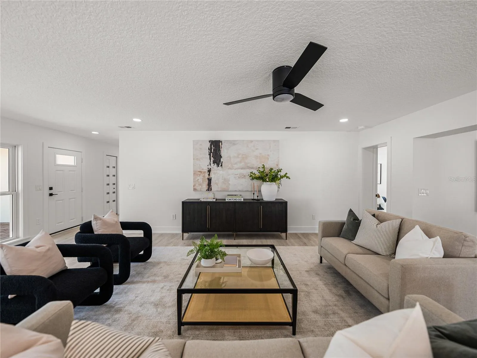 From the moment you arrive, you’re greeted by a striking modern exterior with fresh landscaping, lush palms, a circular paver driveway, and an inviting turquoise front door that sets the tone for the refined interiors within.