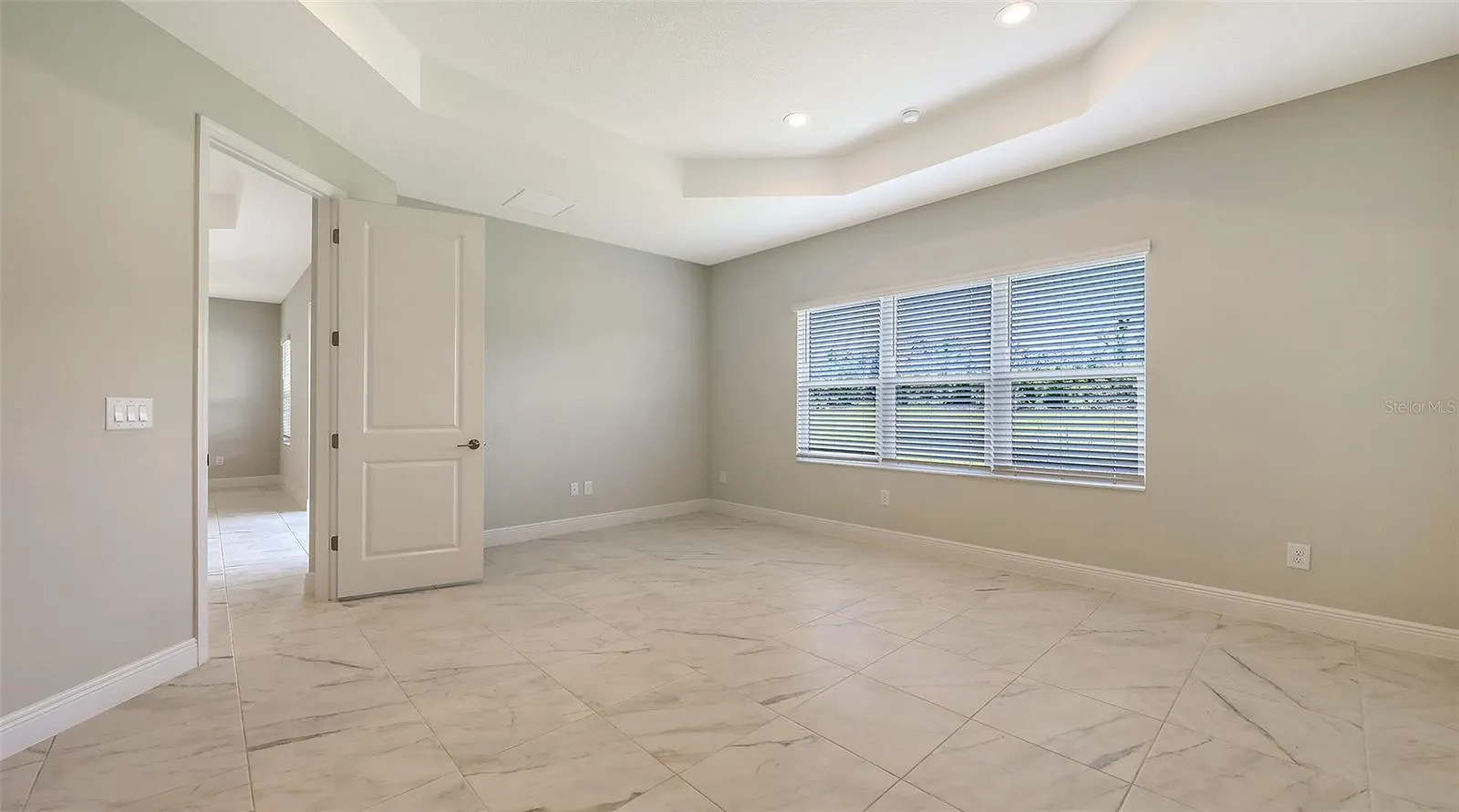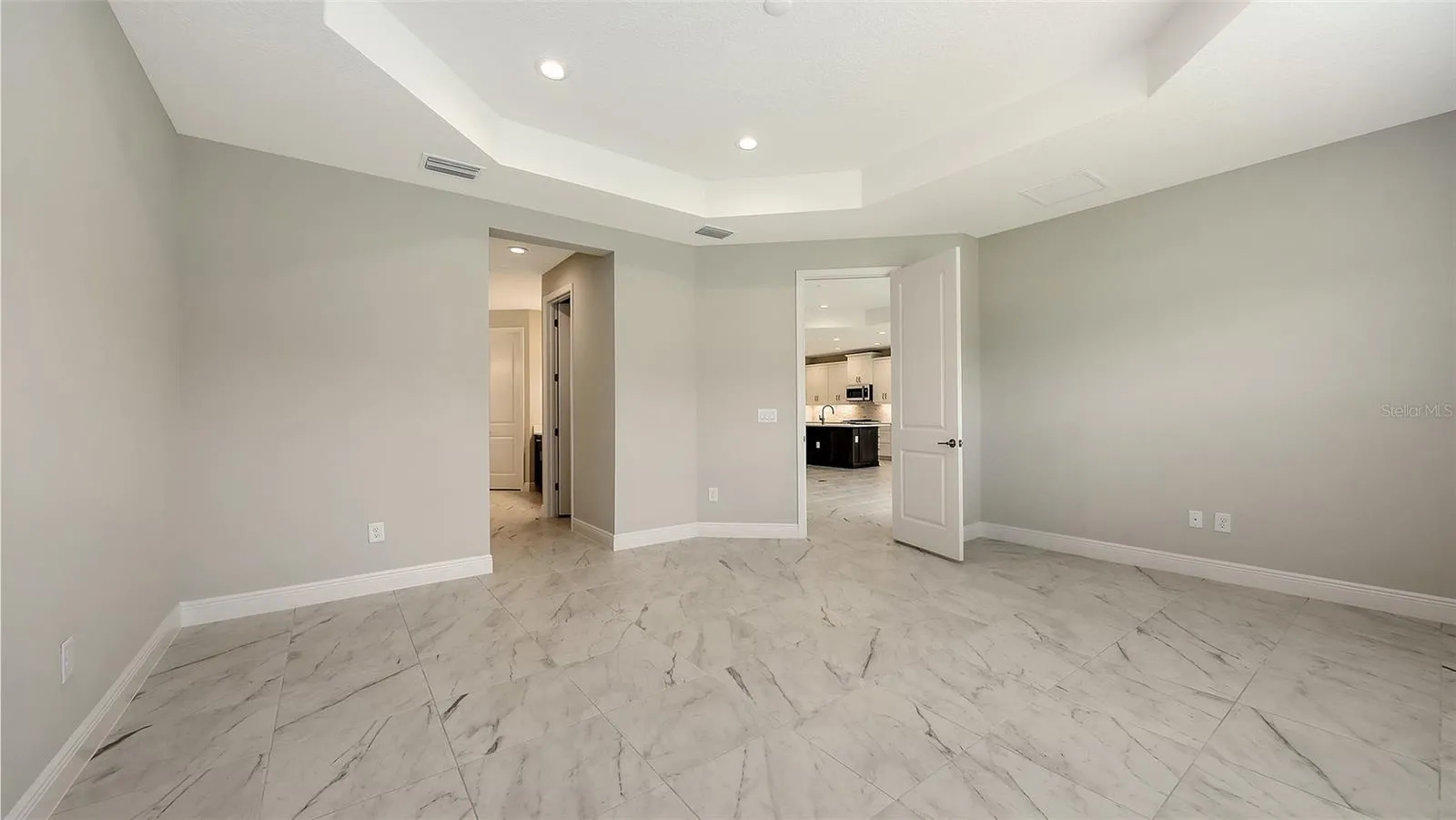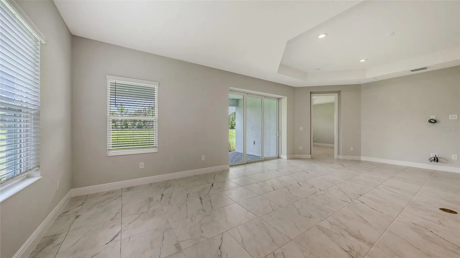 Enjoy seamless indoor-outdoor living in the great room with an octagonal recessed ceiling and pocket sliding glass doors leading to the covered lanai.