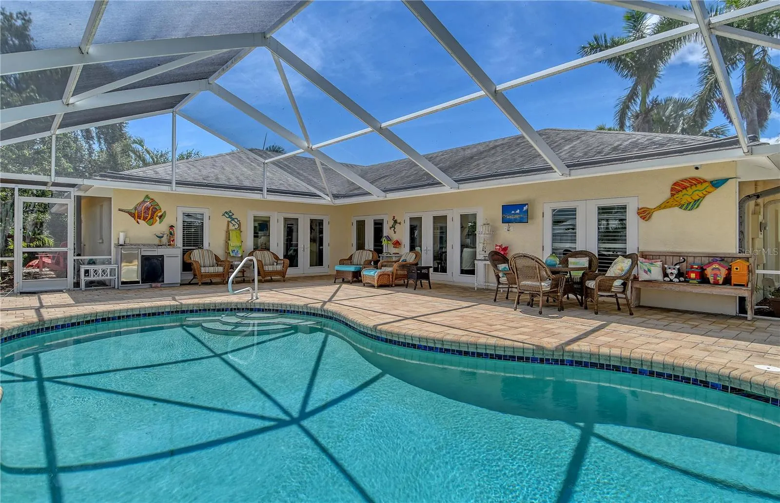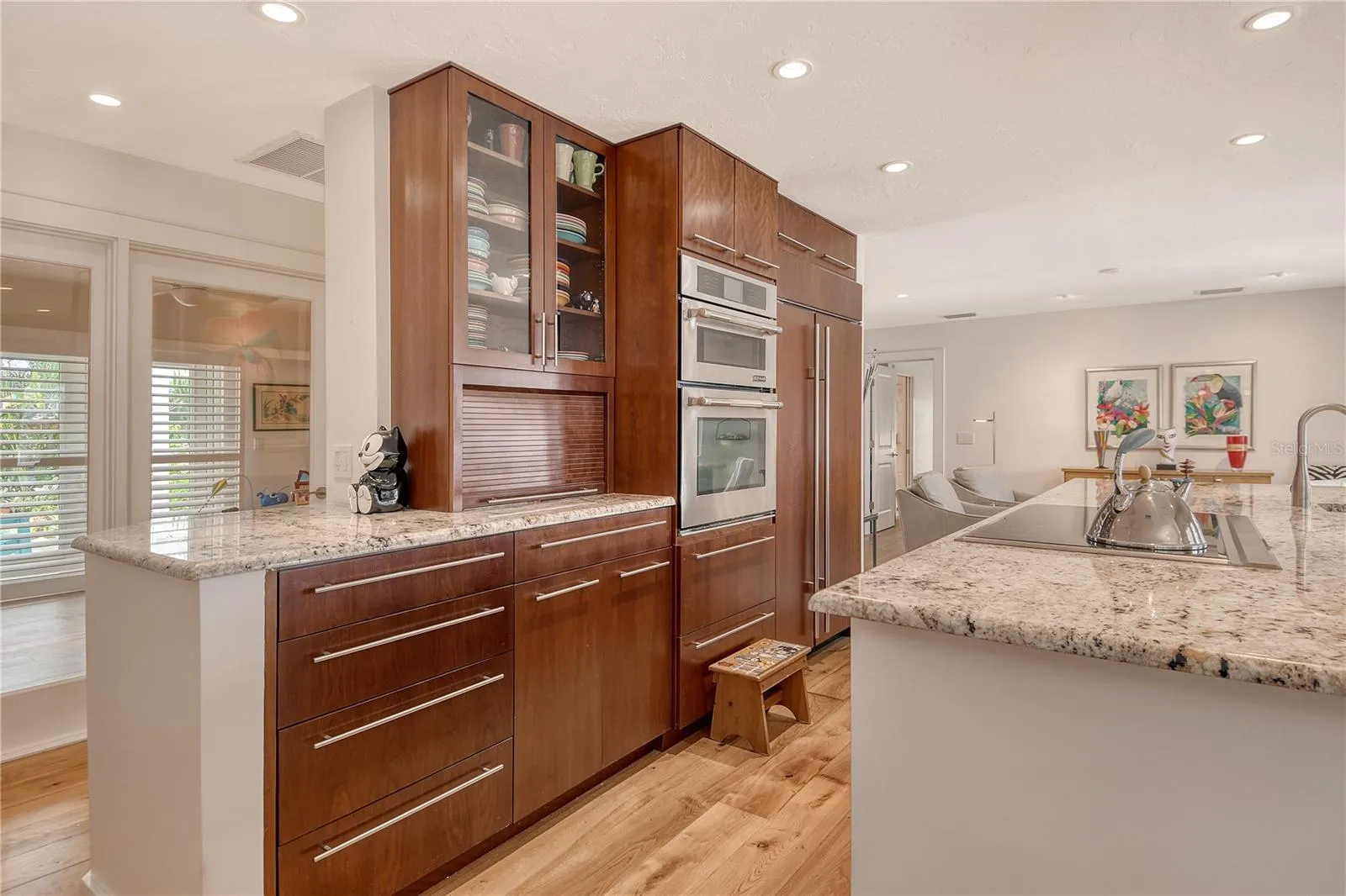 Only rarely will you find a home in NW Bradenton like this gem! Sitting high and dry with all hurricane impact windows and doors, you’ll be able to relax and rest easy here. No expense was spared in its total customization in 2013, and it has been lovingly maintained and continuously upgraded ever since. As soon as you step into the lushly landscaped front yard, the street and the neighbors disappear, and you feel enveloped in a verdant oasis of privacy and quiet. Survey it all from your shaded front patio before passing through the glass front doors into the spacious foyer, and beyond to the dining area. French doors line the walls of the main living space with natural light, and at the center of it all you’ll find a gourmet kitchen with twin islands and sleek custom cabinetry wrapping around appliances from SubZero, Wolf, and Fisher-Pykel. All of this looks out onto the inviting solar-heated pool with plenty of shaded lounging area and a refreshment center. Off the kitchen is a walk-in pantry and laundry area with storage behind touch-open cabinet doors. Everywhere you look you will find the subtle details of a very particular and painstaking renovation process, including a smart triple split bedroom/bath floorplan and custom plantation shutters on every window. Unique features include a huge artist studio/4th bedroom (11 x 26) with built-in cabinetry that could put to any number of uses by the imaginative buyer, including being easily converted back into two separate rooms (which would bring the total to 5 bedrooms). Need an in-law suite? The studio has plenty of room and a separate, private side entrance off its own lounging deck, plus plumbing in place to easily add a small kitchenette. That whole wing with pocket door is served by its own luxurious pool bath. Each of the three bathrooms is a masterpiece of tile, granite and cabinetry, and the owners’ walk-in closet is full of custom shelving and hanging storage. Out in the garage you’ll find another unique feature: one parking space is a discreet air-conditioned extra room (9 x 19) that can be used for storage, a home office, or hobby room. It even has its own kitchenette area! If you’d prefer to have the second garage space, it’s a simple project to return it to its original configuration. Belair Bayou HOA is an enclave of 59 homes with low fees and minimal deed restrictions that does NOT allow short-term rentals, so the neighborhood maintains its quiet residential character. Whatever you’re in the mood for, you are in a great central location: In just minutes, you can take in the gorgeous Gulf beaches and the resort villages of Anna Maria Island. Just around the corner is the Warner’s Bayou boat ramp facility with easy access to the Manatee River and the Gulf beyond. Plus, you’re just a few miles from Robinson Preserve, a choice destination for hiking/biking/kayaking and near the Palma Sola Botanical Park and DeSoto National Park. There is so much to love about this versatile home, so come see it – and make it yours.