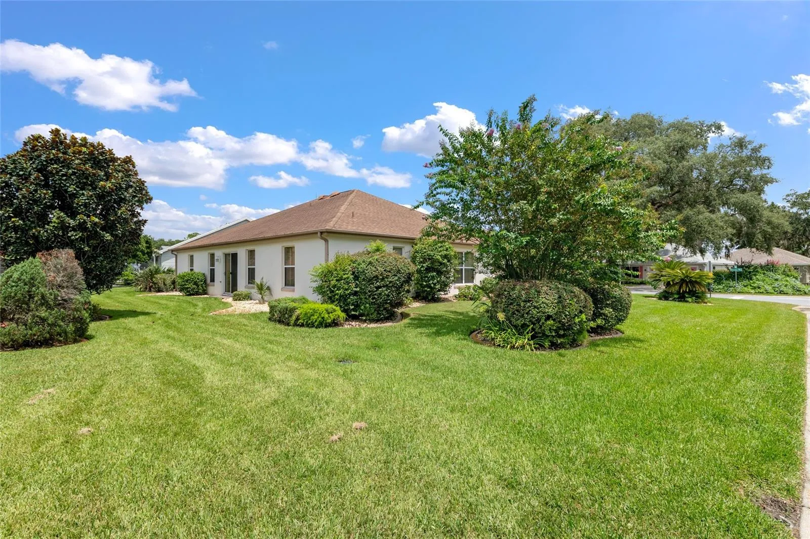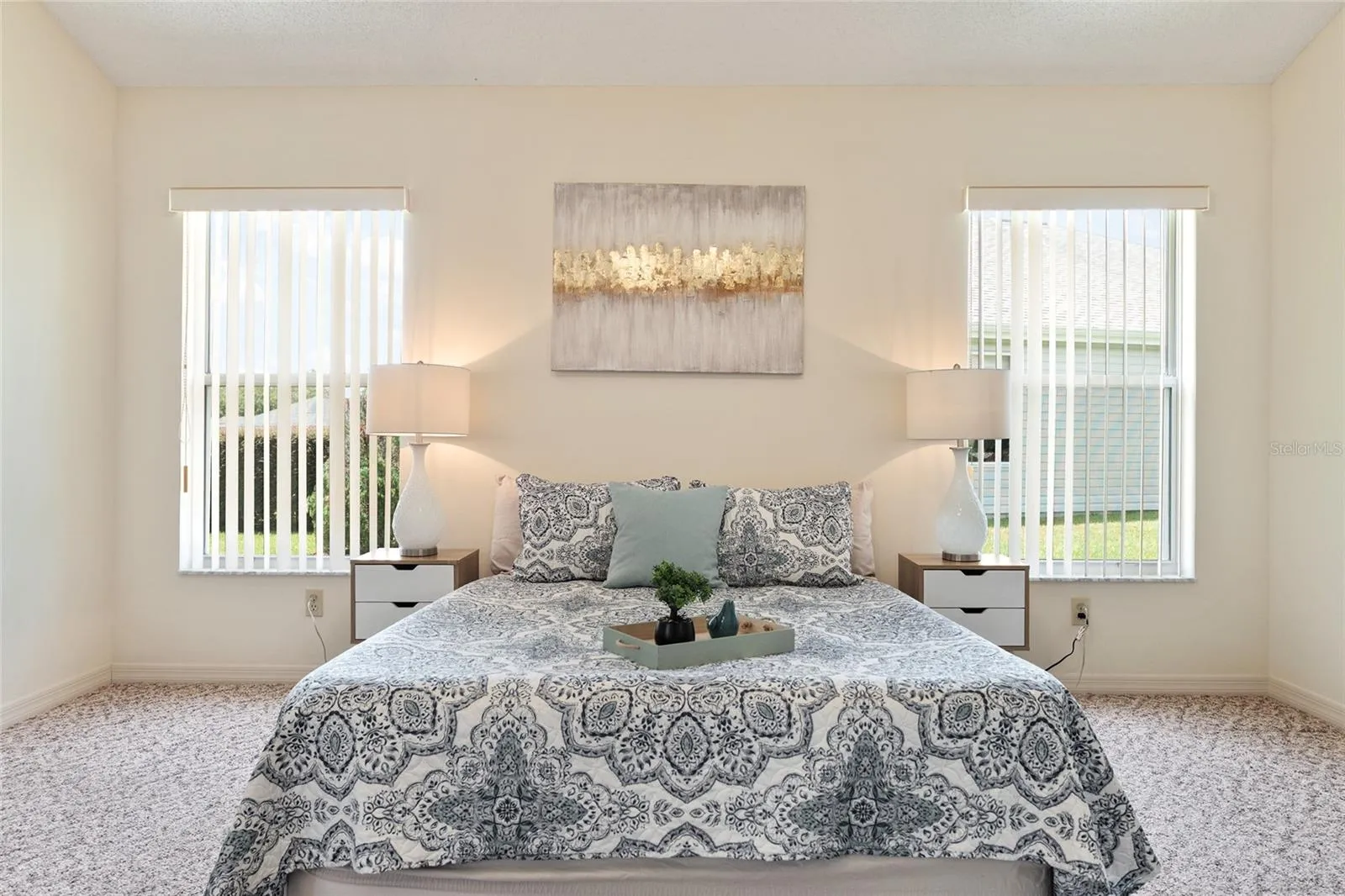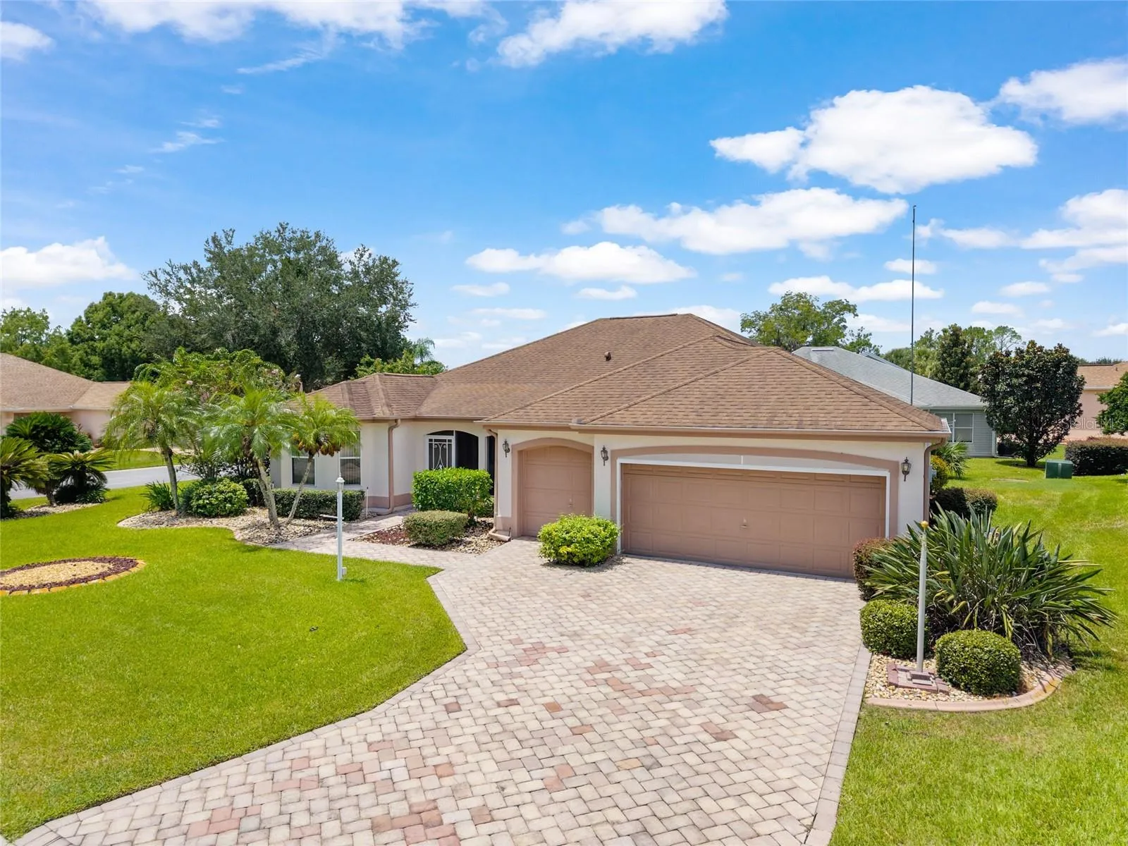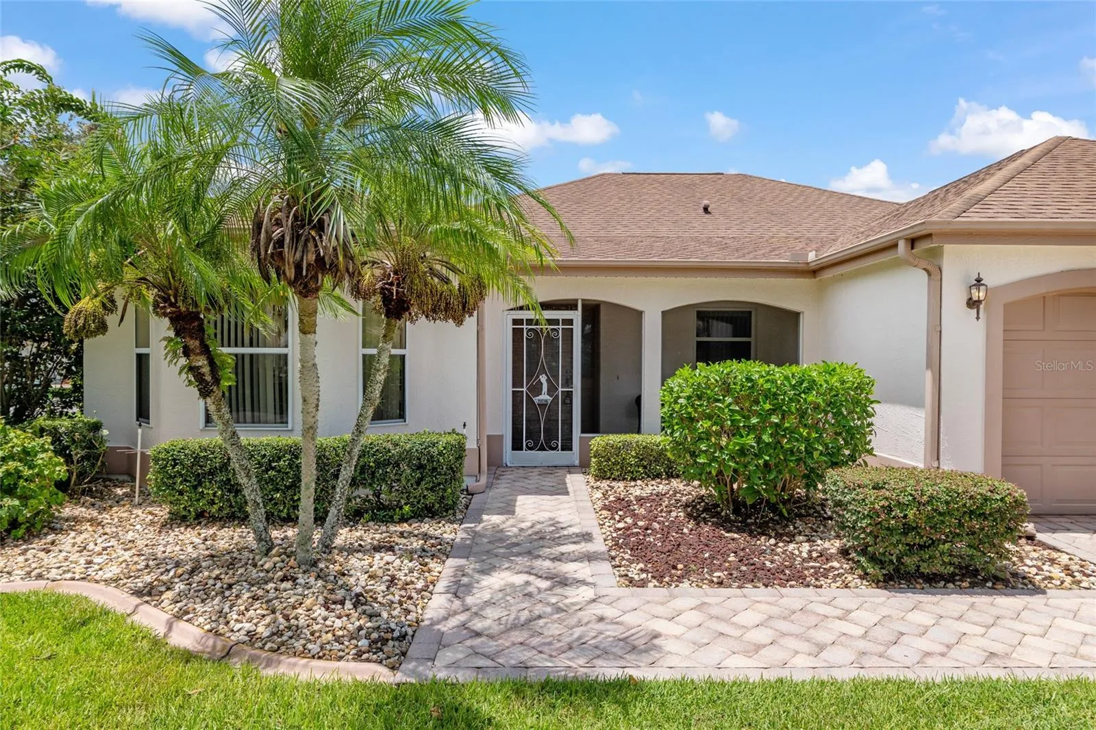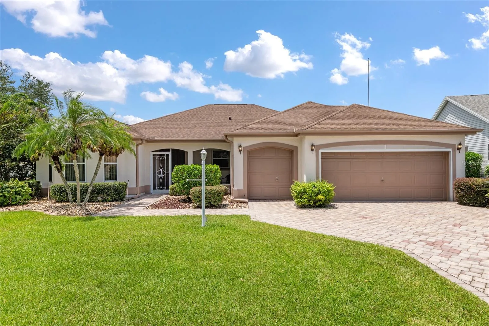 NO BOND, 2 MASTER SUITES, CORNER lot, and much more! This expanded BLOCK & STUCCO Vera Cruz Designer home features 3 bedrooms, 3 bathrooms, and a golf cart garage in the highly sought-after Village of De La Vista. As you approach this home, you’ll notice the pavered driveway and walkway, along with a QUAINT FRONT PORCH—perfect for relaxing and enjoying the fantastic Florida weather! Step inside the foyer to see a coat closet and tile flooring that extends throughout the kitchen and laundry room. The spacious kitchen features beautiful wood cabinetry, neutral-toned countertops, and a nook area with a bay window that brings in natural light. High ceilings in the expansive open-concept living and dining rooms create an airy atmosphere. The primary bedroom has vaulted ceilings, two walk-in closets, and an en-suite bathroom with wood cabinetry, double sinks, a makeup vanity, and a tub/shower combo. It features a split floor plan, accompanied by an additional primary suite that boasts vaulted ceilings, two walk-in closets, and an en-suite bathroom with similar features. The third bedroom includes built-in cabinets, a desk, and a walk-in closet, while the third bathroom is conveniently located nearby, making it ideal for guests or a quiet home office. The large interior laundry room offers shelving, a window that provides natural light, and extra space for a desk, an additional refrigerator/freezer, or extra storage shelves and cabinets.