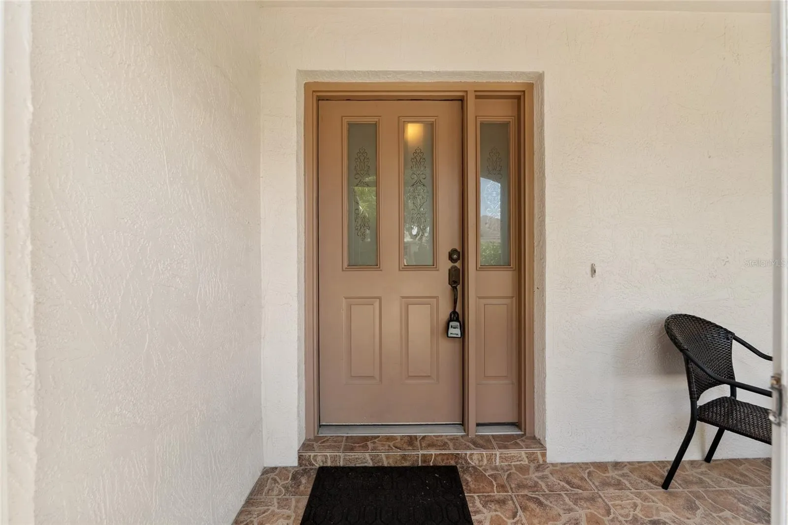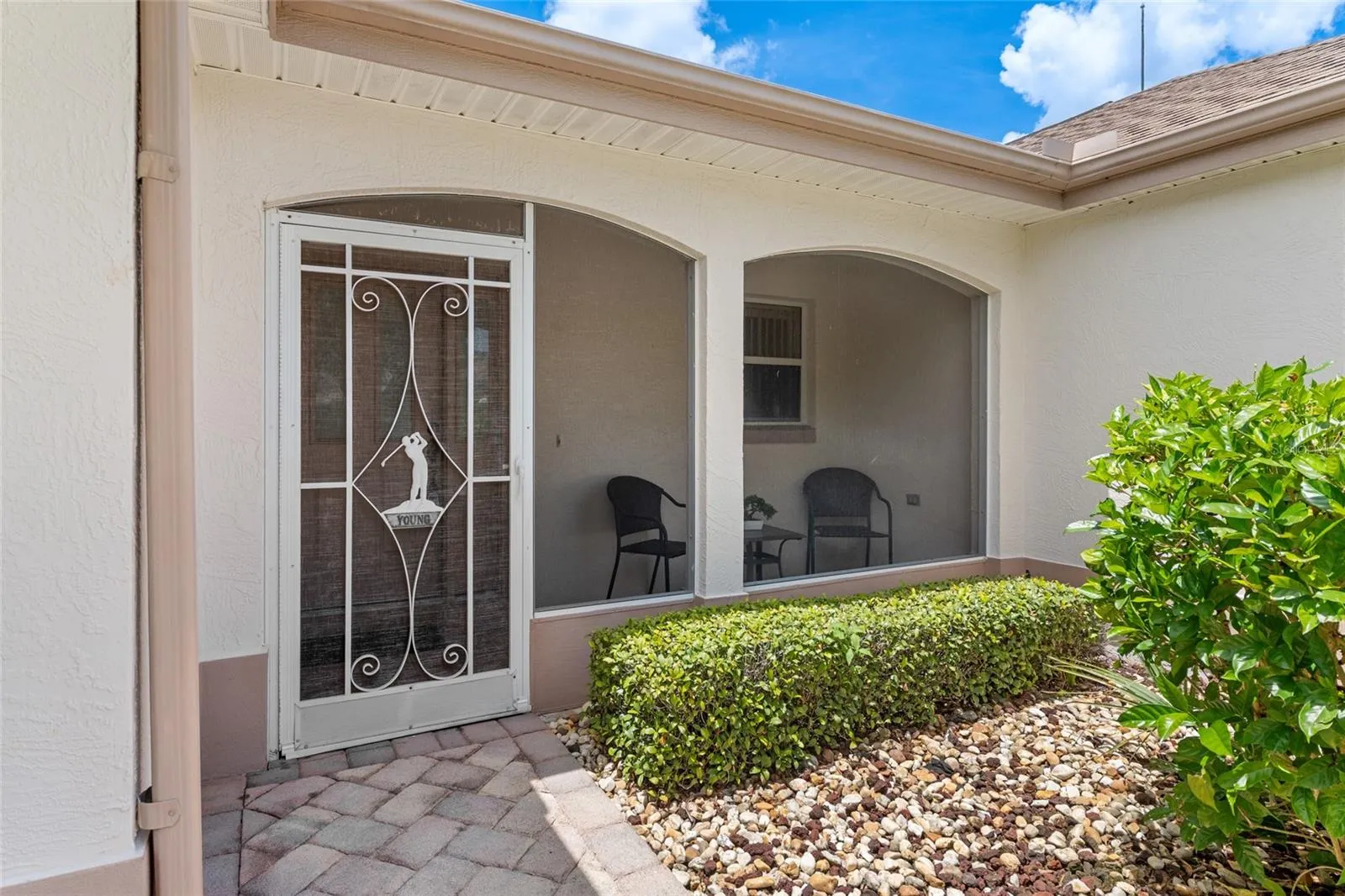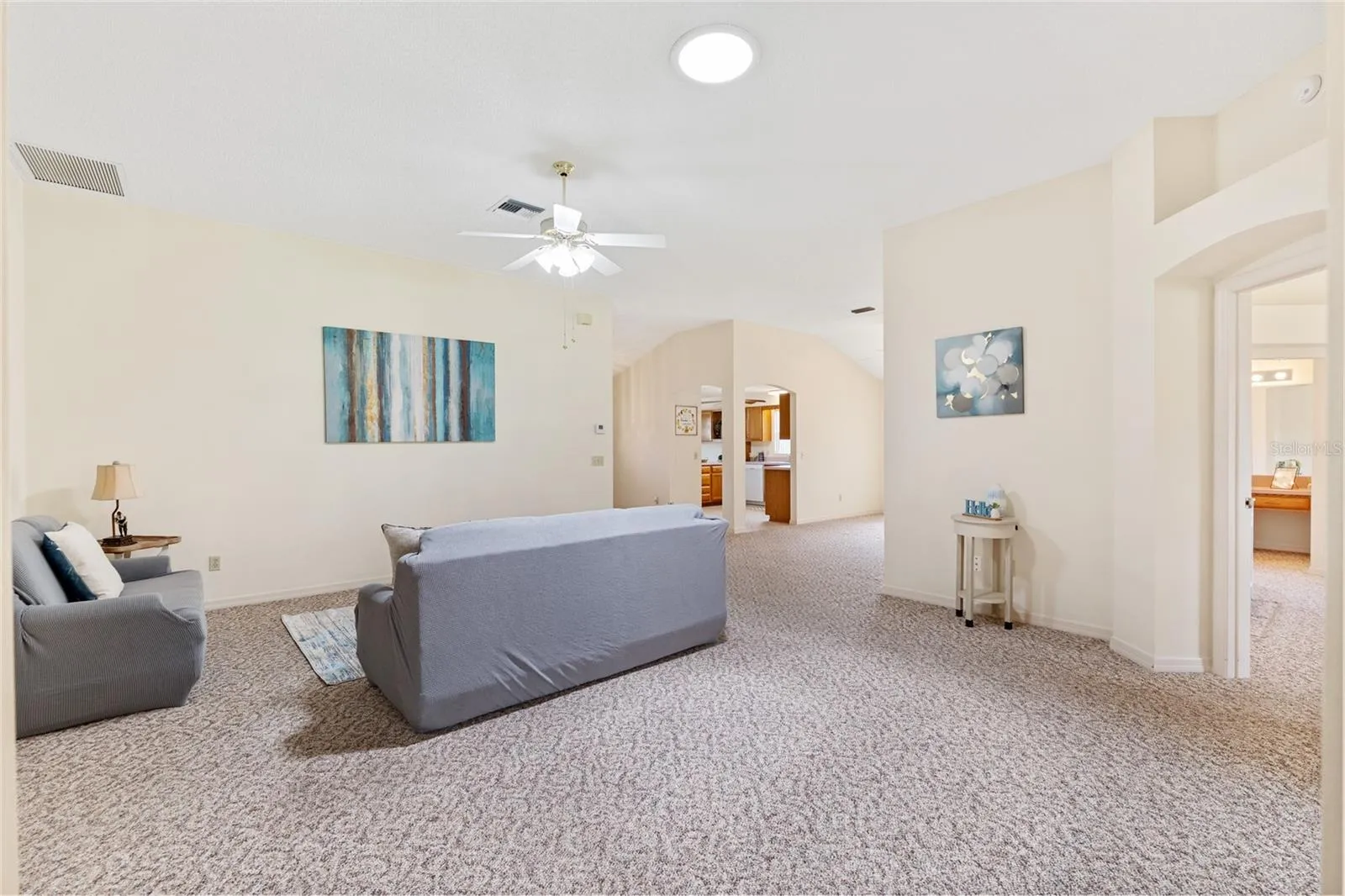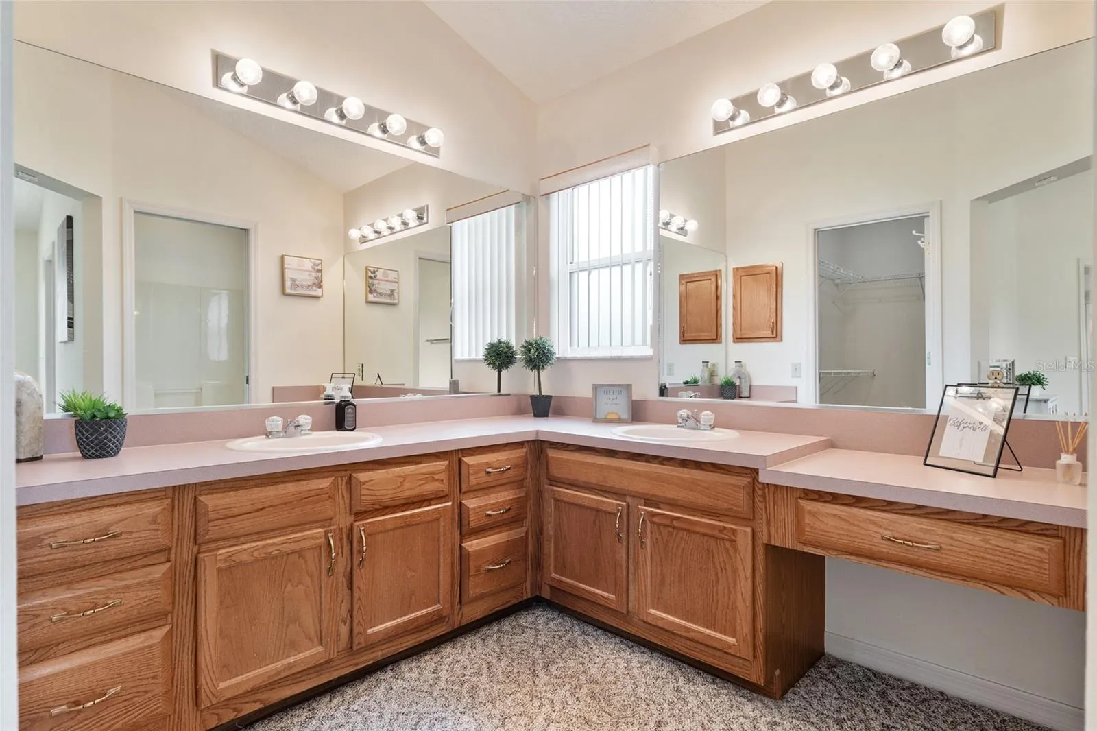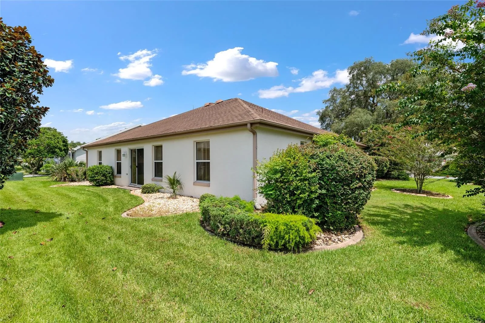 NO BOND, 2 MASTER SUITES, CORNER lot, and much more! This expanded BLOCK & STUCCO Vera Cruz Designer home features 3 bedrooms, 3 bathrooms, and a golf cart garage in the highly sought-after Village of De La Vista. As you approach this home, you’ll notice the pavered driveway and walkway, along with a QUAINT FRONT PORCH—perfect for relaxing and enjoying the fantastic Florida weather! Step inside the foyer to see a coat closet and tile flooring that extends throughout the kitchen and laundry room. The spacious kitchen features beautiful wood cabinetry, neutral-toned countertops, and a nook area with a bay window that brings in natural light. High ceilings in the expansive open-concept living and dining rooms create an airy atmosphere. The primary bedroom has vaulted ceilings, two walk-in closets, and an en-suite bathroom with wood cabinetry, double sinks, a makeup vanity, and a tub/shower combo. It features a split floor plan, accompanied by an additional primary suite that boasts vaulted ceilings, two walk-in closets, and an en-suite bathroom with similar features. The third bedroom includes built-in cabinets, a desk, and a walk-in closet, while the third bathroom is conveniently located nearby, making it ideal for guests or a quiet home office. The large interior laundry room offers shelving, a window that provides natural light, and extra space for a desk, an additional refrigerator/freezer, or extra storage shelves and cabinets.