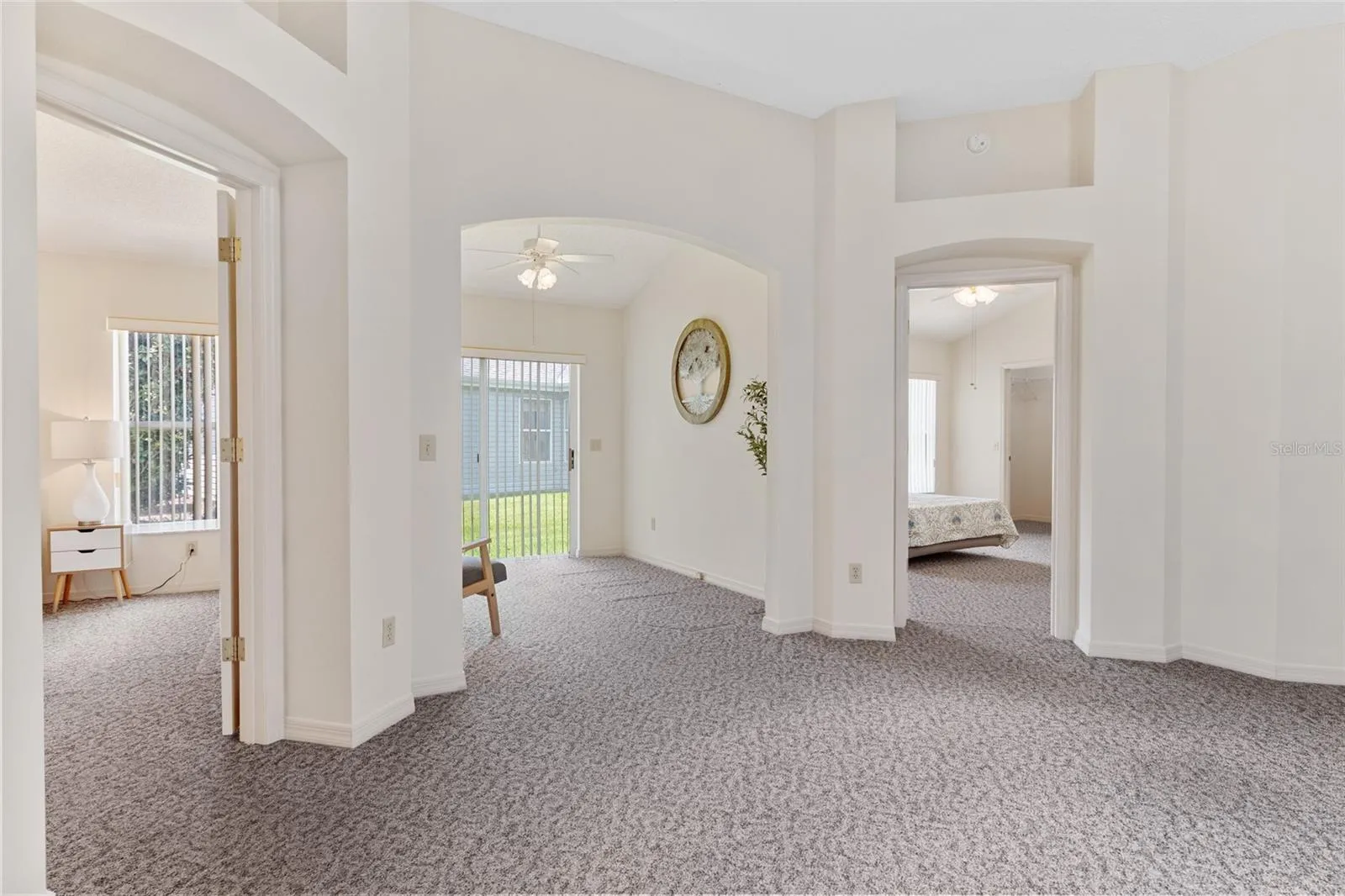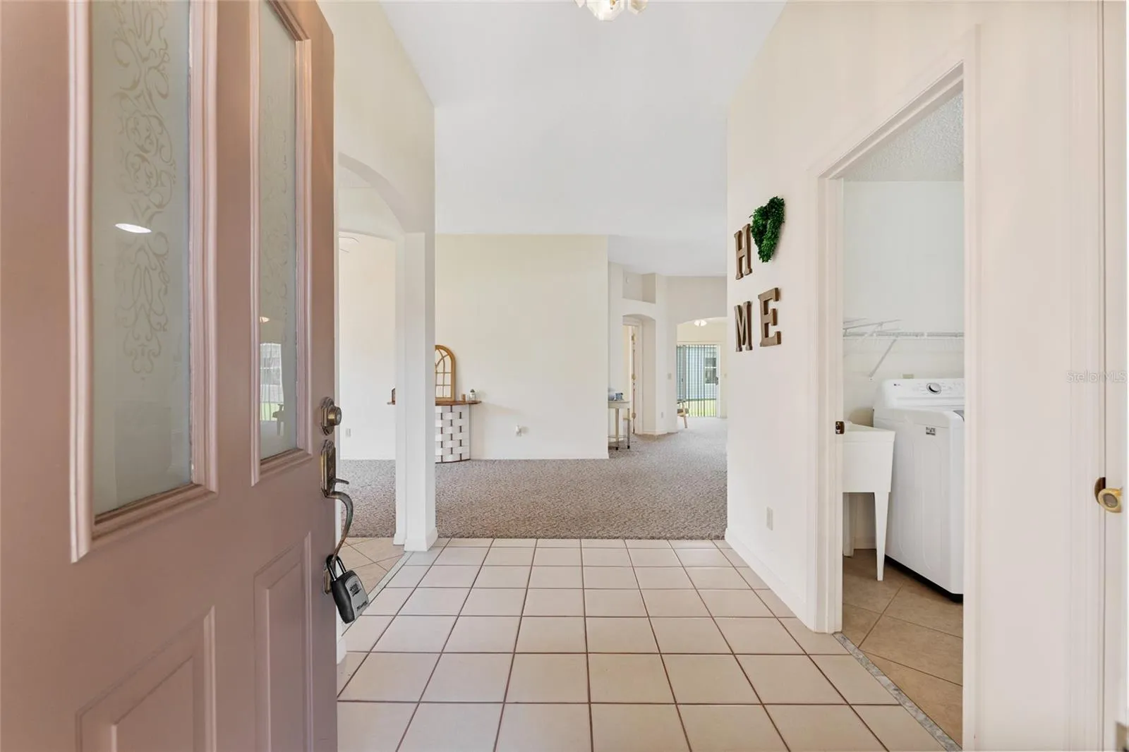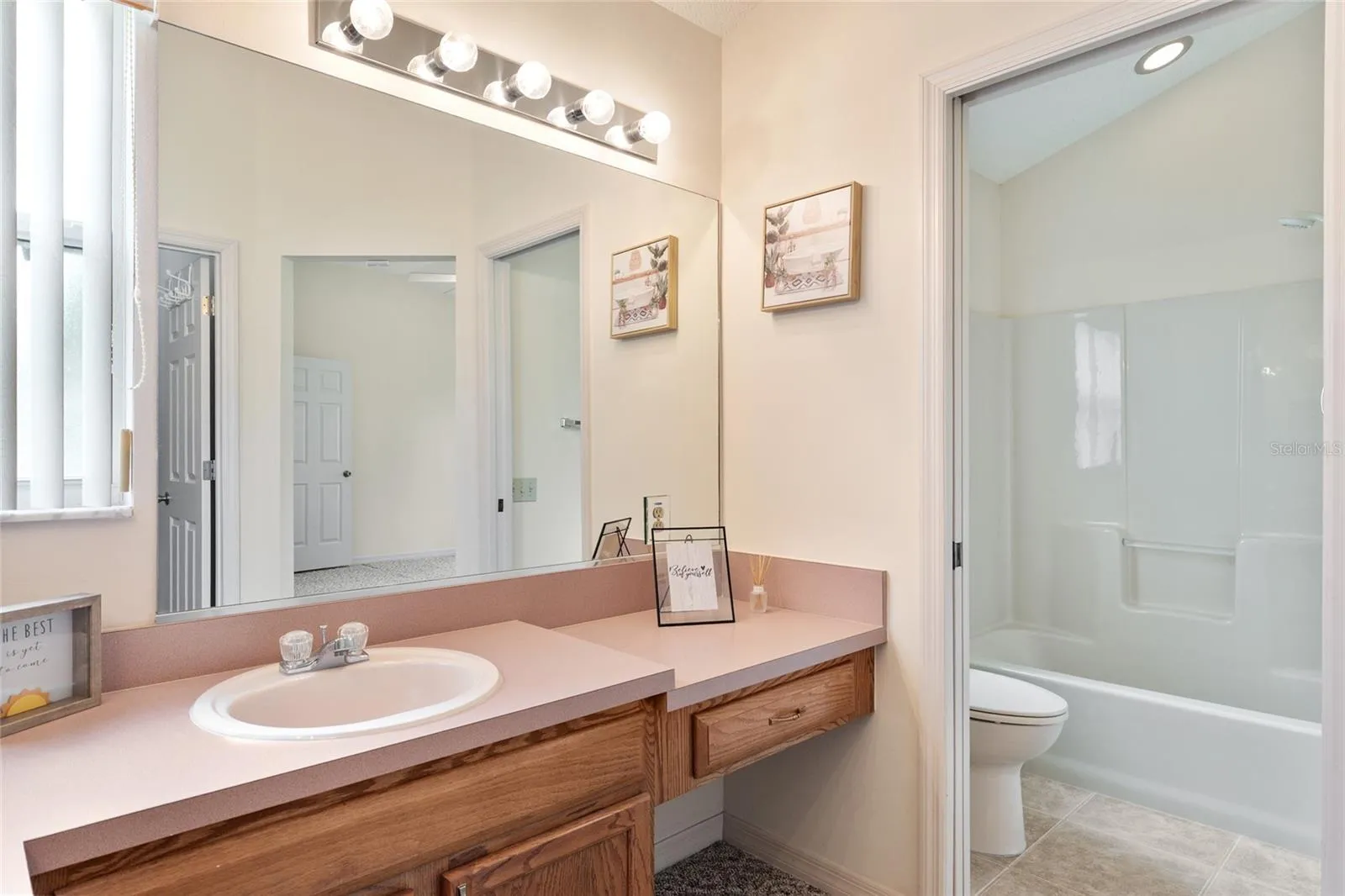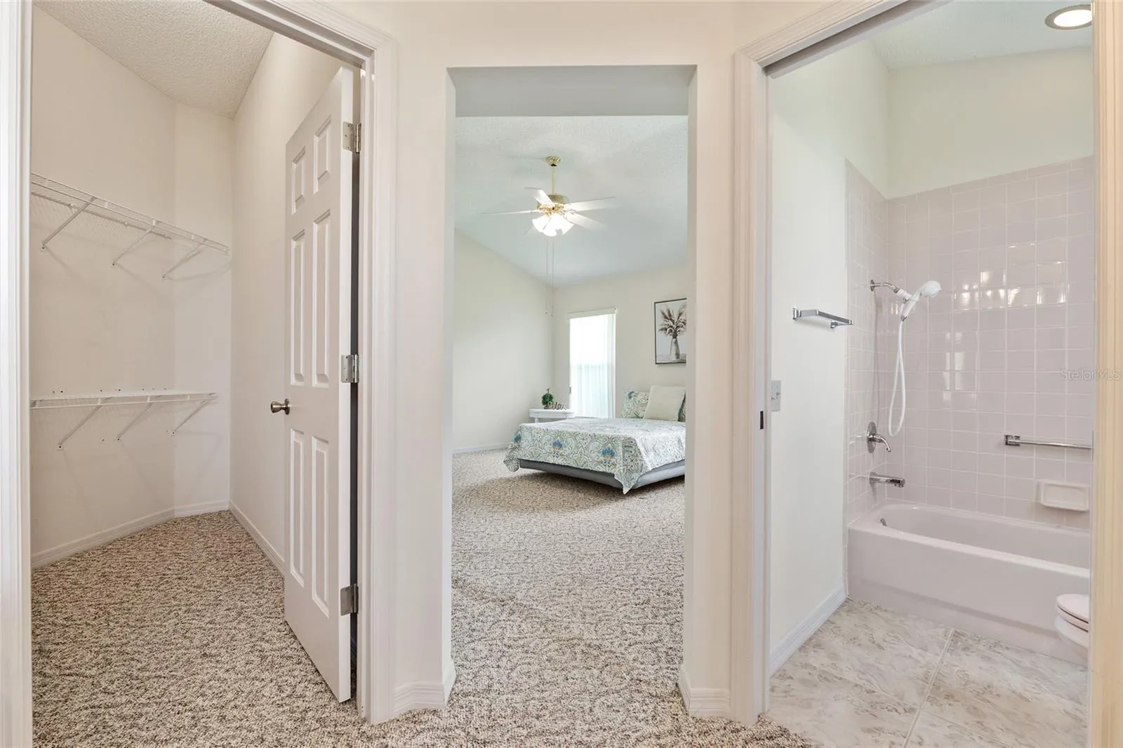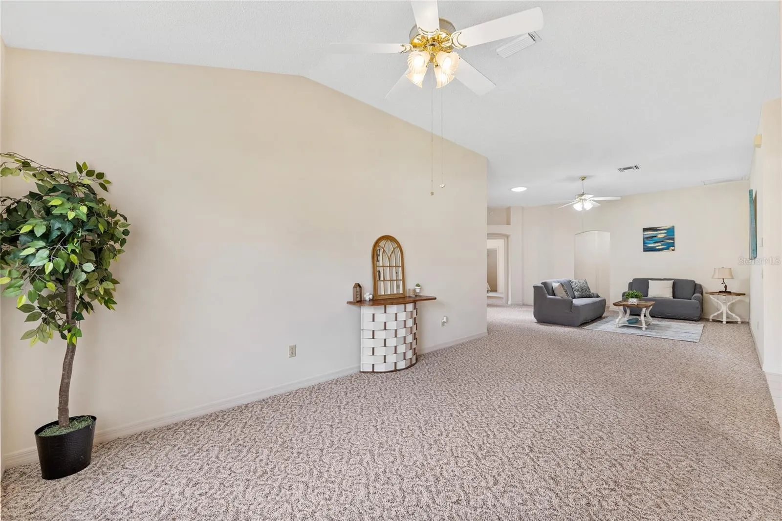NO BOND, 2 MASTER SUITES, CORNER lot, and much more! This expanded BLOCK & STUCCO Vera Cruz Designer home features 3 bedrooms, 3 bathrooms, and a golf cart garage in the highly sought-after Village of De La Vista. As you approach this home, you’ll notice the pavered driveway and walkway, along with a QUAINT FRONT PORCH—perfect for relaxing and enjoying the fantastic Florida weather! Step inside the foyer to see a coat closet and tile flooring that extends throughout the kitchen and laundry room. The spacious kitchen features beautiful wood cabinetry, neutral-toned countertops, and a nook area with a bay window that brings in natural light. High ceilings in the expansive open-concept living and dining rooms create an airy atmosphere. The primary bedroom has vaulted ceilings, two walk-in closets, and an en-suite bathroom with wood cabinetry, double sinks, a makeup vanity, and a tub/shower combo. It features a split floor plan, accompanied by an additional primary suite that boasts vaulted ceilings, two walk-in closets, and an en-suite bathroom with similar features. The third bedroom includes built-in cabinets, a desk, and a walk-in closet, while the third bathroom is conveniently located nearby, making it ideal for guests or a quiet home office. The large interior laundry room offers shelving, a window that provides natural light, and extra space for a desk, an additional refrigerator/freezer, or extra storage shelves and cabinets.
