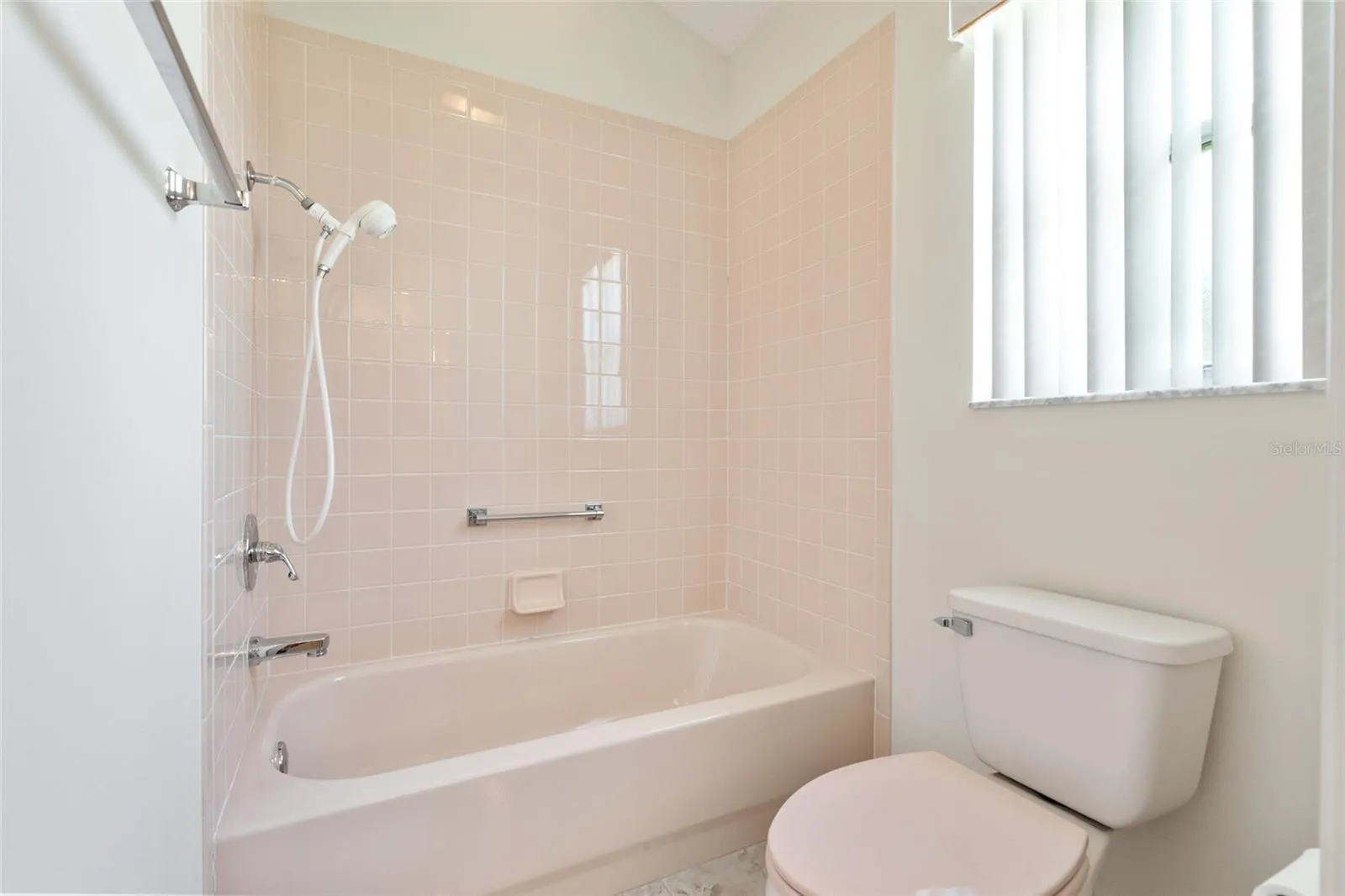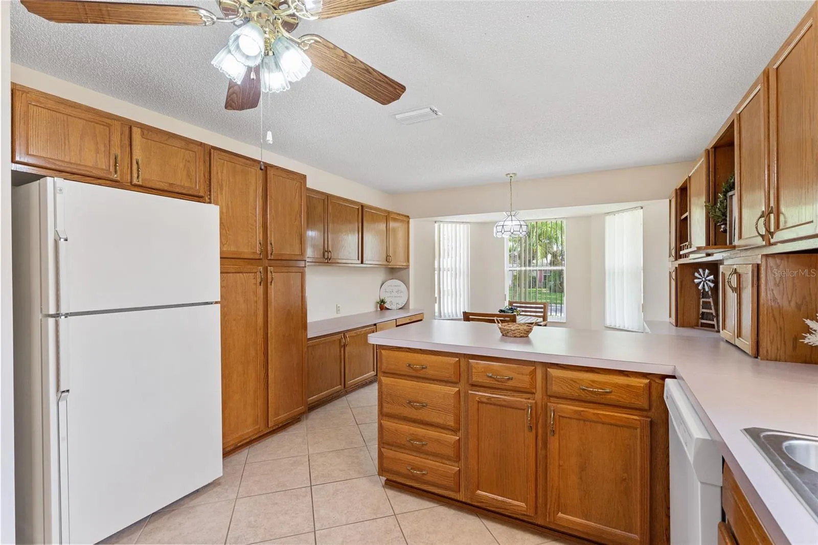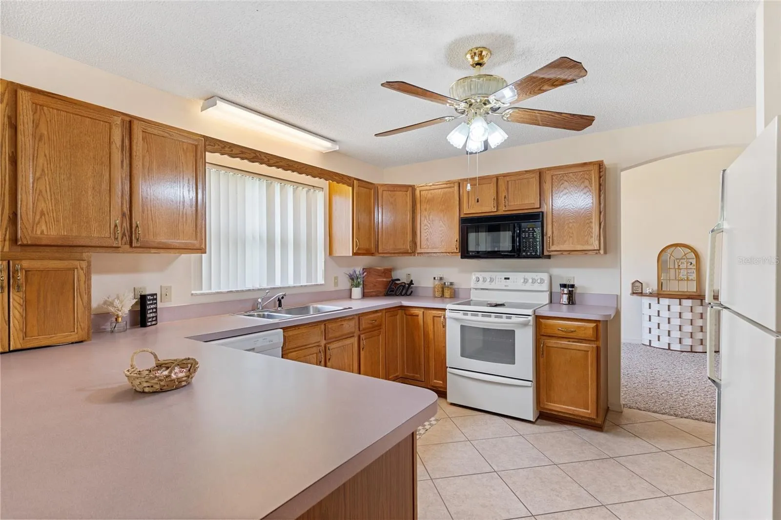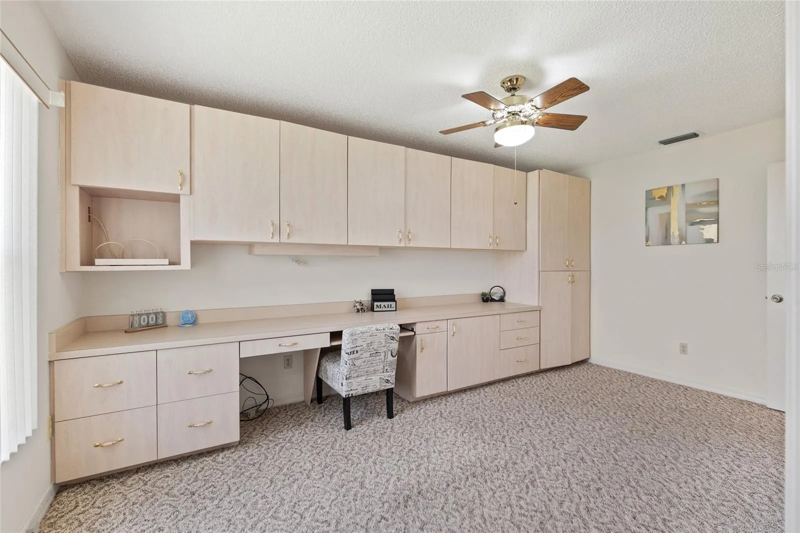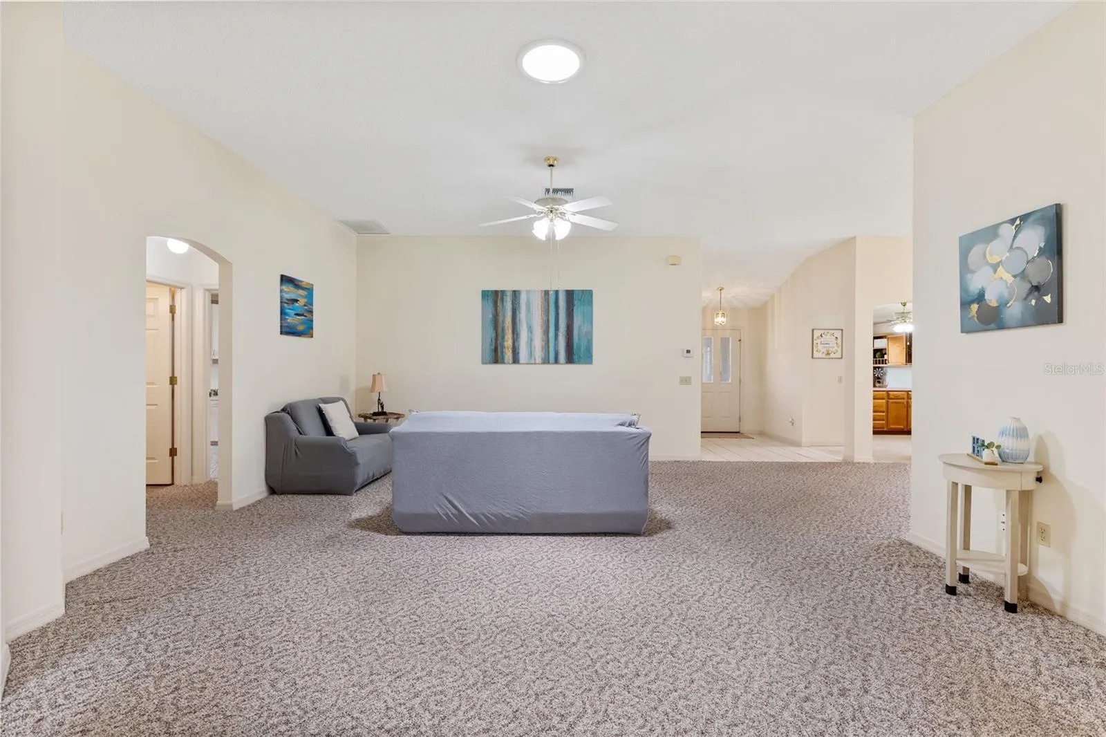 NO BOND, 2 MASTER SUITES, CORNER lot, and much more! This expanded BLOCK & STUCCO Vera Cruz Designer home features 3 bedrooms, 3 bathrooms, and a golf cart garage in the highly sought-after Village of De La Vista. As you approach this home, you’ll notice the pavered driveway and walkway, along with a QUAINT FRONT PORCH—perfect for relaxing and enjoying the fantastic Florida weather! Step inside the foyer to see a coat closet and tile flooring that extends throughout the kitchen and laundry room. The spacious kitchen features beautiful wood cabinetry, neutral-toned countertops, and a nook area with a bay window that brings in natural light. High ceilings in the expansive open-concept living and dining rooms create an airy atmosphere. The primary bedroom has vaulted ceilings, two walk-in closets, and an en-suite bathroom with wood cabinetry, double sinks, a makeup vanity, and a tub/shower combo. It features a split floor plan, accompanied by an additional primary suite that boasts vaulted ceilings, two walk-in closets, and an en-suite bathroom with similar features. The third bedroom includes built-in cabinets, a desk, and a walk-in closet, while the third bathroom is conveniently located nearby, making it ideal for guests or a quiet home office. The large interior laundry room offers shelving, a window that provides natural light, and extra space for a desk, an additional refrigerator/freezer, or extra storage shelves and cabinets.
