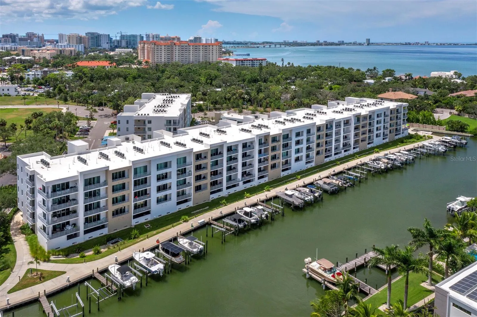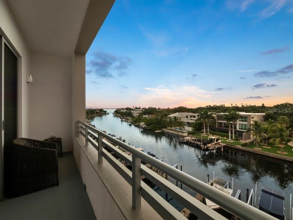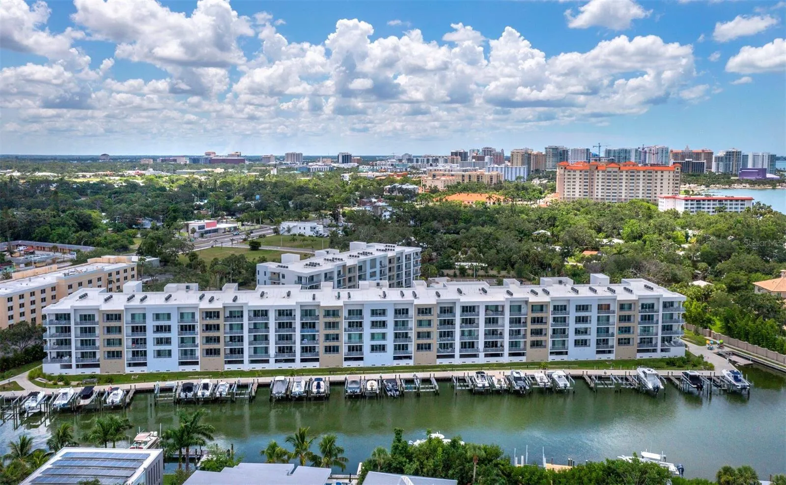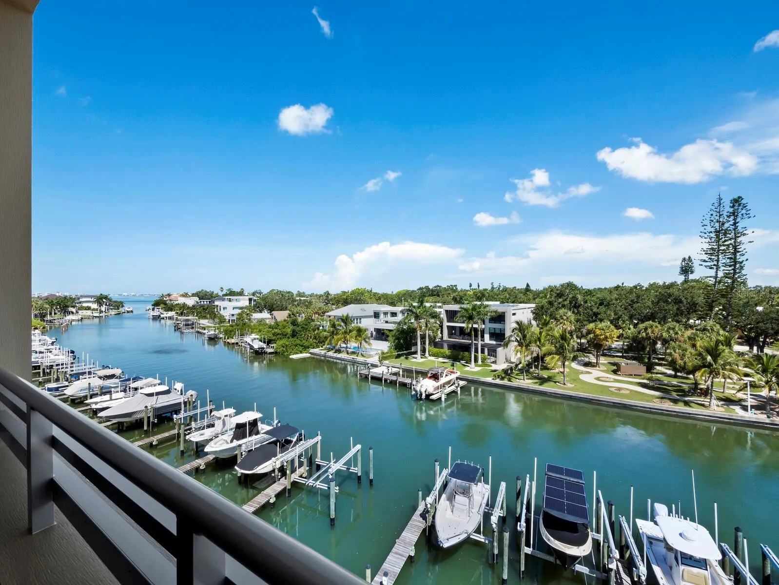 Experience waterfront luxury at The Strand of Sarasota. Rarely lived in and never rented, this Penthouse, newer (2022) turnkey-furnished home includes a deeded boat slip with a 10,000 pound Neptune lift with connected water and electricity, a fully equipped 2023 Scout 177 Sport flats fishing boat, and a kayak for one price. Direct boating access to Sarasota Bay and the Gulf of Mexico. Located on the fifth floor, the residence features two full bathrooms and a versatile den with barn doors, complete with a custom wall bed and California Closets built-ins easily utilized as a second bedroom. Unmatched upgrades throughout include luxury vinyl plank flooring, glossy cabinetry, quartz countertops, kitchen tile backsplash, Samsung appliances, flat-screen TV, and designer light fixtures from Herman Miller and West Elm. Nine-foot impact rated sliding glass doors fill the great room with natural light and open to a private terrace with stunning sunset views of the canal and Sarasota Bay. A floor-to-ceiling vertical cellular shade provides privacy when needed. The primary bedroom includes a spacious walk-in closet with custom built-ins by California Closets. The boat lift, installed using 10″ diameter wrapped pilings punched 10 feet deep and warrantied by Duncan Seawall, Dock and Boat Lift, ensures lasting quality and peace of mind. Residents of The Strand enjoy resort-style amenities including a heated swimming pool and spa, fitness center, gas fire pit and grills, EV charging stations, dog park, and kayak launch with storage. Just minutes from Sarasota vibrant arts, culture, dining, and the new bayfront entertainment area, The Strand offers an ideal setting for a full-time residence, vacation getaway, or investment property, with weekly rentals permitted.