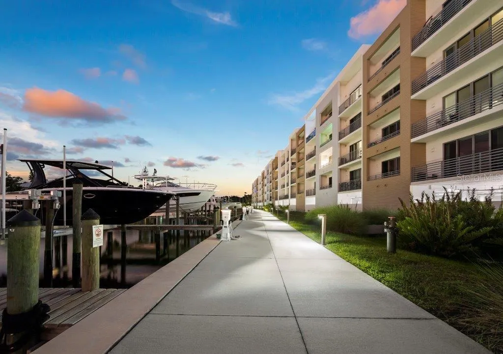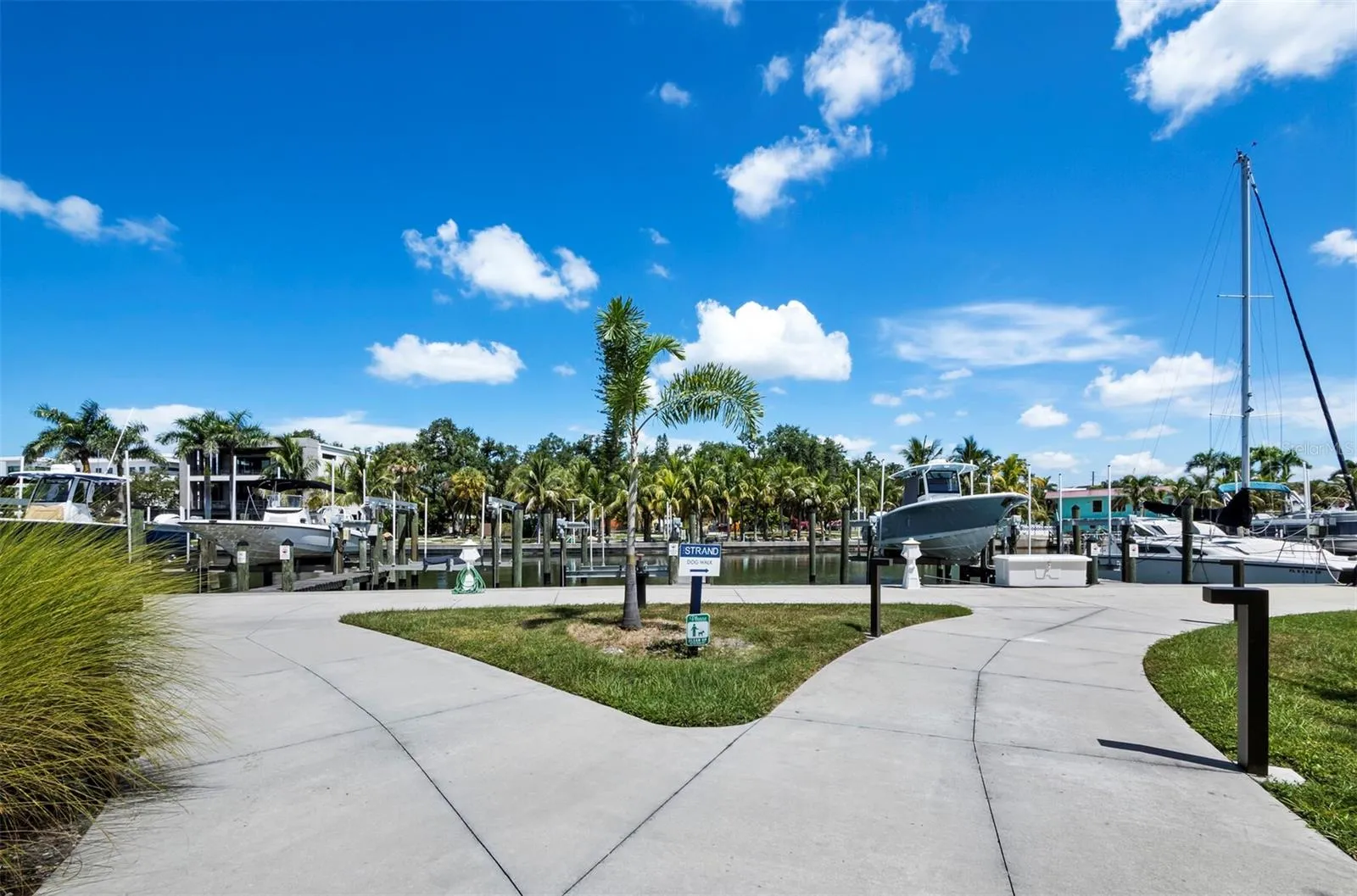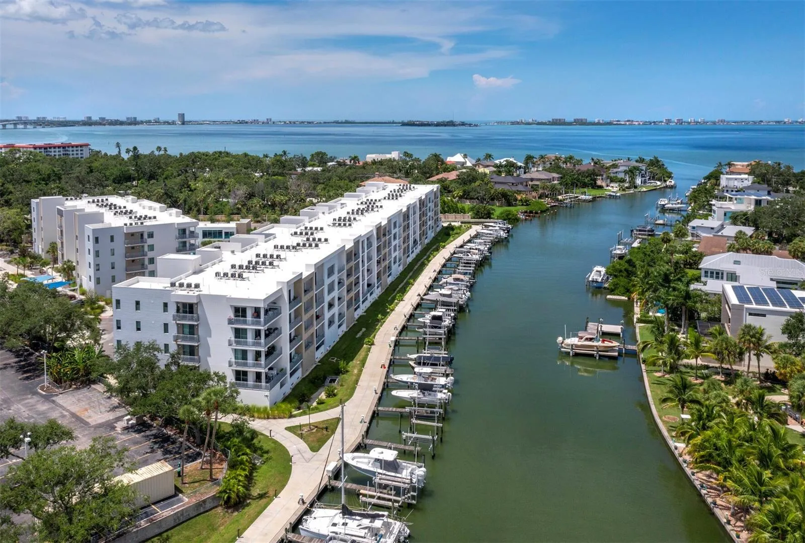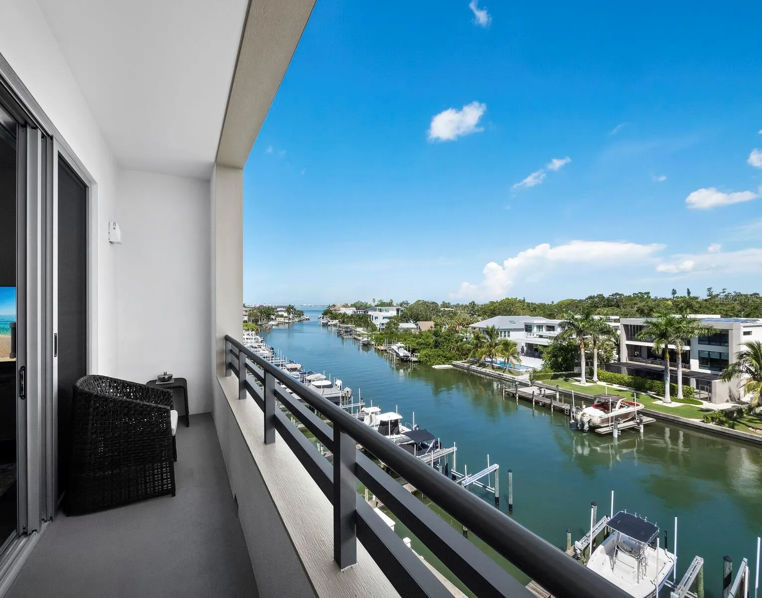 Experience waterfront luxury at The Strand of Sarasota. Rarely lived in and never rented, this Penthouse, newer (2022) turnkey-furnished home includes a deeded boat slip with a 10,000 pound Neptune lift with connected water and electricity, a fully equipped 2023 Scout 177 Sport flats fishing boat, and a kayak for one price. Direct boating access to Sarasota Bay and the Gulf of Mexico. Located on the fifth floor, the residence features two full bathrooms and a versatile den with barn doors, complete with a custom wall bed and California Closets built-ins easily utilized as a second bedroom. Unmatched upgrades throughout include luxury vinyl plank flooring, glossy cabinetry, quartz countertops, kitchen tile backsplash, Samsung appliances, flat-screen TV, and designer light fixtures from Herman Miller and West Elm. Nine-foot impact rated sliding glass doors fill the great room with natural light and open to a private terrace with stunning sunset views of the canal and Sarasota Bay. A floor-to-ceiling vertical cellular shade provides privacy when needed. The primary bedroom includes a spacious walk-in closet with custom built-ins by California Closets. The boat lift, installed using 10″ diameter wrapped pilings punched 10 feet deep and warrantied by Duncan Seawall, Dock and Boat Lift, ensures lasting quality and peace of mind. Residents of The Strand enjoy resort-style amenities including a heated swimming pool and spa, fitness center, gas fire pit and grills, EV charging stations, dog park, and kayak launch with storage. Just minutes from Sarasota vibrant arts, culture, dining, and the new bayfront entertainment area, The Strand offers an ideal setting for a full-time residence, vacation getaway, or investment property, with weekly rentals permitted.