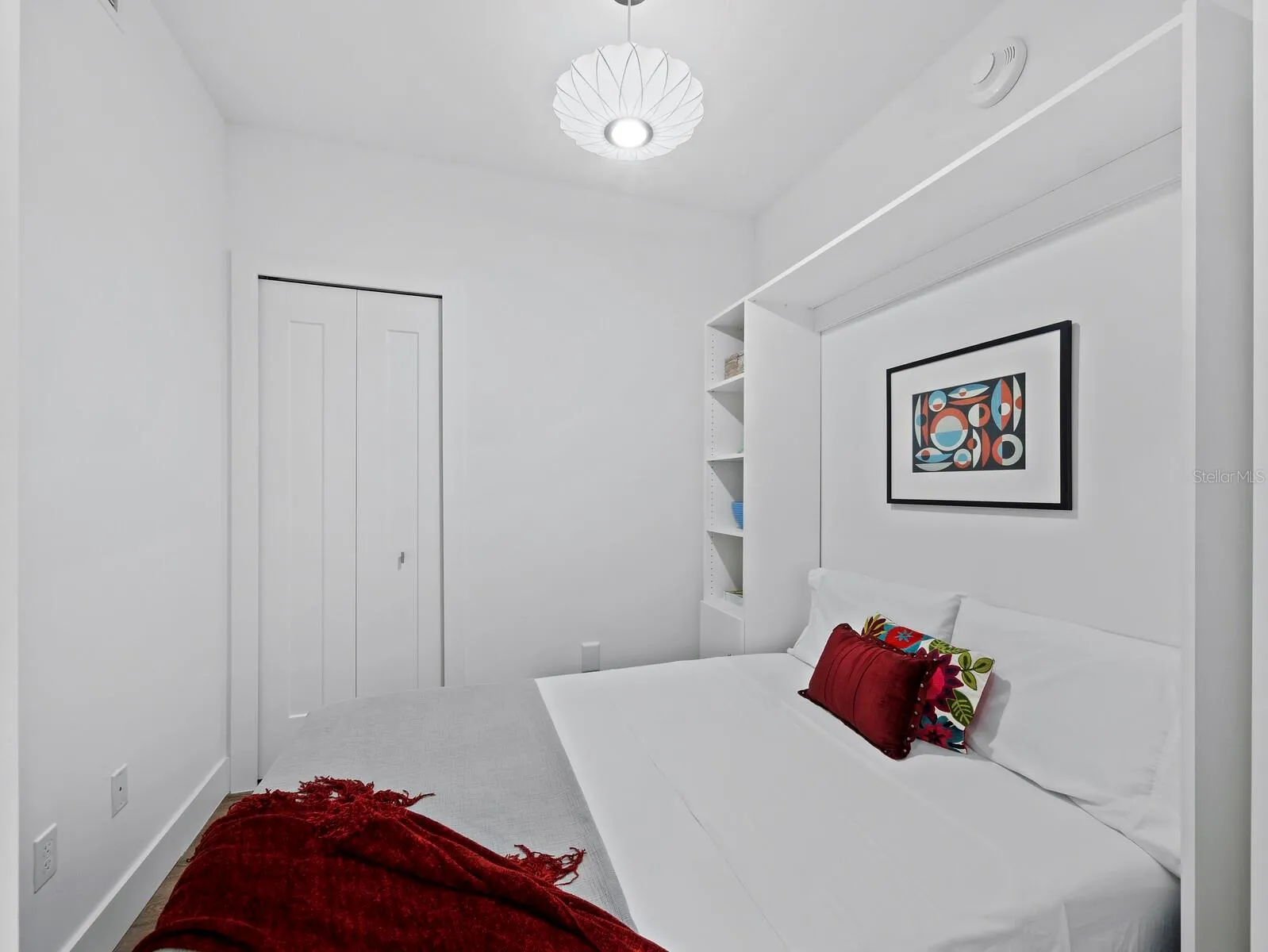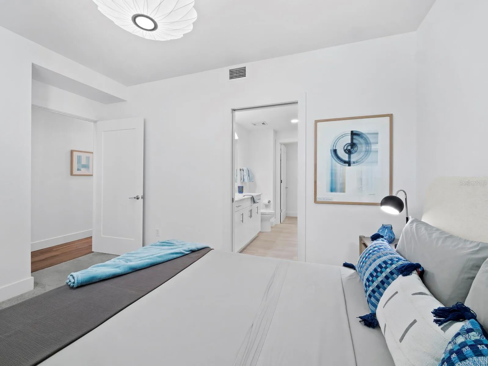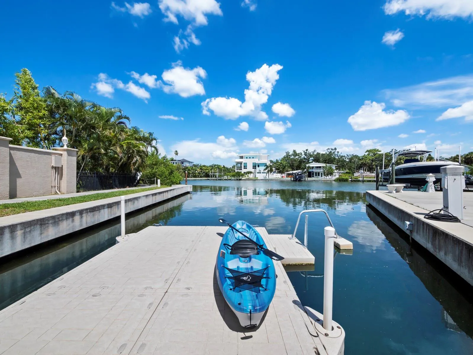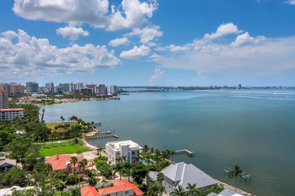 Experience waterfront luxury at The Strand of Sarasota. Rarely lived in and never rented, this Penthouse, newer (2022) turnkey-furnished home includes a deeded boat slip with a 10,000 pound Neptune lift with connected water and electricity, a fully equipped 2023 Scout 177 Sport flats fishing boat, and a kayak for one price. Direct boating access to Sarasota Bay and the Gulf of Mexico. Located on the fifth floor, the residence features two full bathrooms and a versatile den with barn doors, complete with a custom wall bed and California Closets built-ins easily utilized as a second bedroom. Unmatched upgrades throughout include luxury vinyl plank flooring, glossy cabinetry, quartz countertops, kitchen tile backsplash, Samsung appliances, flat-screen TV, and designer light fixtures from Herman Miller and West Elm. Nine-foot impact rated sliding glass doors fill the great room with natural light and open to a private terrace with stunning sunset views of the canal and Sarasota Bay. A floor-to-ceiling vertical cellular shade provides privacy when needed. The primary bedroom includes a spacious walk-in closet with custom built-ins by California Closets. The boat lift, installed using 10″ diameter wrapped pilings punched 10 feet deep and warrantied by Duncan Seawall, Dock and Boat Lift, ensures lasting quality and peace of mind. Residents of The Strand enjoy resort-style amenities including a heated swimming pool and spa, fitness center, gas fire pit and grills, EV charging stations, dog park, and kayak launch with storage. Just minutes from Sarasota vibrant arts, culture, dining, and the new bayfront entertainment area, The Strand offers an ideal setting for a full-time residence, vacation getaway, or investment property, with weekly rentals permitted.