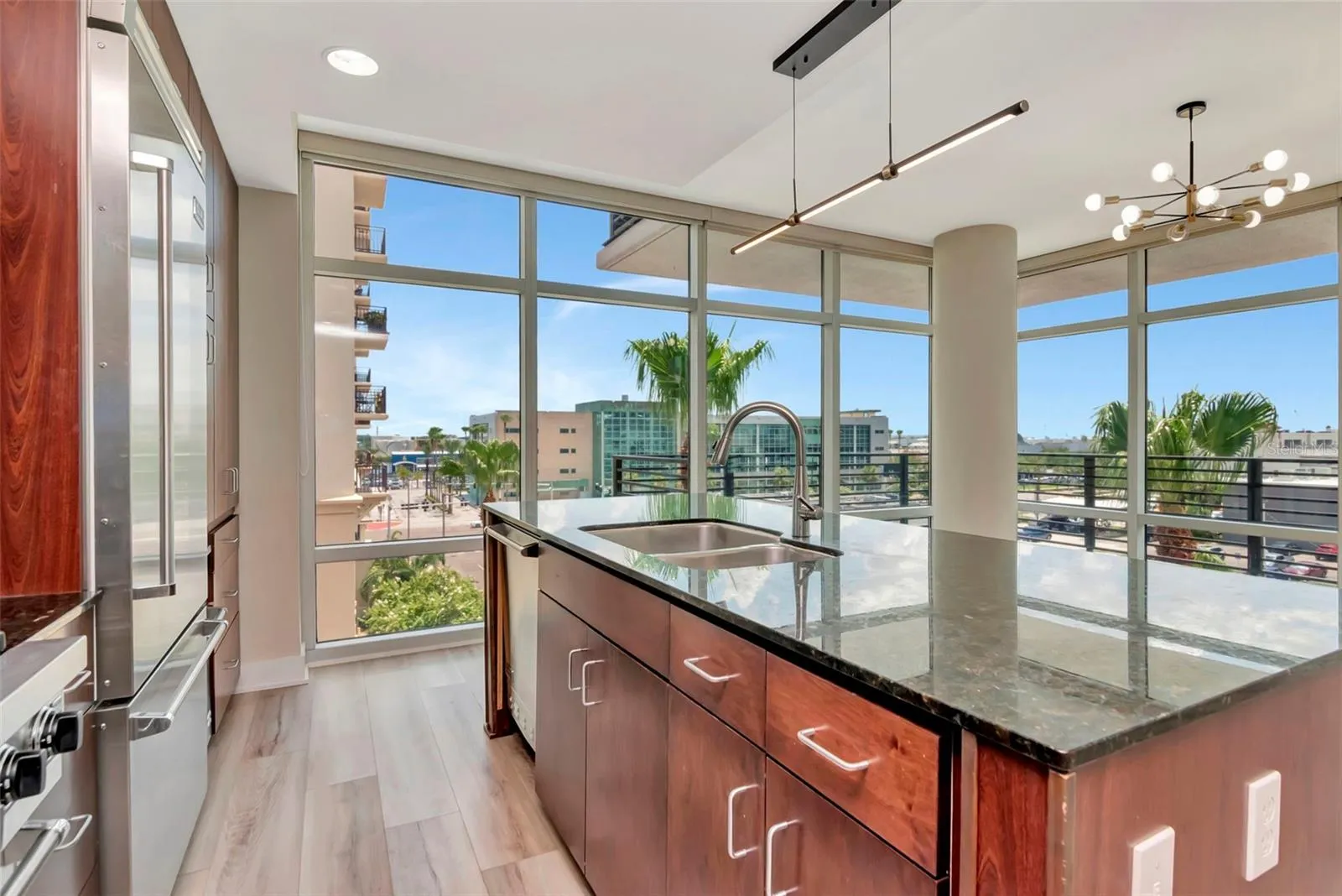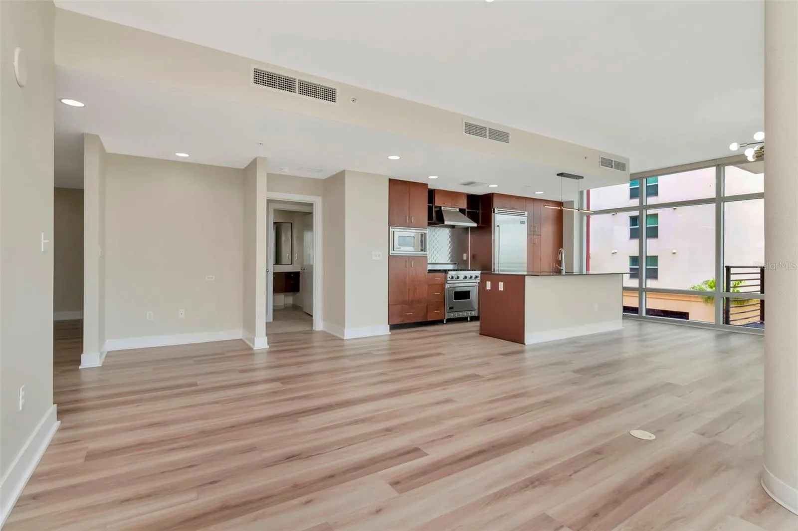 Fantastic 4th Floor rare corner Bronze Floorplan home with massive wrap-around balcony and tons of floor-to-ceiling glass windows with panoramic views of Channel District, Water Street, and Downtown Tampa Skyline. INCLUDES TWO RESERVED PARKING SPACES. and large windows spanning great views of the Channel District and surrounding neighborhood. The home has professional-grade, Viking appliances in stainless steel and includes a gas range/oven, built-in refrigerator with bottom-freezer, wine fridge, dishwasher, and microwave nestled in beautiful granite countertops perfect for the aspiring home chef! Large wood cabinets provide plenty of storage, and the massive island is perfect for entertaining. Spacious dining room area opens up to the living room and office nook. The building has 24-hour security, mailroom, and a dedicated Concierge service available. The West Building’s 9th floor has a fully stocked fitness center that rivals any professional gym, a dog-walk path, and a full-size pool with large lounging decks, and an outdoor kitchen area with gas grills, and even a heated spa. The East Building has the package delivery lockers for easy package pickup, UPS drop-off, and another pool and spa, and a Conference/Event Center on the 9th floor that can be rented inexpensively for your celebrations. The million-dollar renovation of the ground-level courtyard boasts several areas for watching your favorite sports teams while spending time with friends and neighbors. It is a hub of activity for the Channel District residents right in your building! Great retail and restaurants are right here! District Dry Cleaners includes custom tailoring services, relax at Massage Envy, homemade Italian Gelato Shop, Crunch Gym, The Poke Company, good food and drink at City Dog Cantina, and our own Pour House Brewery. But there’s more – there is a CVS, an Irish Pub, pickleball at the Madison Street Park, two dog parks, putting green, and shuffleboard. At Grand Central condominiums, the Rent is comprehensive and includes water, sewer, trash, hot water, cold air, gas, grounds maintenance/landscaping, building/exterior insurance, concierge, 24/7 on-site security, escrowed reserves, pool, spa, and amenities. All that’s left is the electricity which is at a minimum because your big users of energy (oven, range, and dryer) are powered by gas, hot water is provided by a boiler room (so no electricity for the water heater), and cold air is provided by a water chiller system on the roof, all you pay for is the interior blower. It is easier to maintain over time in comparison to wood or block and stucco construction. It is good for sound absorption, as well as fire resistance, and structures with pre-cast concrete are subject to lower insurance because of strength and the ability to withstand fire and wind. Pre-cast panels are great at energy insulation. Grand Central is the only condominium community in Channelside built with pre-cast concrete. Double Pane, UV Resistant, High Efficiency Windows further prevent noise and enhance temperature control.