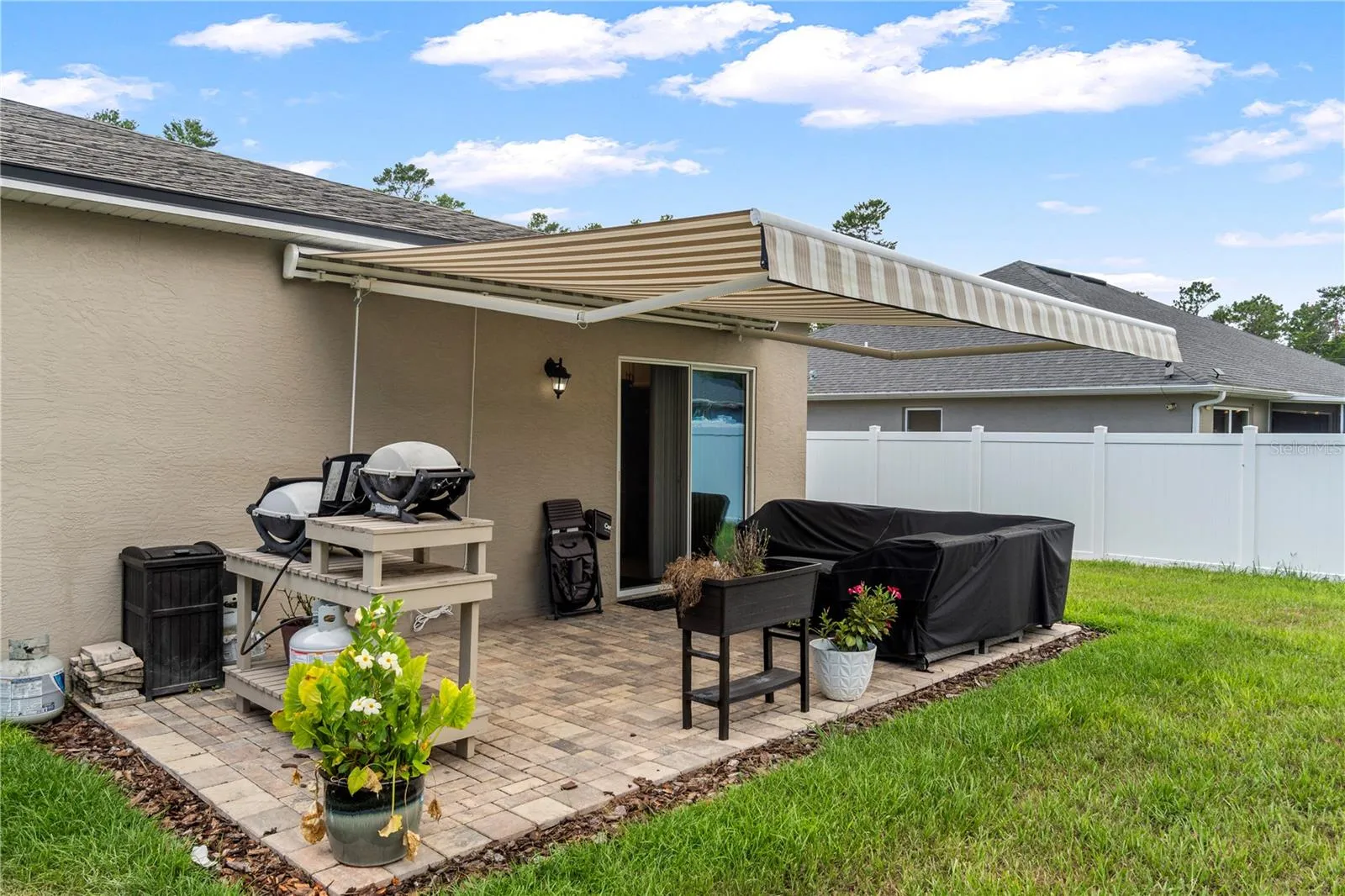 The owner has thoughtfully enhanced the outdoor living experience with a remote-controlled retractable awning on the back porch, complete with lighting, creating an ideal setting for gatherings and relaxation. The property is nicely landscaped, offering a serene and inviting atmosphere.