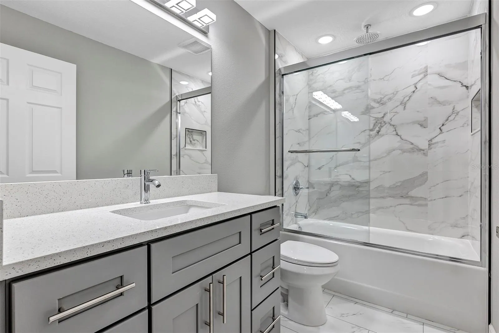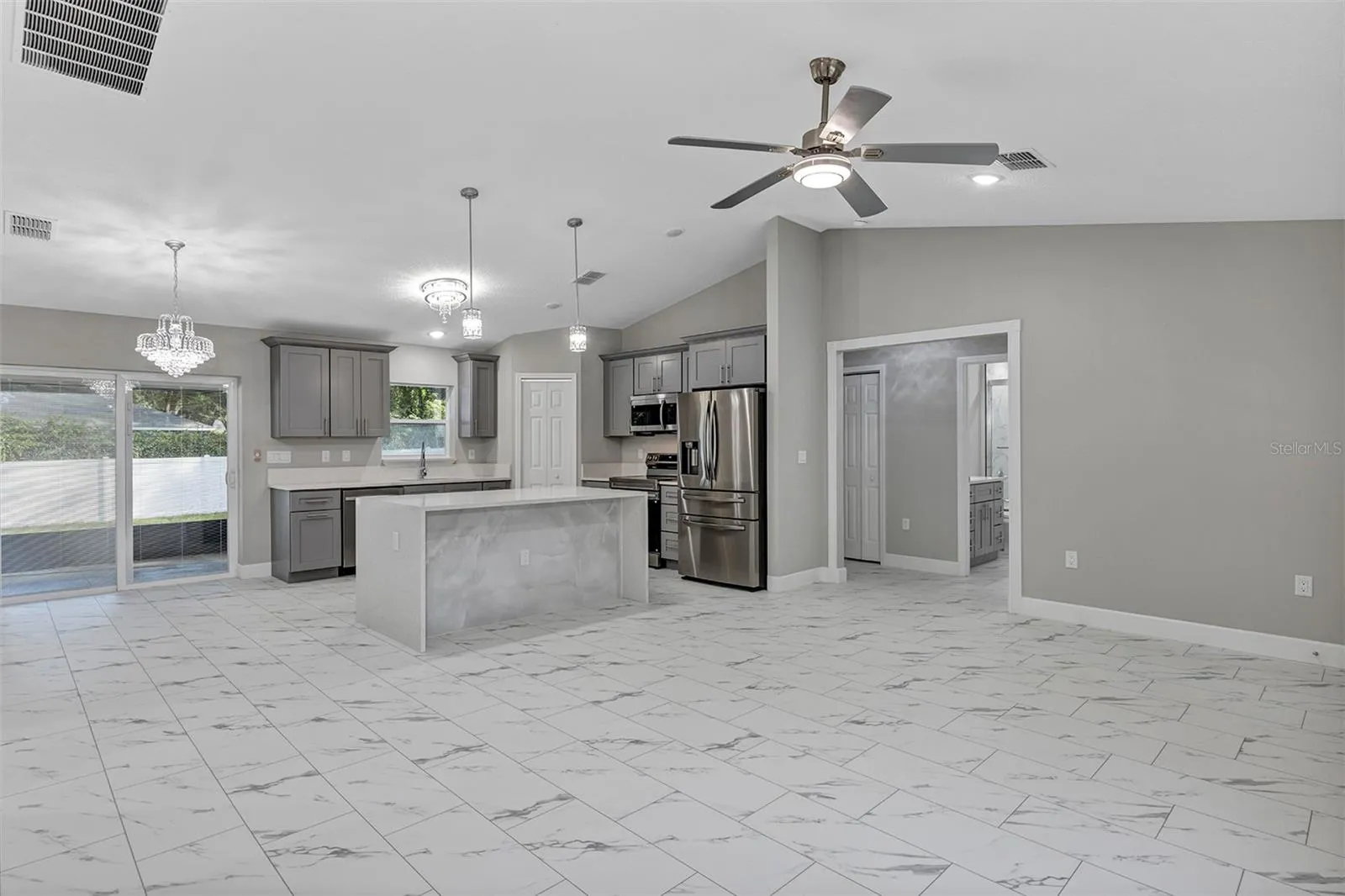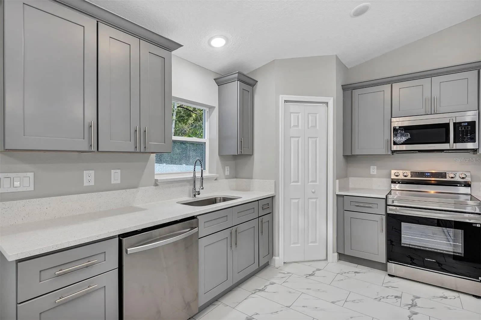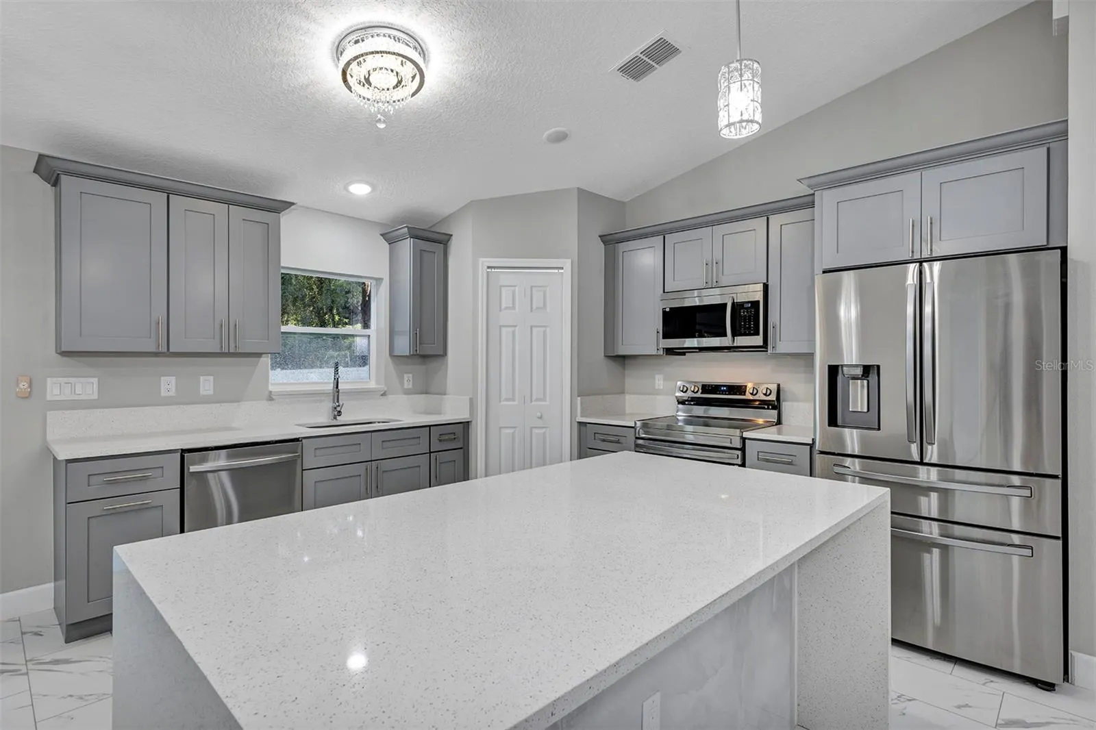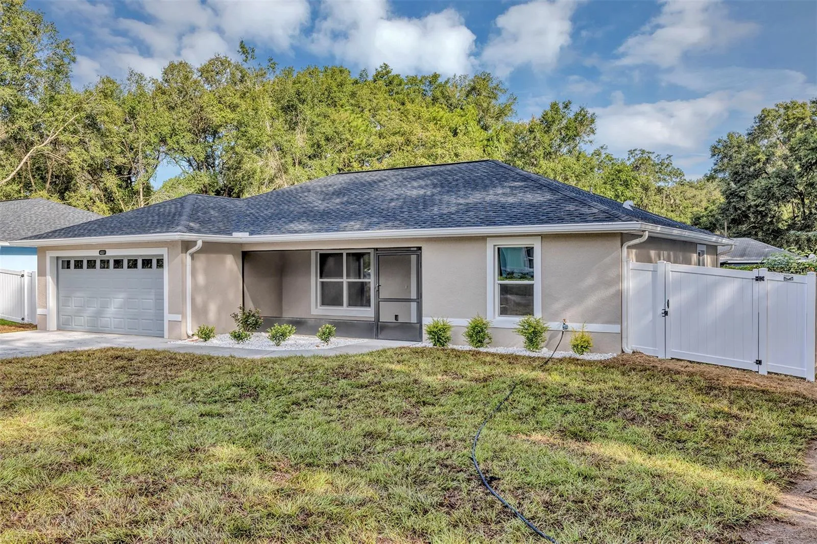 New construction, Move in Ready!!This Beautiful 3 bedroom, 2 bath, 2 car garage home was built to the highest of standards to include luxury vinyl plank flooring, Gourmet kitchen equipped with top-of-the-line Samsung appliances, top soft-close cabinets with crown molding, quartz counter tops and a sleek waterfall island, perfect for food preparation and entertaining, ceiling fans and inside laundry. This home has Modern light fixtures, quartz counters in all bathrooms, double sink in master with beautiful tile not to mention additional soft close drawers in master bath. The front entry is stunning with a modern front door, screened porch, beautiful landscaping plus rain gutters. Enjoy the beautiful Florida weather on the covered and screened back porch overlooking the fully fenced backyard!! The garage is epoxy coated and a 20-foot wide driveway these are just another of the builder’s personal touches to make your home complete and ready for your family to move in. NO HOA, Great location nearby shopping, dining, medical centers, Full one year builder warranty with an extended 2-10 warranty provided at closing. Come see this one, we know you will be impressed and get your offer in as it will sell quickly.