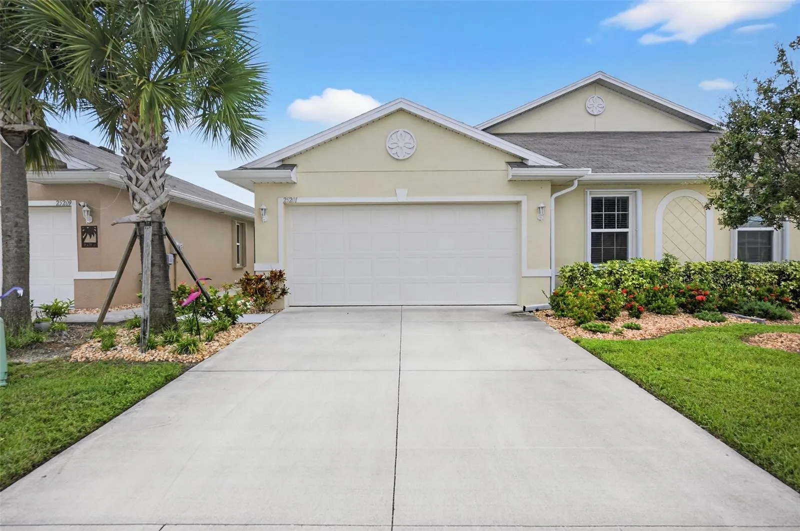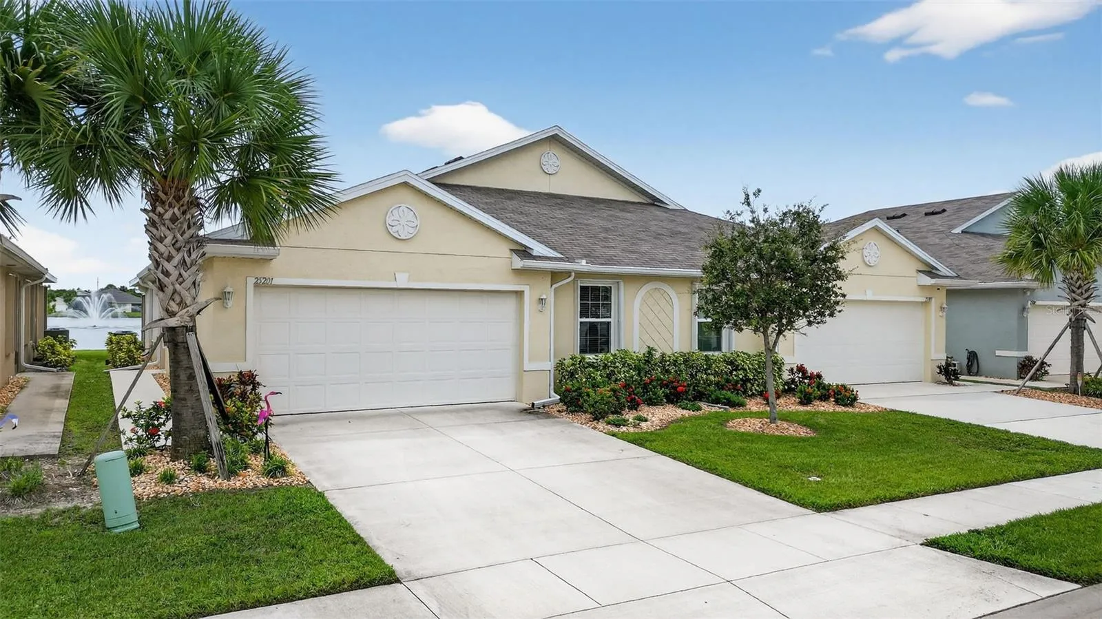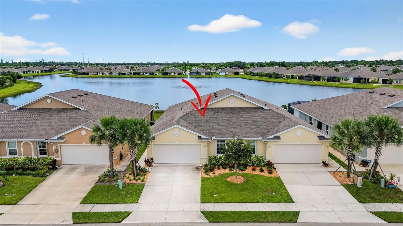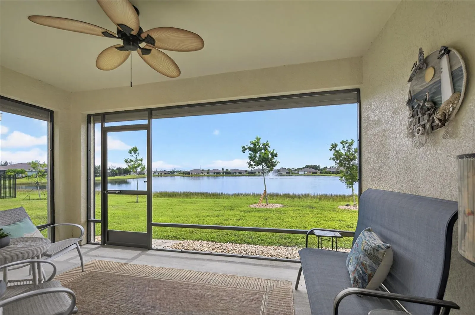 Waterfront Villa!! Delightful Waterford Estates Villa built in 2022, 2 bedroom 2 bath plus a den, fully furnished turn-key home offers perfect blend of comfort and convenience while enjoying the Southwest Florida Lifestyle. The split-bedroom floor plan ensures privacy while the open-concept kitchen featuring quartz countertops, stainless steel appliances, abundant shaker style cabinetry, and a casual eat-in kitchen counter- ideal for entertaining or everyday living. Enjoy peaceful mornings or relaxed evenings on the screened in lanai overlooking tranquil lake and fountain views. Inside, the home boasts tile flooring throughout the main living areas with the carpeted bedrooms for added comfort. The den offers flexible space perfect for home office, reading room, or guest space with French Doors. Couches are pull out sleeper sofas. So many added highlights include: 2 car garage, accordion and newly installed roll down hurricane shutters on Lanai, separate laundry room, lots of room for storage. Located in a gated community with with resort style amenities, including 2 pools, a clubhouse, billiard room, fitness room, card room, lounge area, shuffleboard, pickleball. Move right in-this home is being sold fully furnished. Property is located in the vibrant city of Punta Gorda, within close proximity to restaurants, Fisherman’s Village and cultural events.