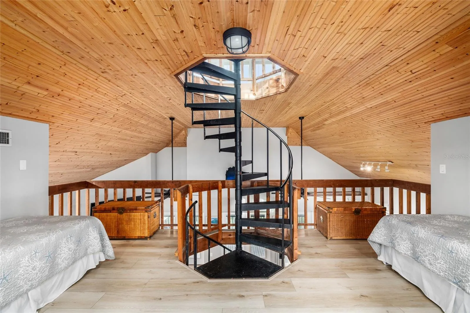 This beautiful home is one of the iconic twin bayfront homes on Little Gasparilla Island, a bridgeless barrier island off the Cape Haze peninsula. A 10-minute boat ride brings you to the new shared boat dock with 10,000# boat lift. The home was updated in 2023, including a new roof, and comes furnished. On the first floor there are 2 bedrooms, 2 bathrooms, living room, kitchen, and laundry closet. The living room and kitchen are open and spacious with vaulted wood ceilings and three sets of French doors on the front of the house that lead out to the large screened in front porch that overlooks Placida Harbor. From there you can sit and watch the sunrise, see the boats go by, the dolphins and manatees swimming, and the birds diving for fish. In the living room there is an electric fireplace with a modern design. The updated kitchen has new soft close cabinets, glass tile backsplash, under counter lighting, stainless steel appliances, quarts countertops, and a large island with seating. Both bathrooms have new vanities with quarts counter tops, and new tile around the shower and tub. Both bedrooms have French doors that lead out to the covered, wrap-around deck. All the windows and doors are impact glass. The stackable, front load, washer and dryer are cleverly hidden behind a barndoor in the hall between the two bedrooms. Up the spiral staircase leads you to the loft, that is being used as a bedroom, with vaulted wood ceilings and a cozy nook that could be used as an office or reading space, and then further up the staircase you come to the 11’ x 21’ cupola that has shiplap walls, wood ceiling, and stunning views of the bay and the island and is also being used as a bedroom. The lot behind the home, which is almost 2 acres in size, is also for sale MLS #D6143898 and is where the shared septic system is located. The lot will need to be purchased with the home. Little Gasparilla Island doesn’t have any grocery stores, restaurants, or shops but we have 3 ½ miles of uncrowded beach to wander on and collect seashells and shark’s teeth, swim, or sit with a good book and soak up the sun. There is great fishing in the surrounding waters for redfish, snook, snapper, trout and more. By water there are many wonderful restaurants to cruise to. Then at the end of the day meet your friendly neighbors at the water’s edge to watch the sun set on another blissful day in paradise. Come and see this lovely home and find out what it’s like to live on island time.