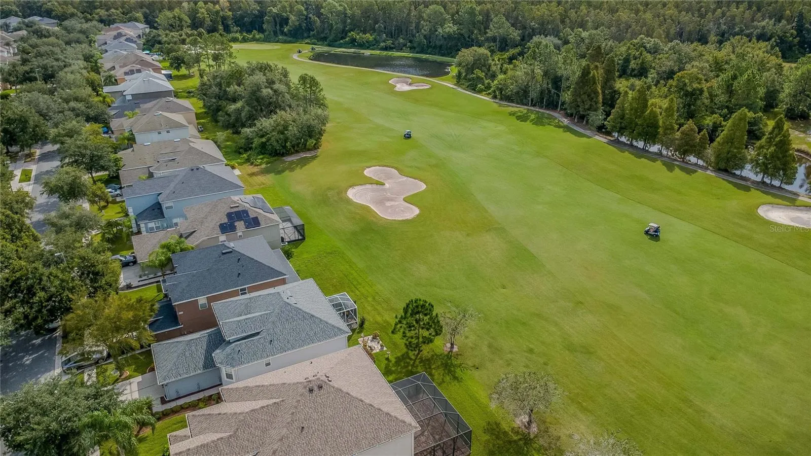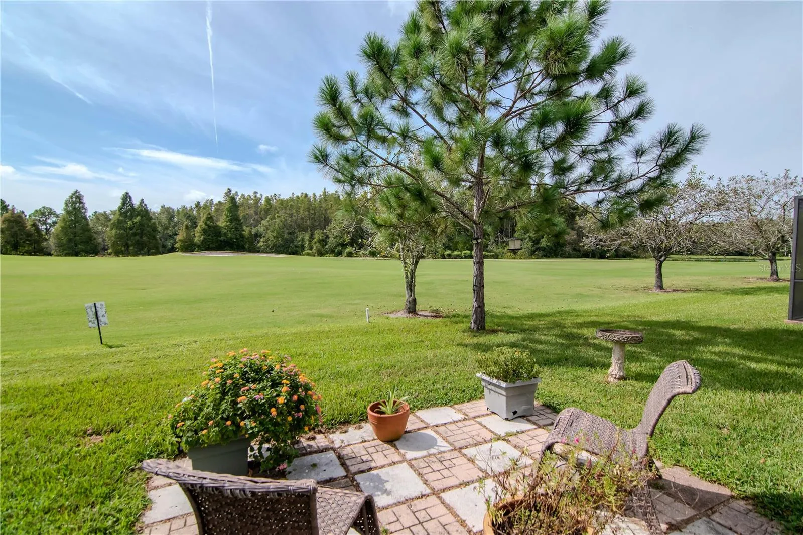 The open floor plan features laminate flooring throughout the main living areas, offering a bright and inviting flow. The fully renovated kitchen boasts updated cabinets, granite countertops, stainless steel appliances, and a decorative stone backsplash. A sunlit dinette with bay windows provides the perfect spot for casual meals, while the spacious dining and living areas allow for gatherings. A full bathroom on the main level adds convenience for guests. Step through French doors from the family room to a spacious screened-in patio overlooking the fairway — perfect for morning coffee or evening entertaining.