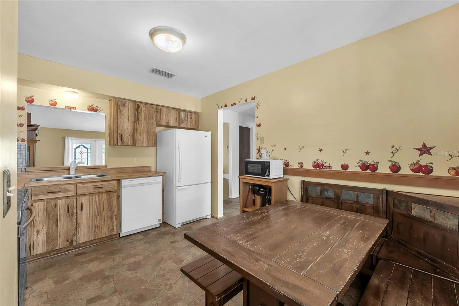 Step onto the welcoming front porch and into a thoughtfully designed home. The kitchen, located at the front of the house, features an efficient work triangle layout, a closet pantry for added storage, and a breakfast nook with table—included for the new owners. A convenient pass-through counter connects the kitchen to the spacious living room, making entertaining easy.