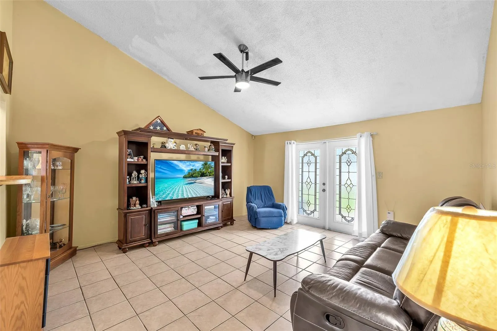 The living room boasts a cathedral ceiling and beautiful leaded glass French doors that allow abundant natural light to fill the space. The primary bedroom includes an en-suite bath with a walk-in shower, offering both privacy and functionality. 2 additional bedrooms and a guest bathroom with a tub/shower combination round out the tour of this home.